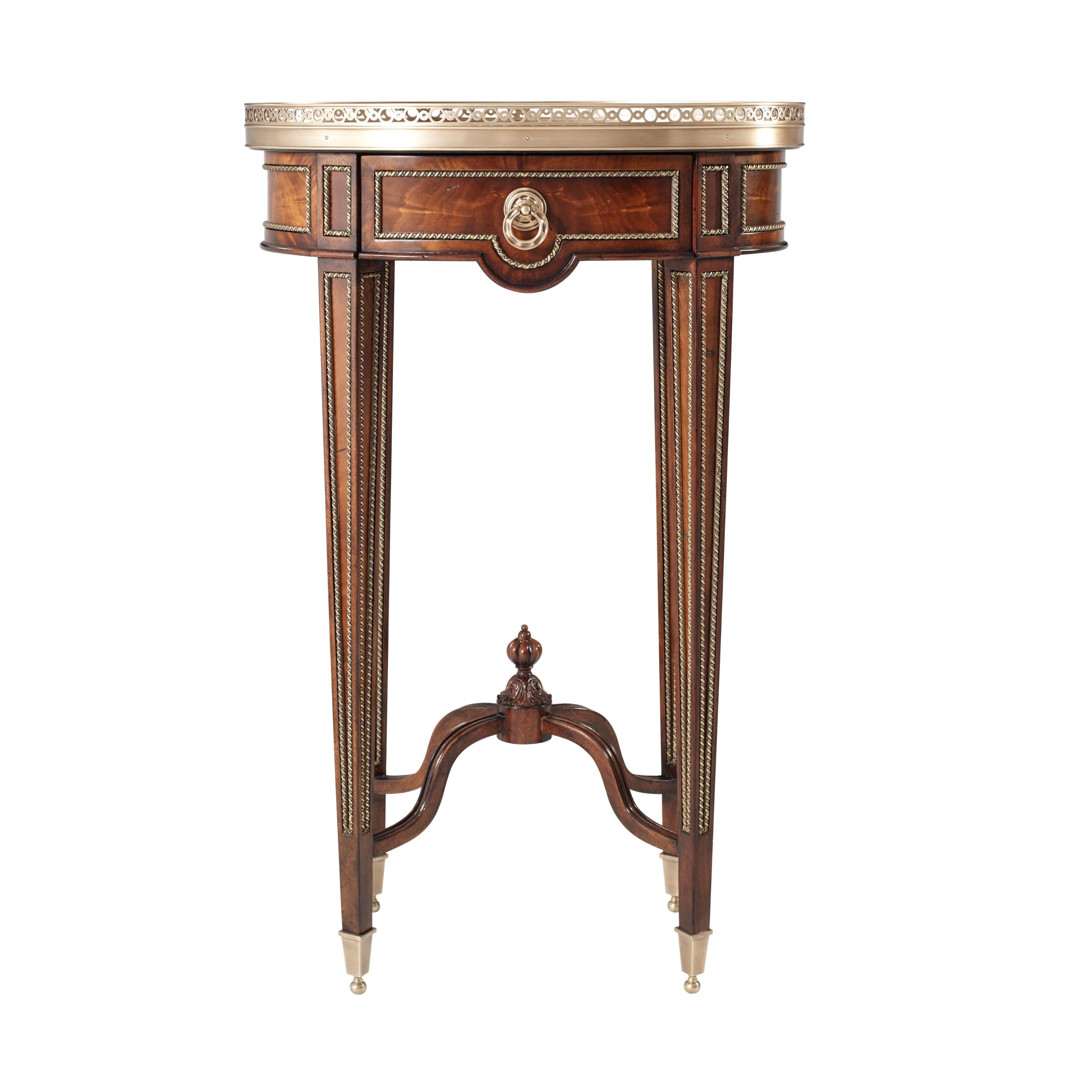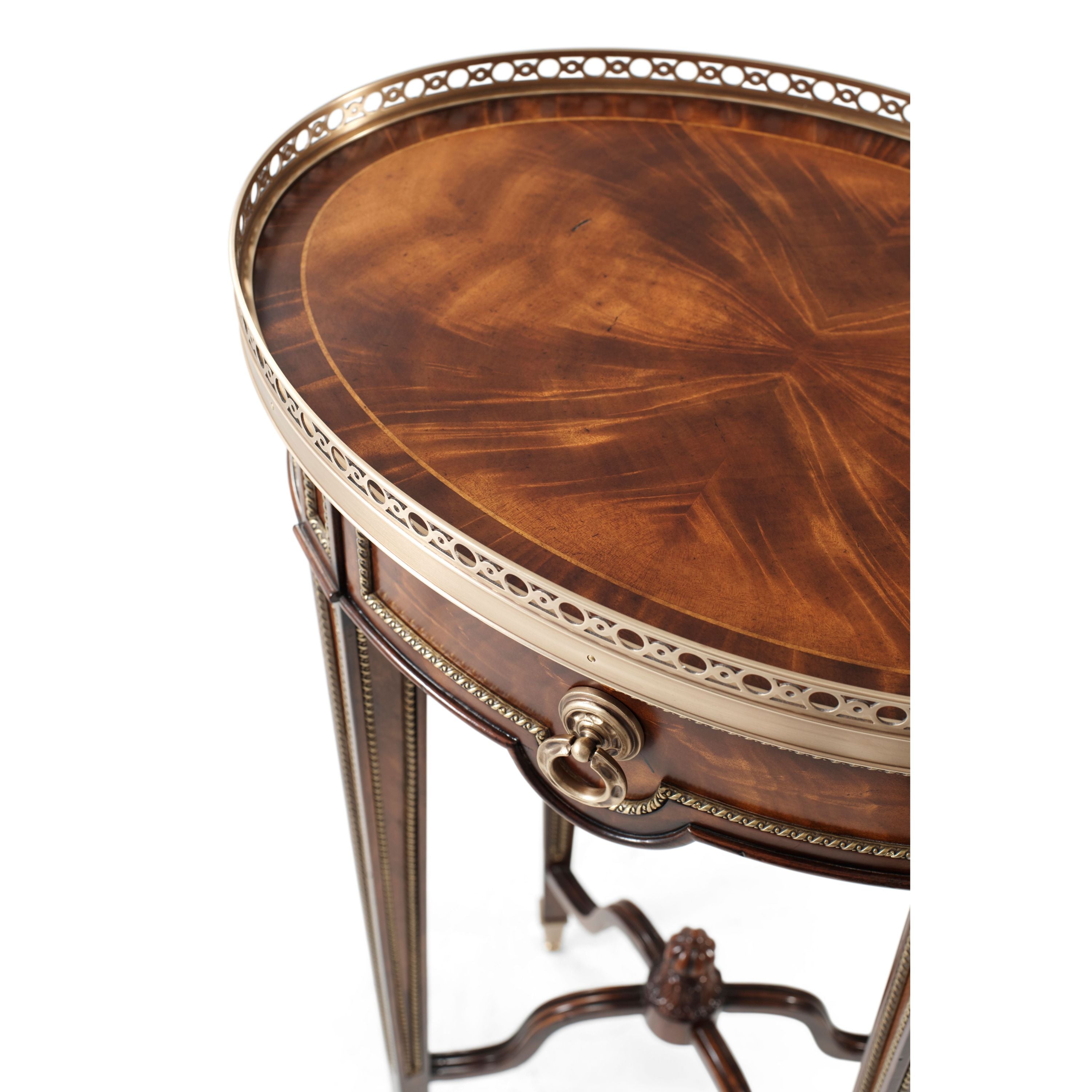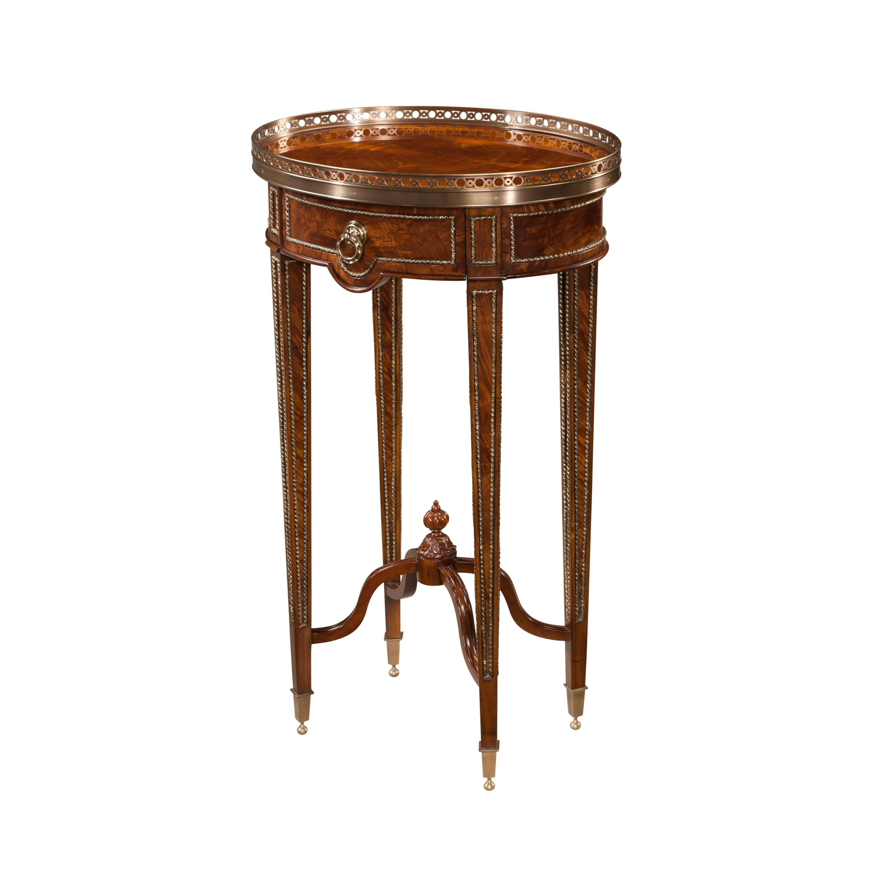 طاولة مصباح مصنوعة من خشب الماهوجني ومغطاة بقشرة من اللهب مع حوامل من النحاس الفاخر، والجزء العلوي البيضاوي المزخرف بالنحاس فوق درج إفريز على أرجل مربعة الشكل مدببة مع أغطية من النحاس متصلة بواسطة نقالة على شكل "X".