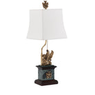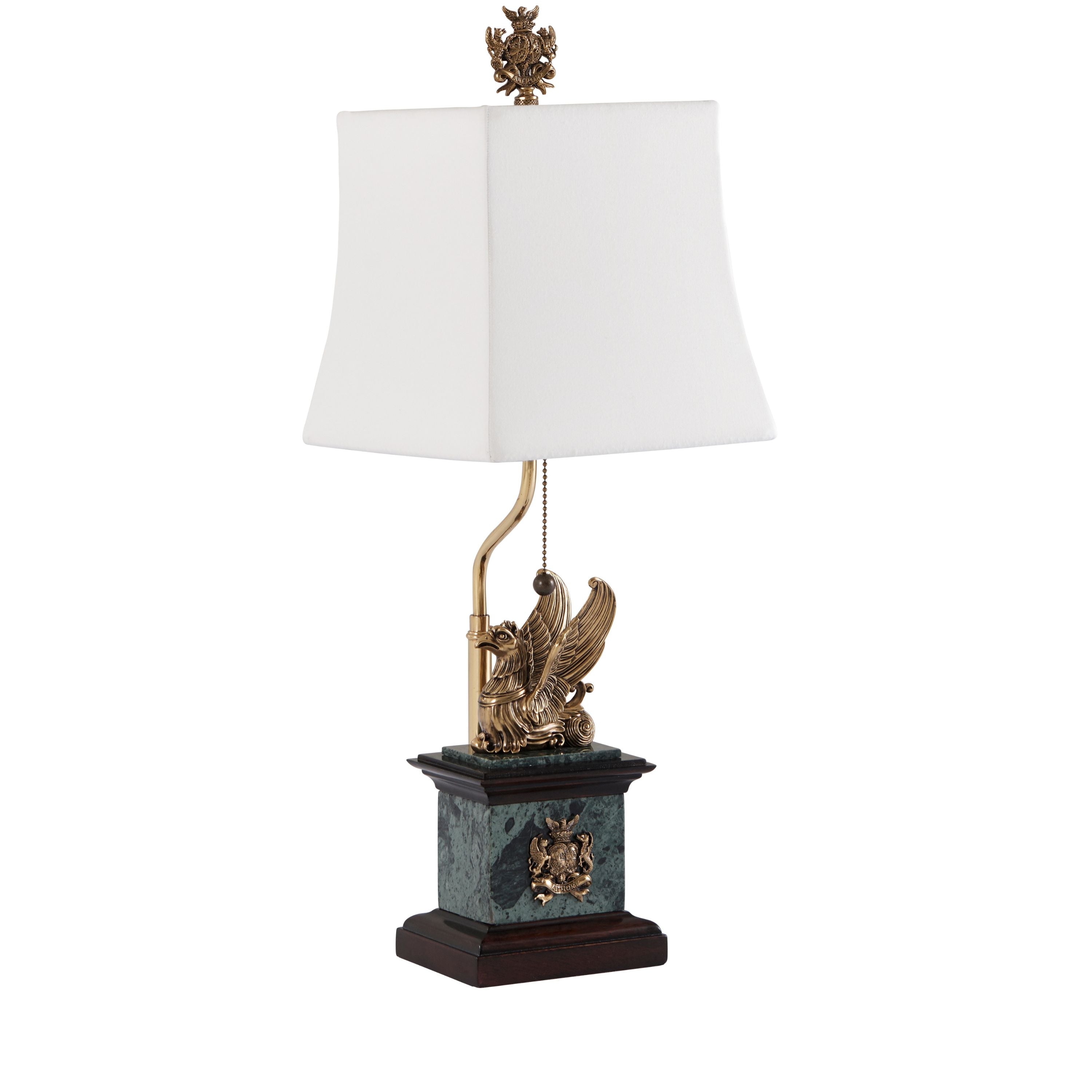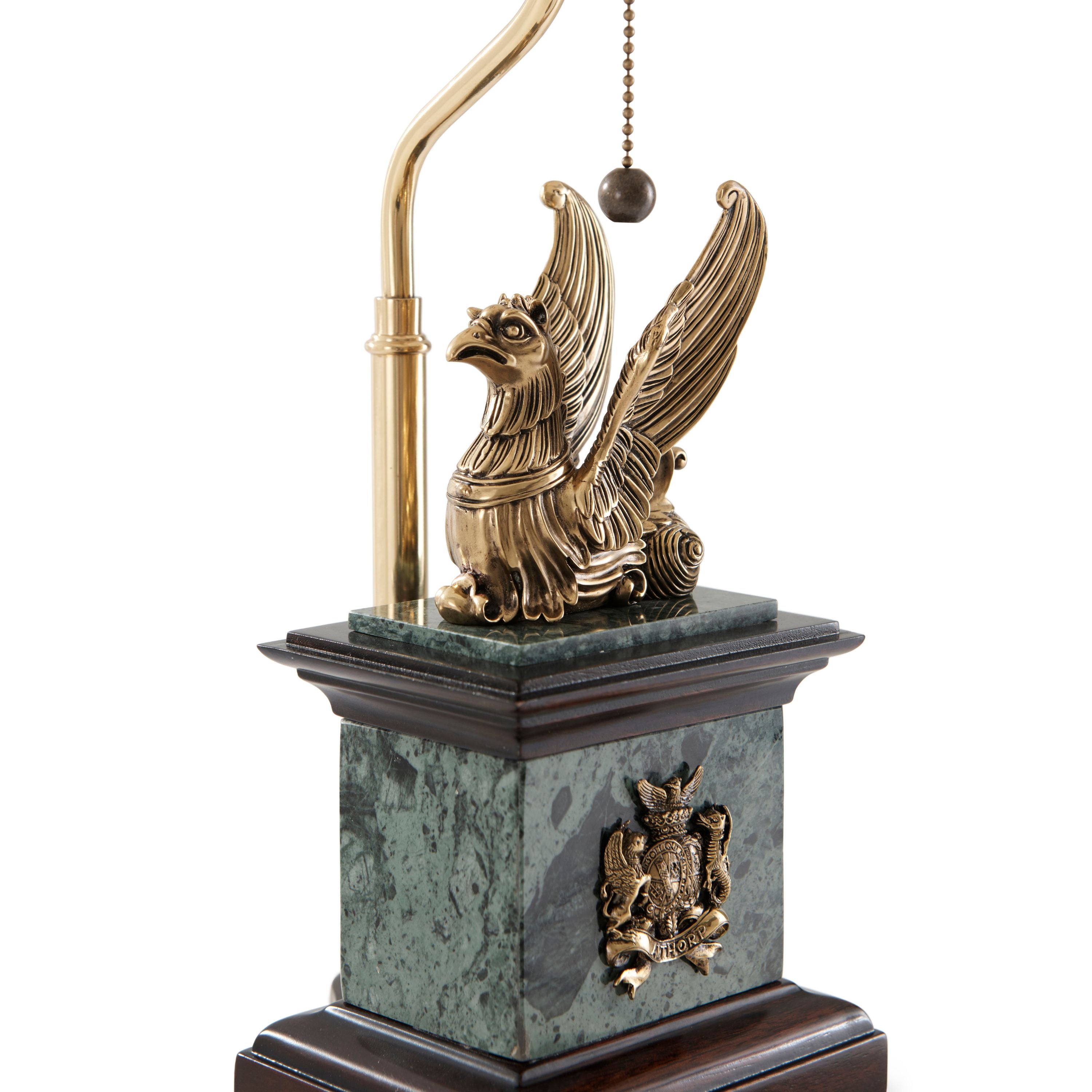 مصباح طاولة مصنوع من النحاس المصبوب بشكل جيد وخشب الماهوجني، مع ألواح حجرية خضراء مرقطة وقواعد من خشب الماهوجني مزينة بشعار سبنسر، ويعلوه جريفين جالس وغطاء معبد، والغطاء مزين بزخرفة شعار سبنسر الجميلة.