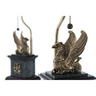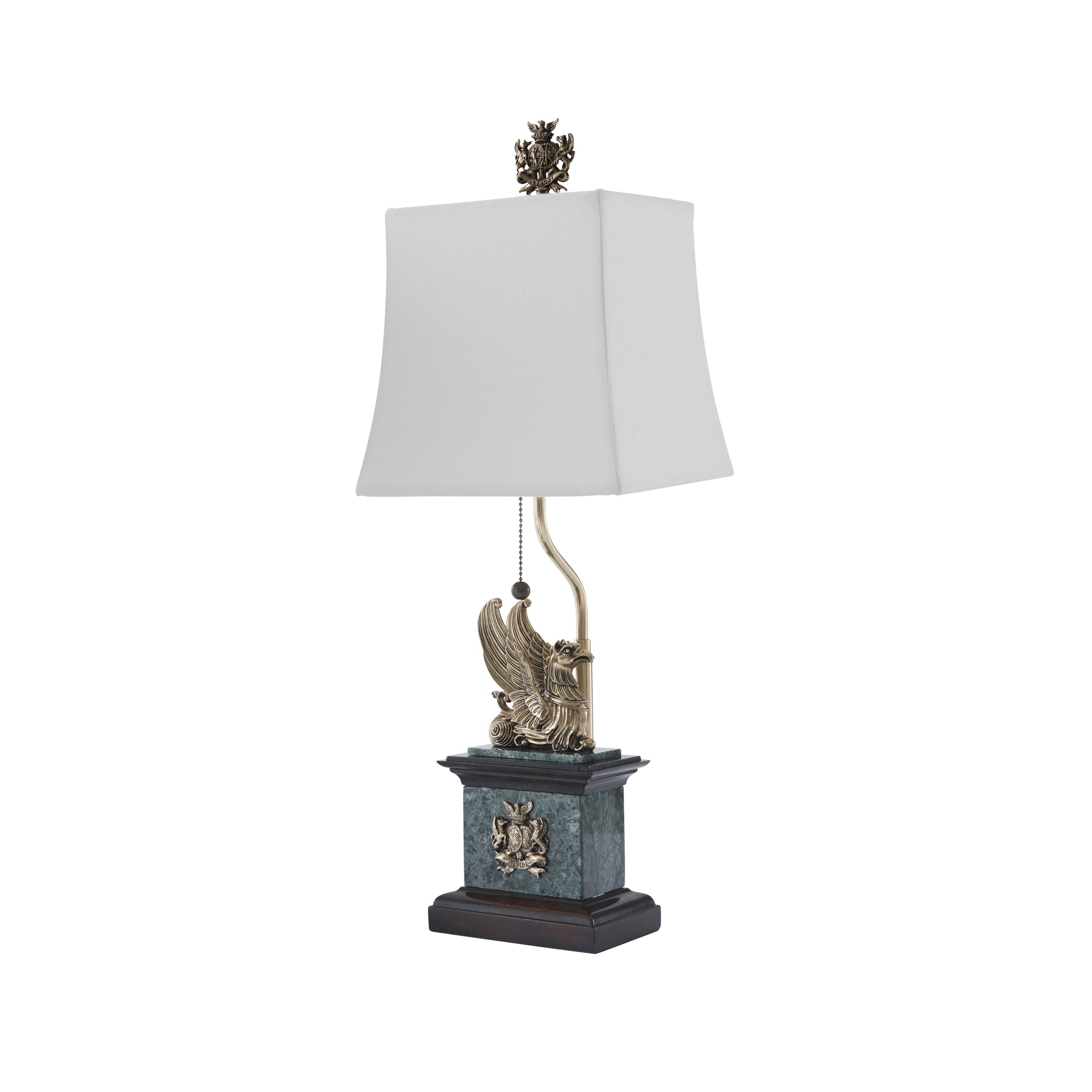 مصباح طاولة مصنوع من النحاس المصبوب بشكل جيد وخشب الماهوجني، مع ألواح حجرية خضراء مرقطة وقواعد من خشب الماهوجني مزينة بشعار سبنسر، ويعلوه جريفين جالس وغطاء معبد، والغطاء مزين بزخرفة شعار سبنسر الجميلة.