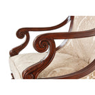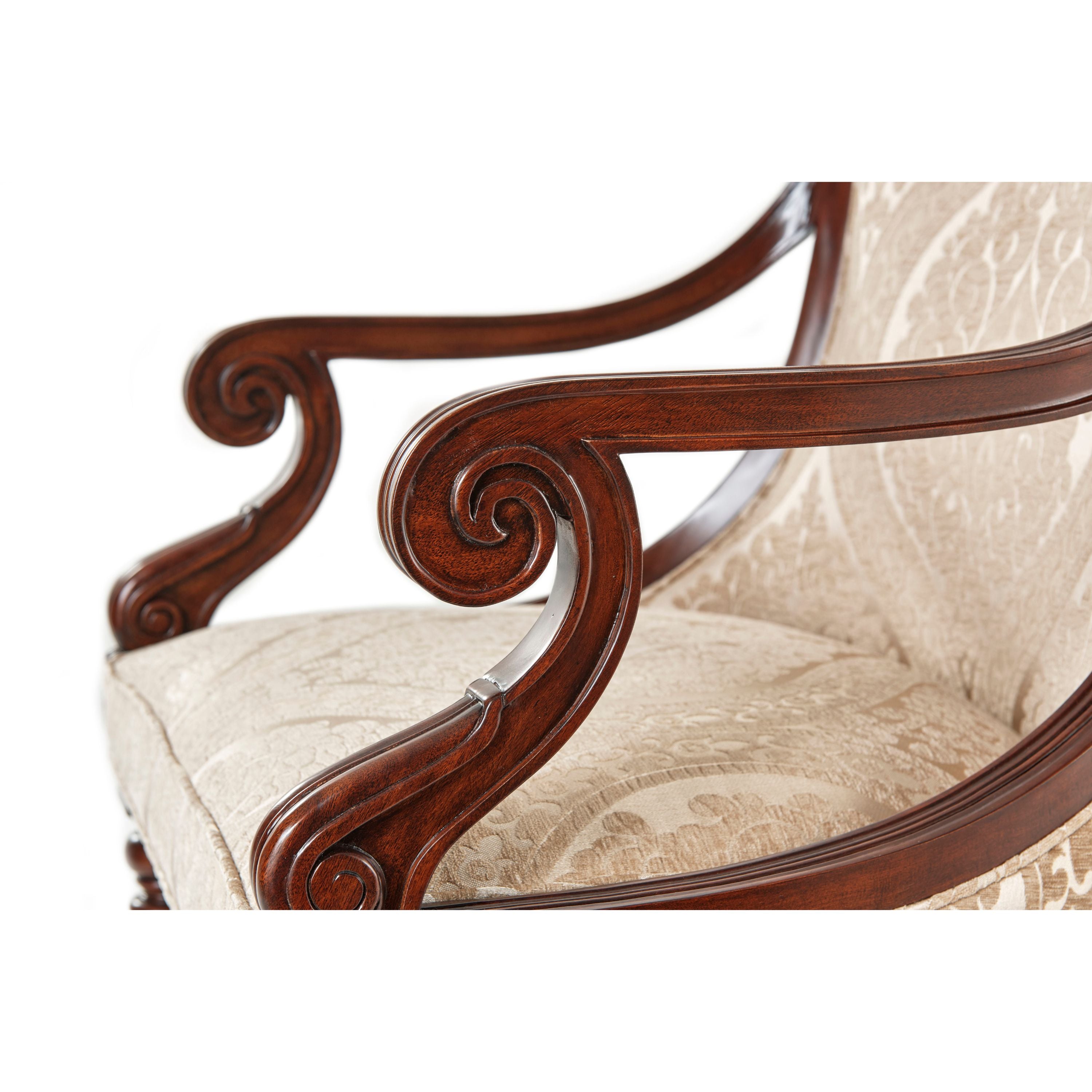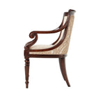 كرسي طعام ذو مسند ظهر مصنوع يدويًا من خشب الماهوجني، ومغطى بألواح خشبية فوق مقعد مبطن محاط بأذرع لولبية، على أرجل ملتوية ومضلعة.