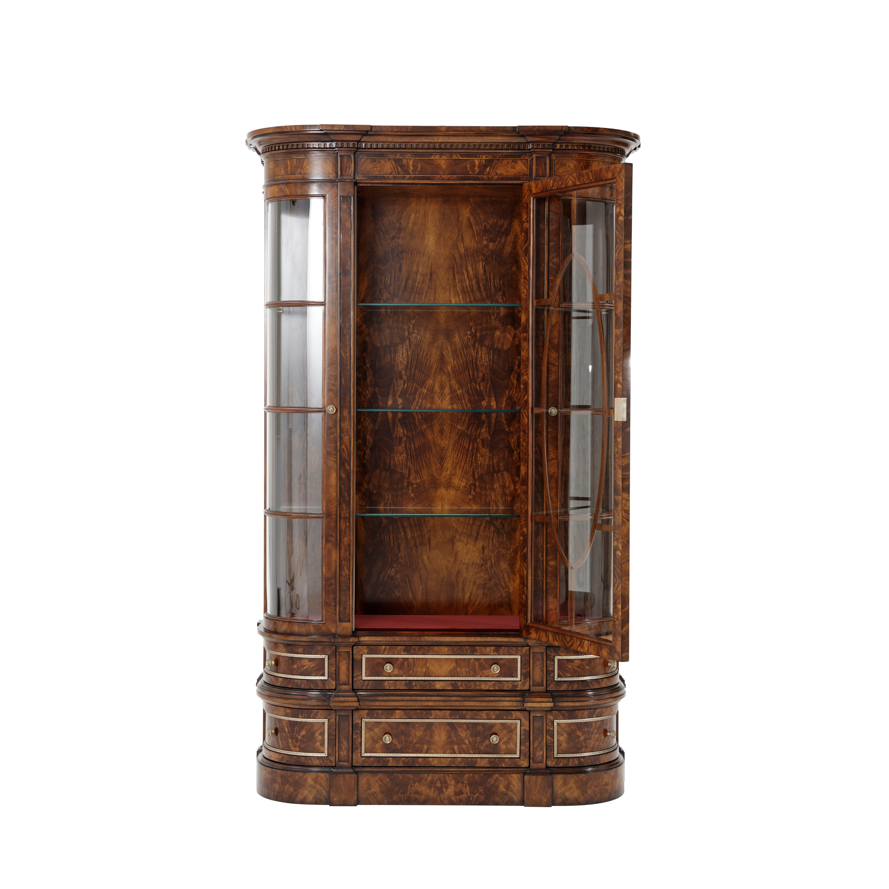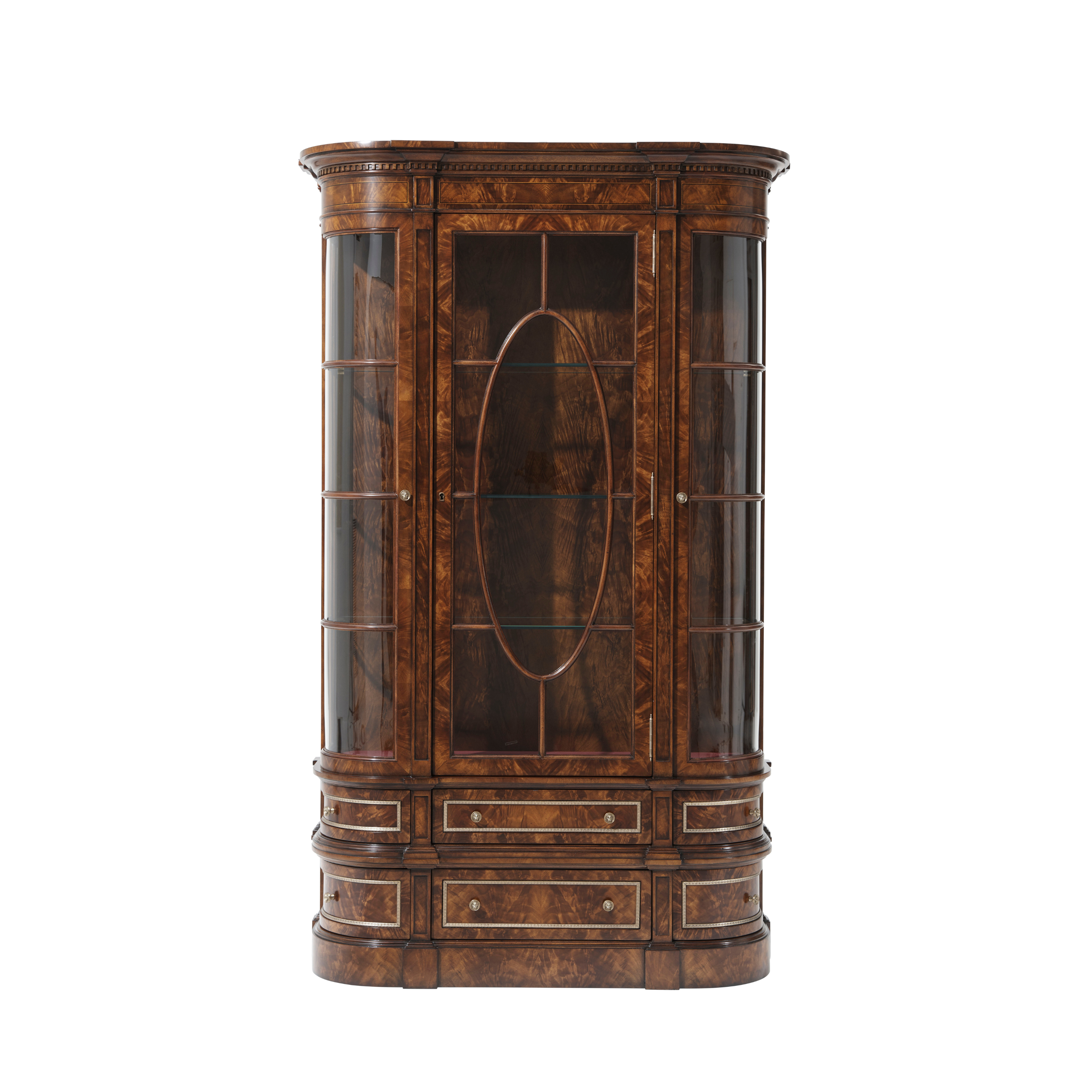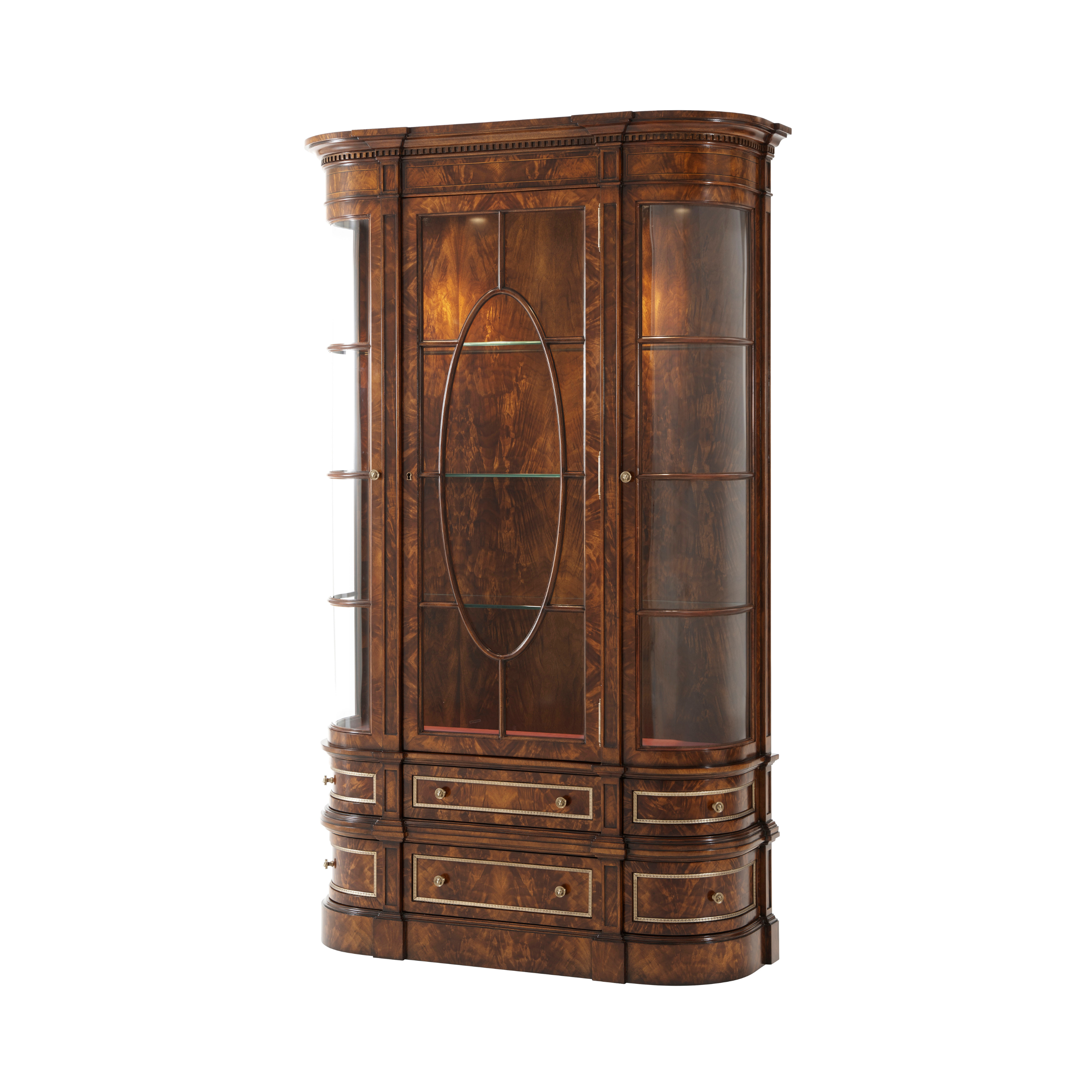 خزانة عرض ذات واجهة مقوسة مصنوعة من خشب الماهوجني، مع إفريز من دنتلي مصبوب على شكل كافيتو فوق إفريز عادي وباب مركزي بيضاوي الشكل مطلي بالزجاج، محاط بجوانب زجاجية منحنية، ويحيط بداخل مضاء مع أرفف زجاجية، فوق درجين محاطين بأربعة أدراج متأرجحة منحنية على قاعدة.