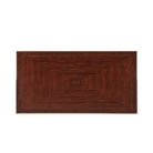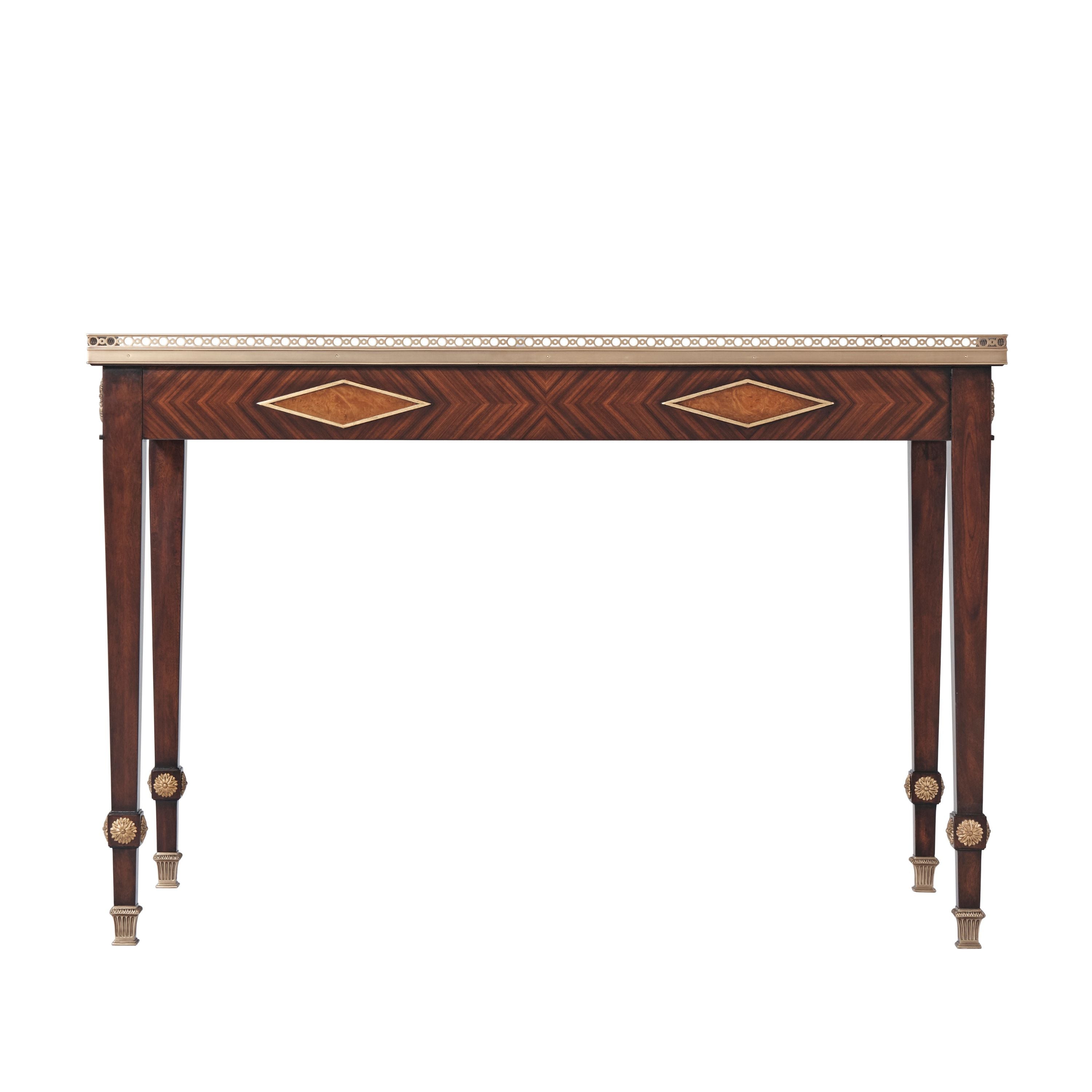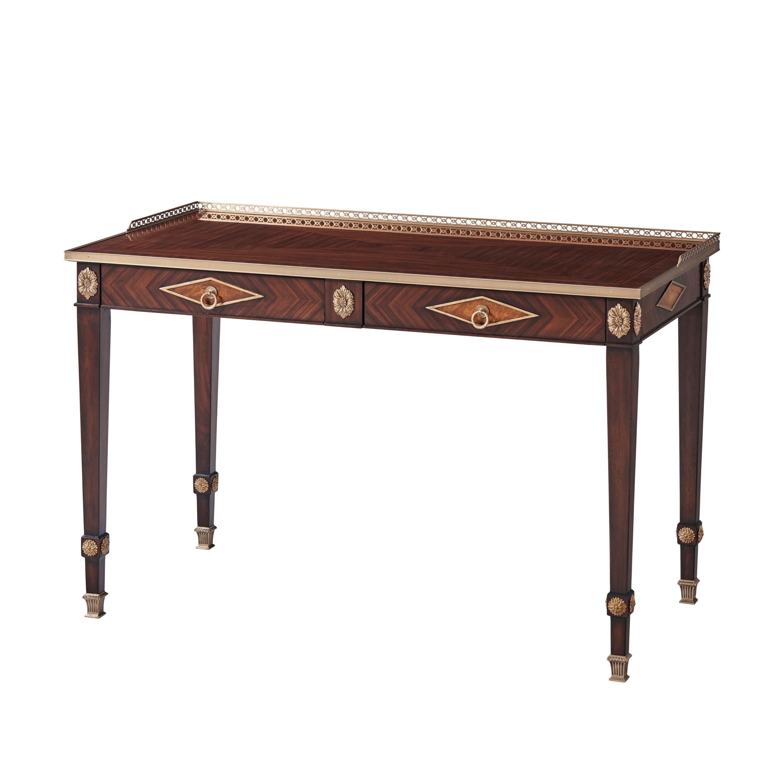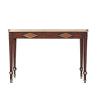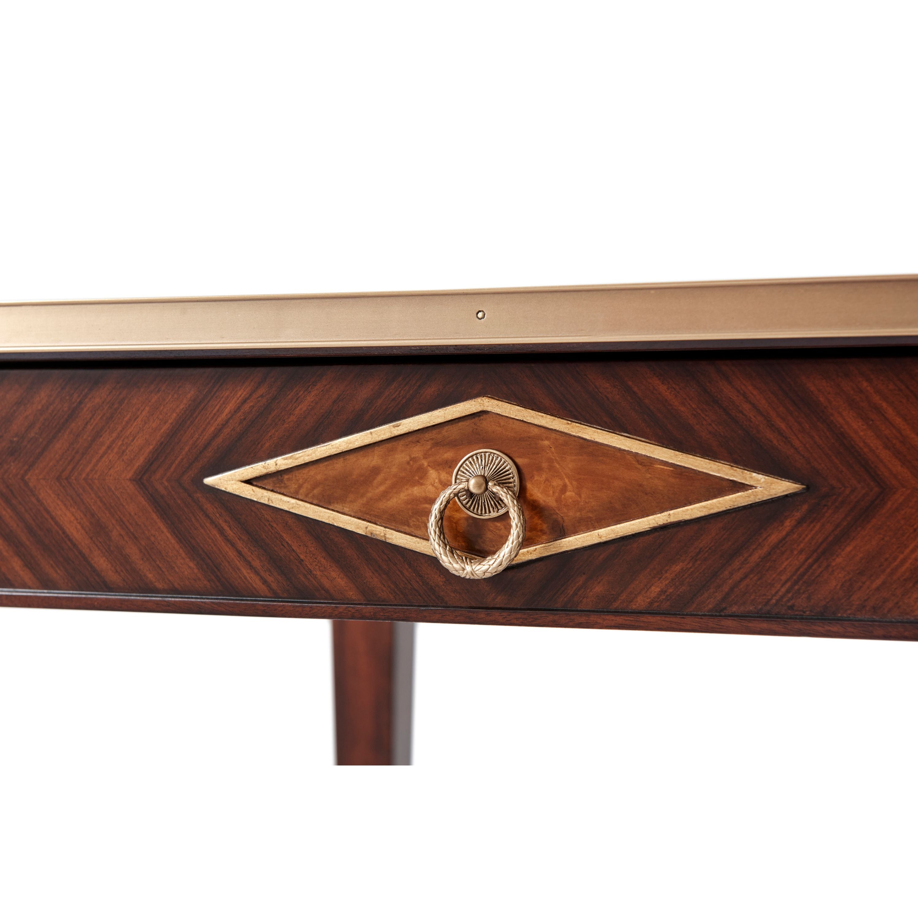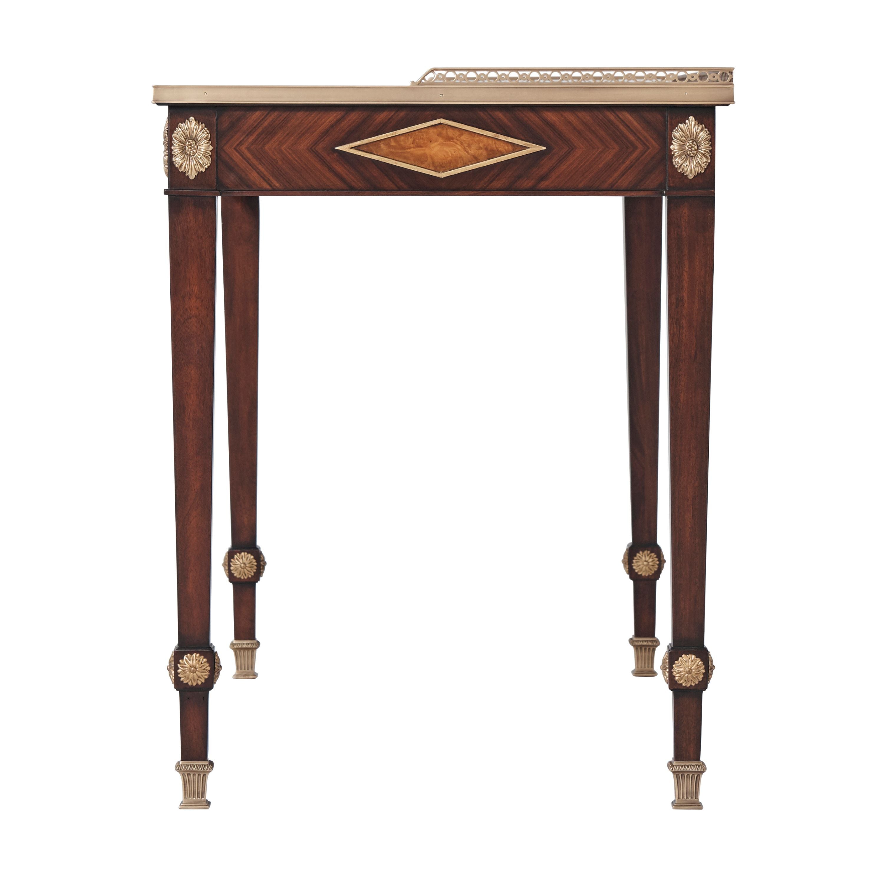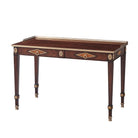 طاولة كتابة مكسوة بقشرة من خشب مورادو، ذات سطح مستطيل مع معرض نحاسي على شكل ثلاثة أرباع فوق درجين من الإفريز، كل منهما في وسط معينات مؤطرة بالذهب مع مراكز مكسوة بقشرة من خشب الكستناء، وأرجل مربعة مدببة مع تيجان وردية زهرية وأقدام منحوتة ومذهبة.
