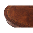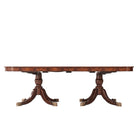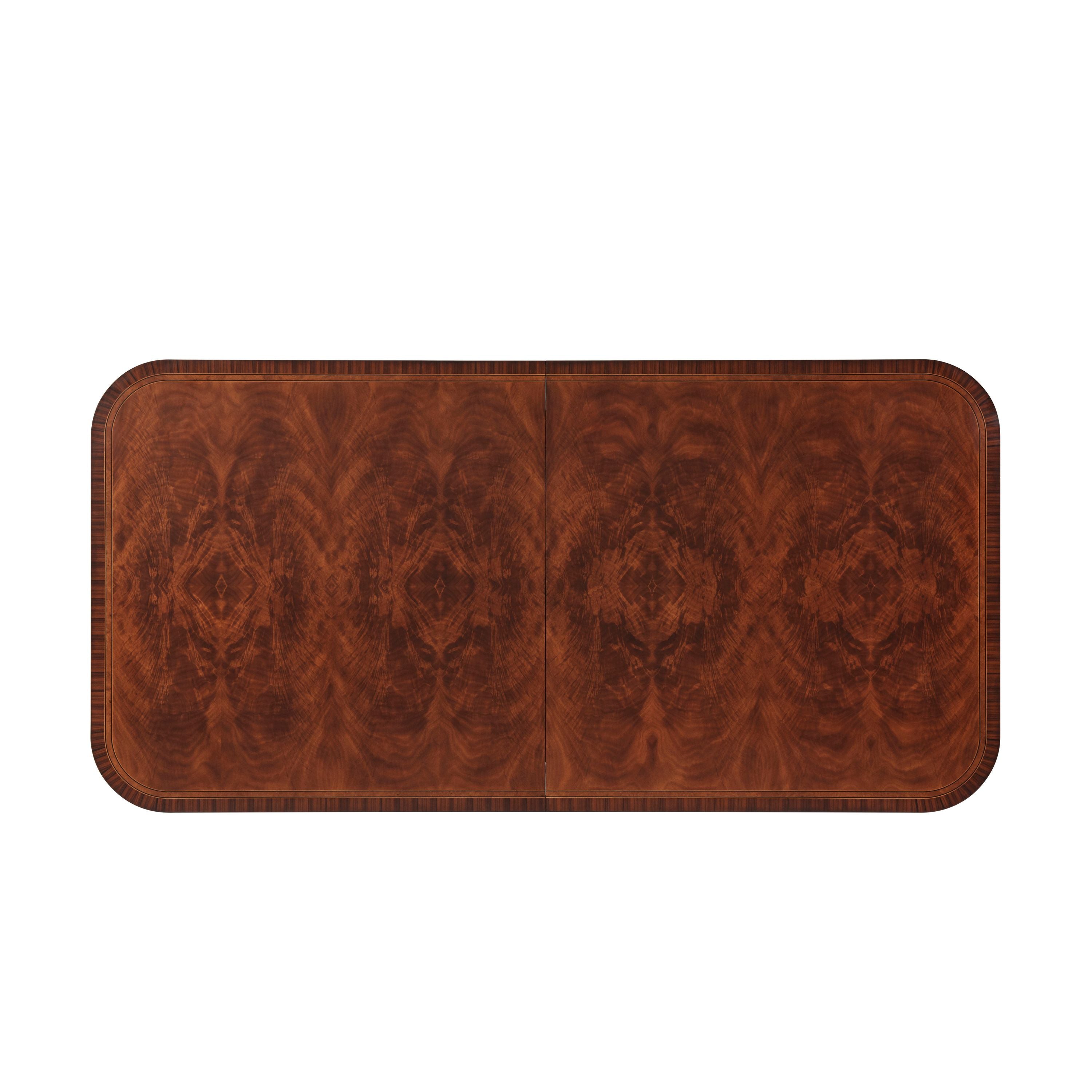 طاولة طعام ممتدة مصنوعة من خشب الماهوجني الفاخر ومغطاة بقشرة من الخشب المشتعل، ذات حافة مستطيلة من القصب مع زوايا مستديرة متقاطعة من خشب الكستناء والمورادو، مع ورقتين إضافيتين للتخزين الذاتي، فوق مئزر من خشب الماهوجني، على قاعدتين دائريتين، كل منهما يصدر أربعة أرجل متجهة للأسفل تنتهي بأغطية نحاسية مصبوبة على شكل أوراق دقيقة.