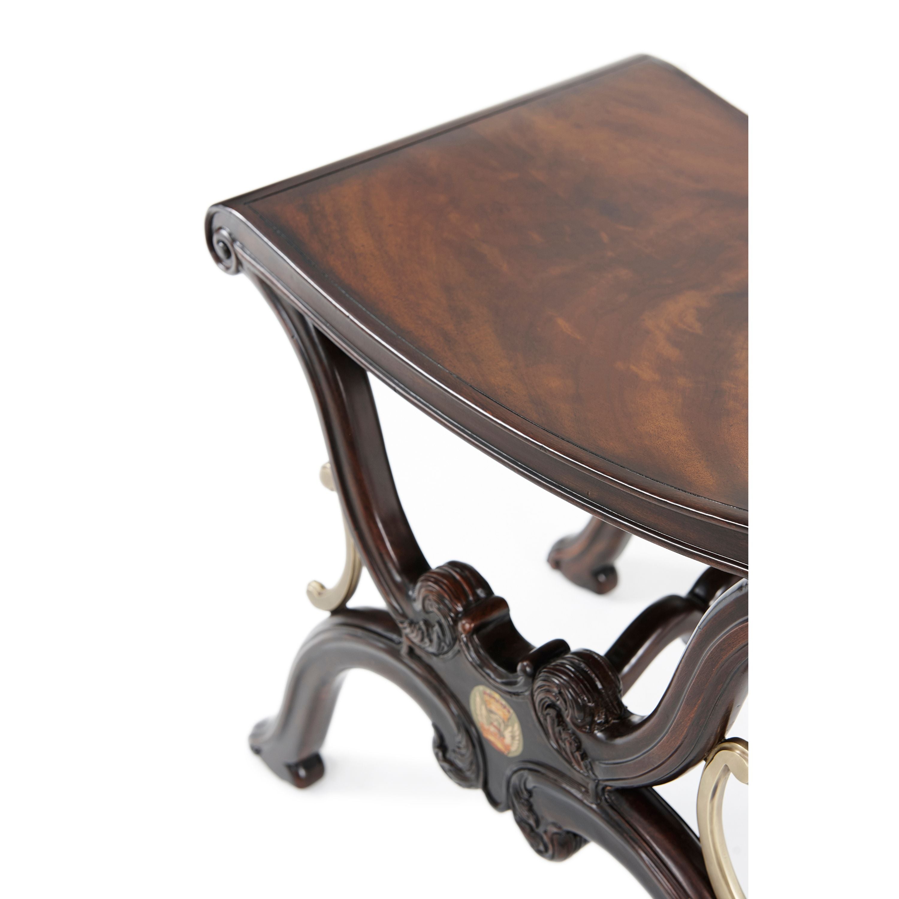 كرسي قاعة من خشب الماهوجني المنحوت بإطار على شكل حرف "X" على طراز جيلوز لانكستر. يدعم المقعد الصلب ذو الحافة المنحنية المصبوبة إطارًا منحوتًا على شكل حرف "X" من السربنتين، ويتوسطه لوحة منحوتة على شكل أوراق شجر مرسومة يدويًا تحمل شعار سبنسر، مع لمسات مذهبة على شكل حرف "C" على الجانبين. التمثال الأصلي لجورج الثالث، حوالي عام ١٧٦٠.