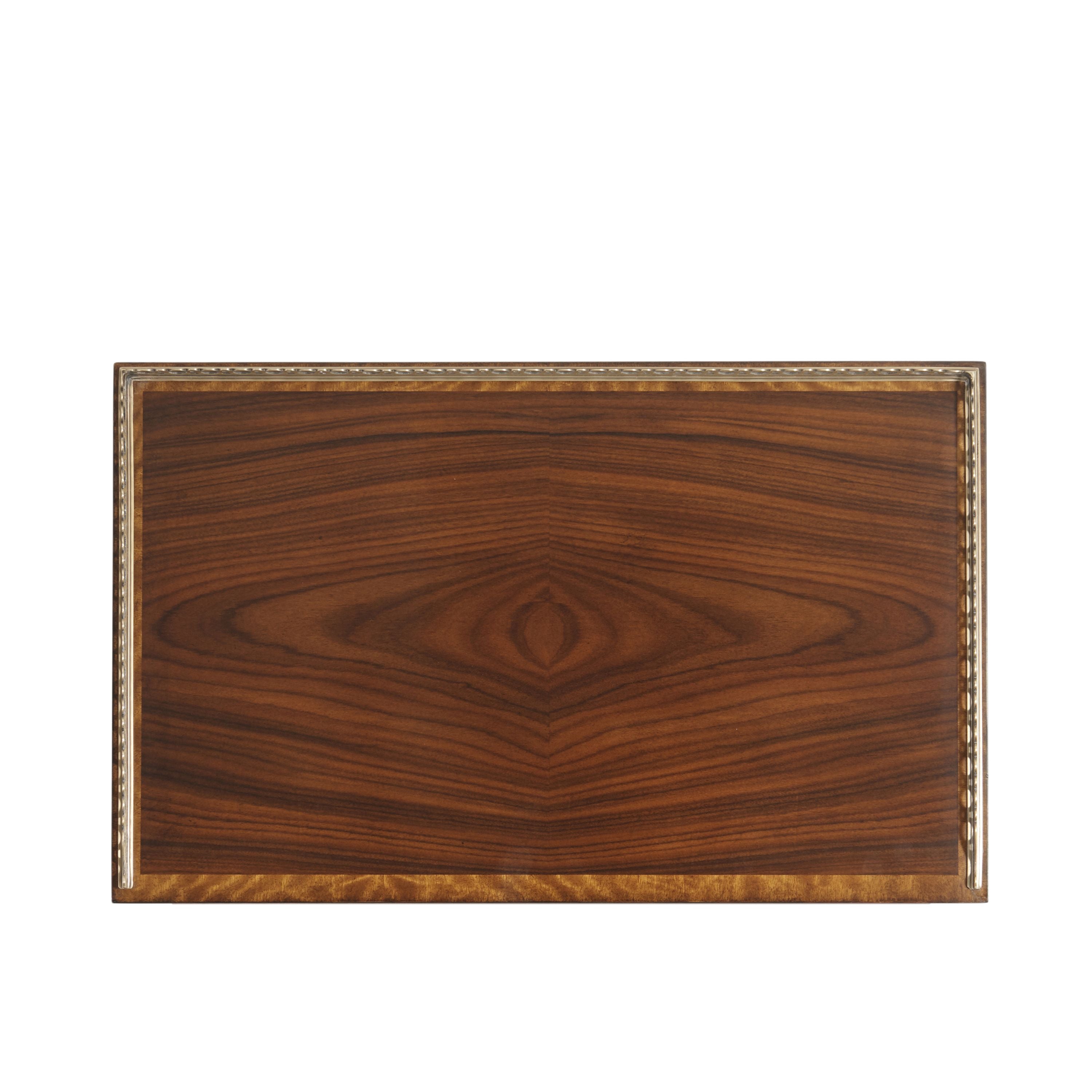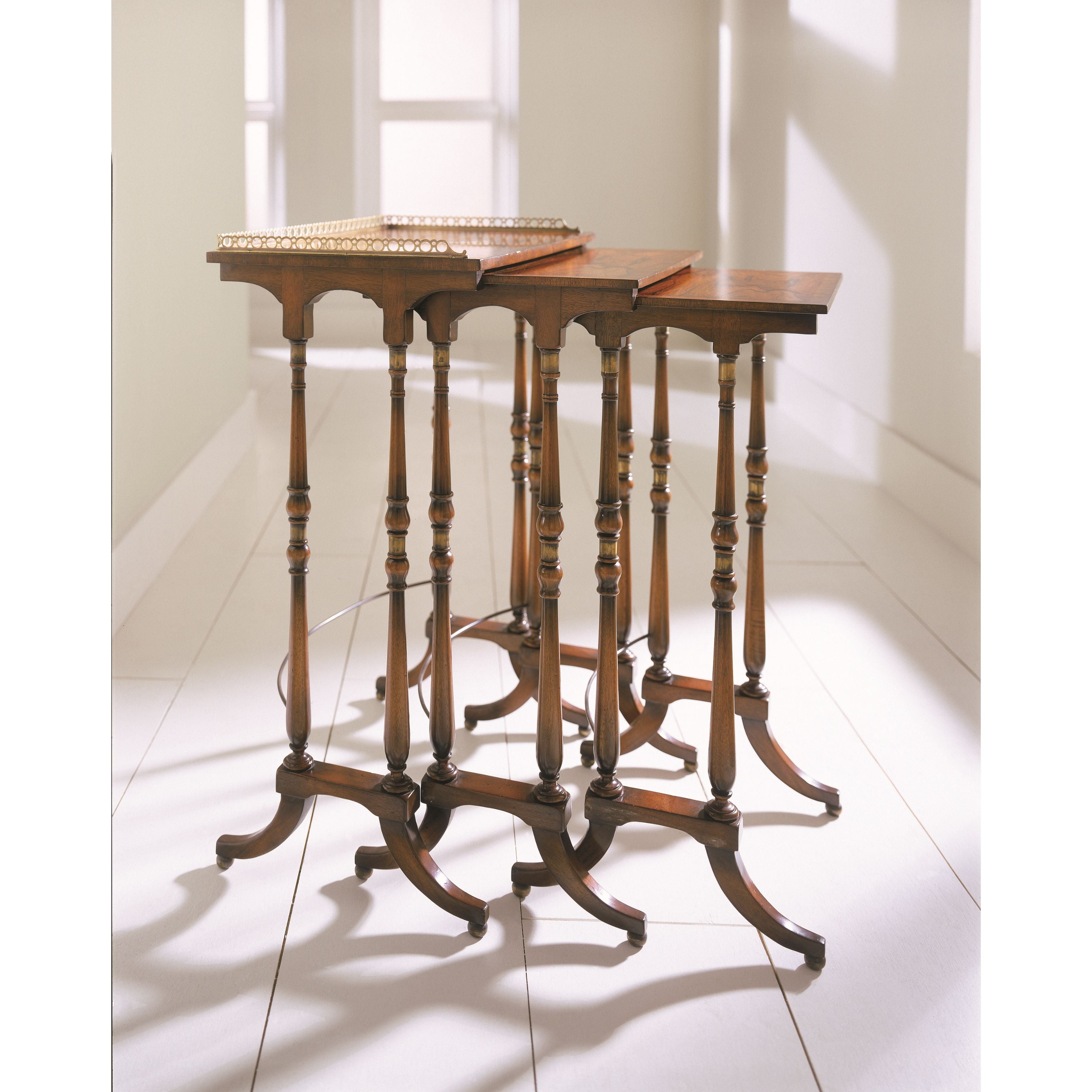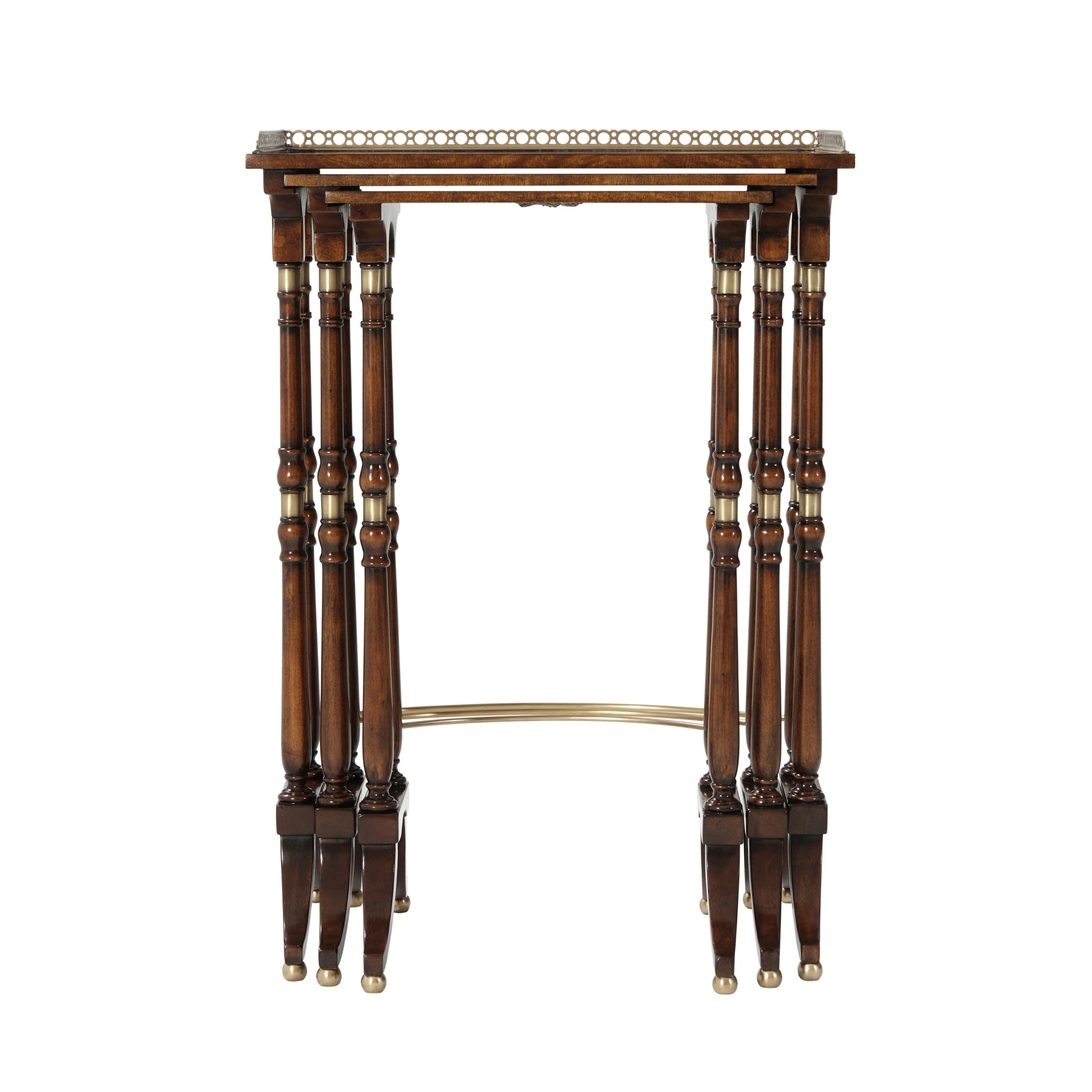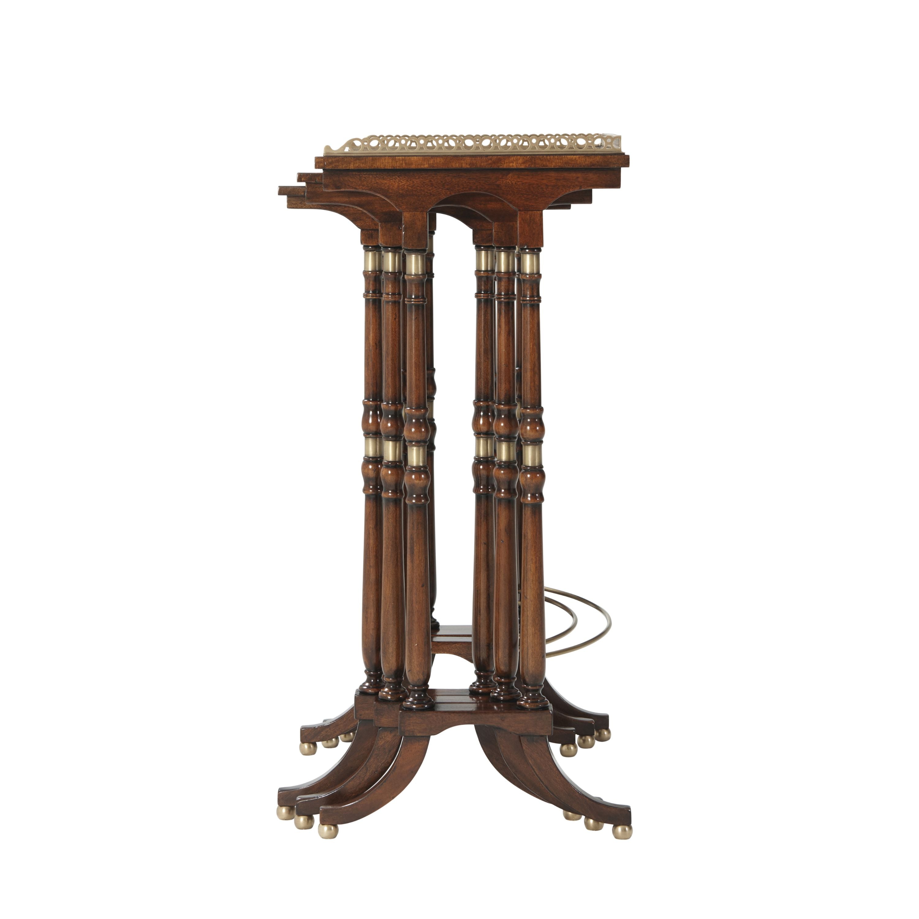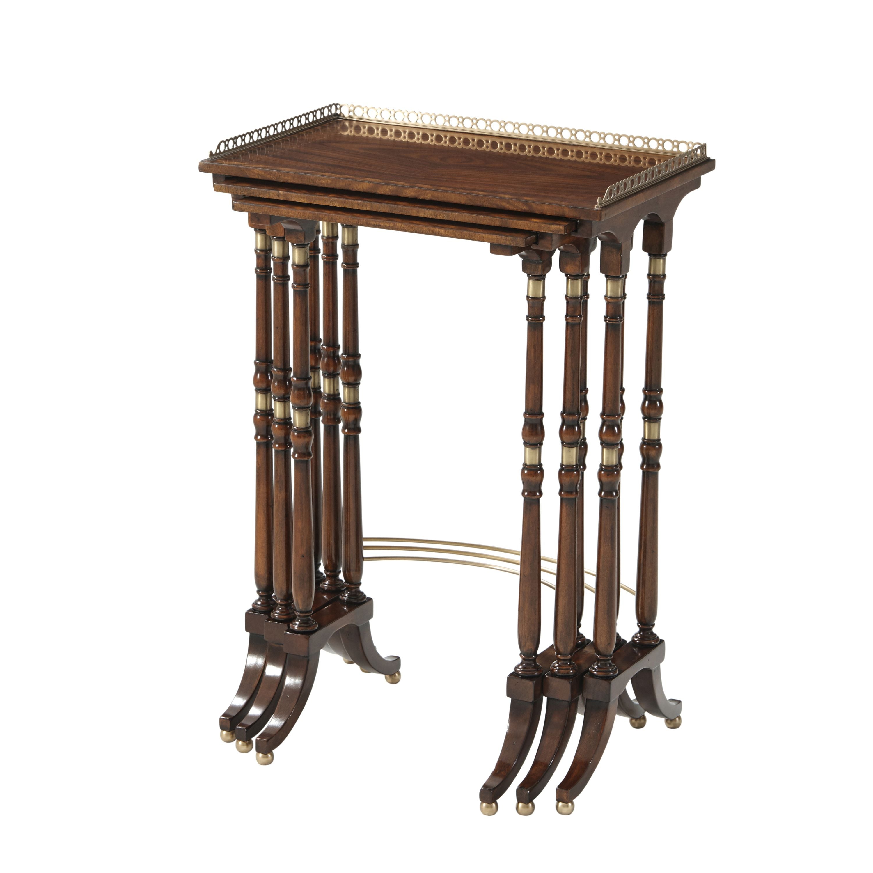 مجموعة من ثلاث طاولات من خشب الماهوجني والمورادو، بسطح نحاسي مزخرف بثلاثة أرباعه، كل طاولة على دعامتين طرفيتين متحركتين ومثبتتين بالنحاس، متصلتين بقاعدة نحاسية منحنية، على أرجل كروية نحاسية. تعود النسخ الأصلية إلى حوالي عام ١٨٢٠، في غرفة الرسم الجنوبية في ألثورب.