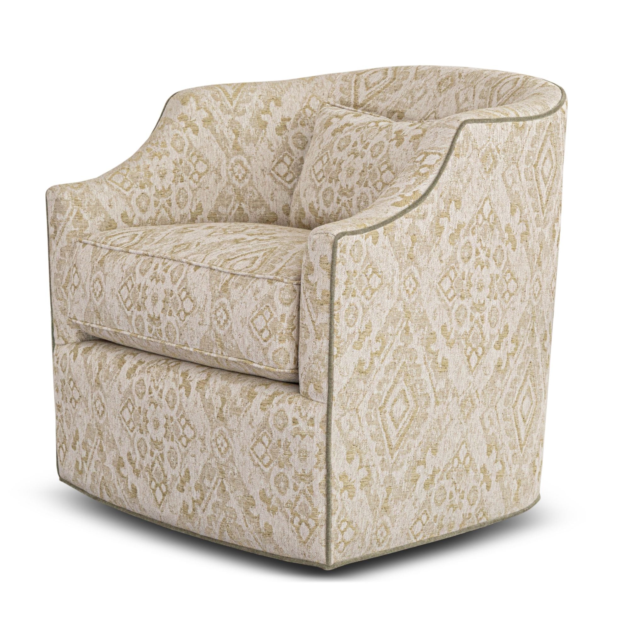 Elevate your space with the Aria Morgan Swivel Chair, featuring soft, patterned fabric in a neutral tone and sleek piped edges. Its smooth 360-degree swivel and plush cushion offer both style and comfort—perfect for any room.