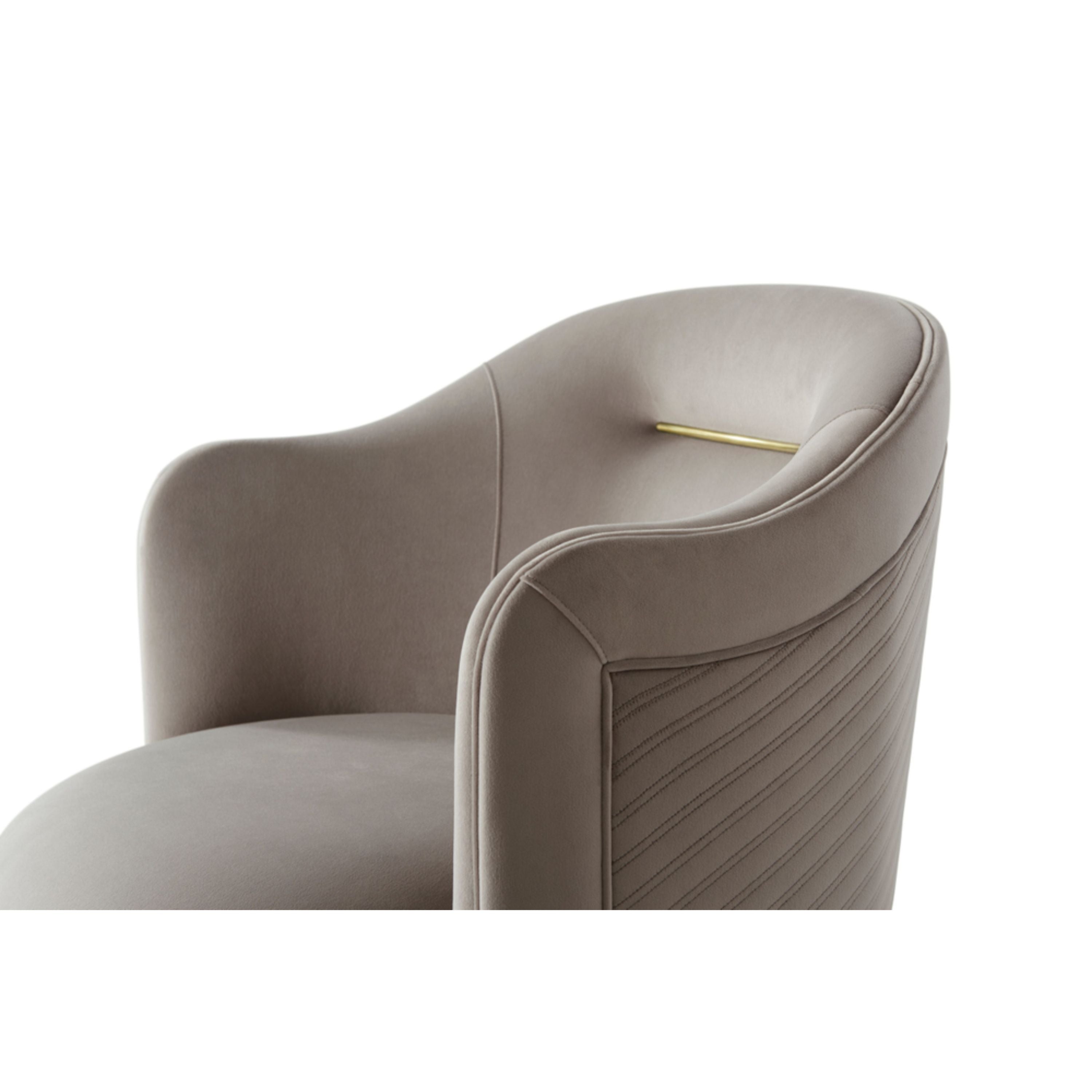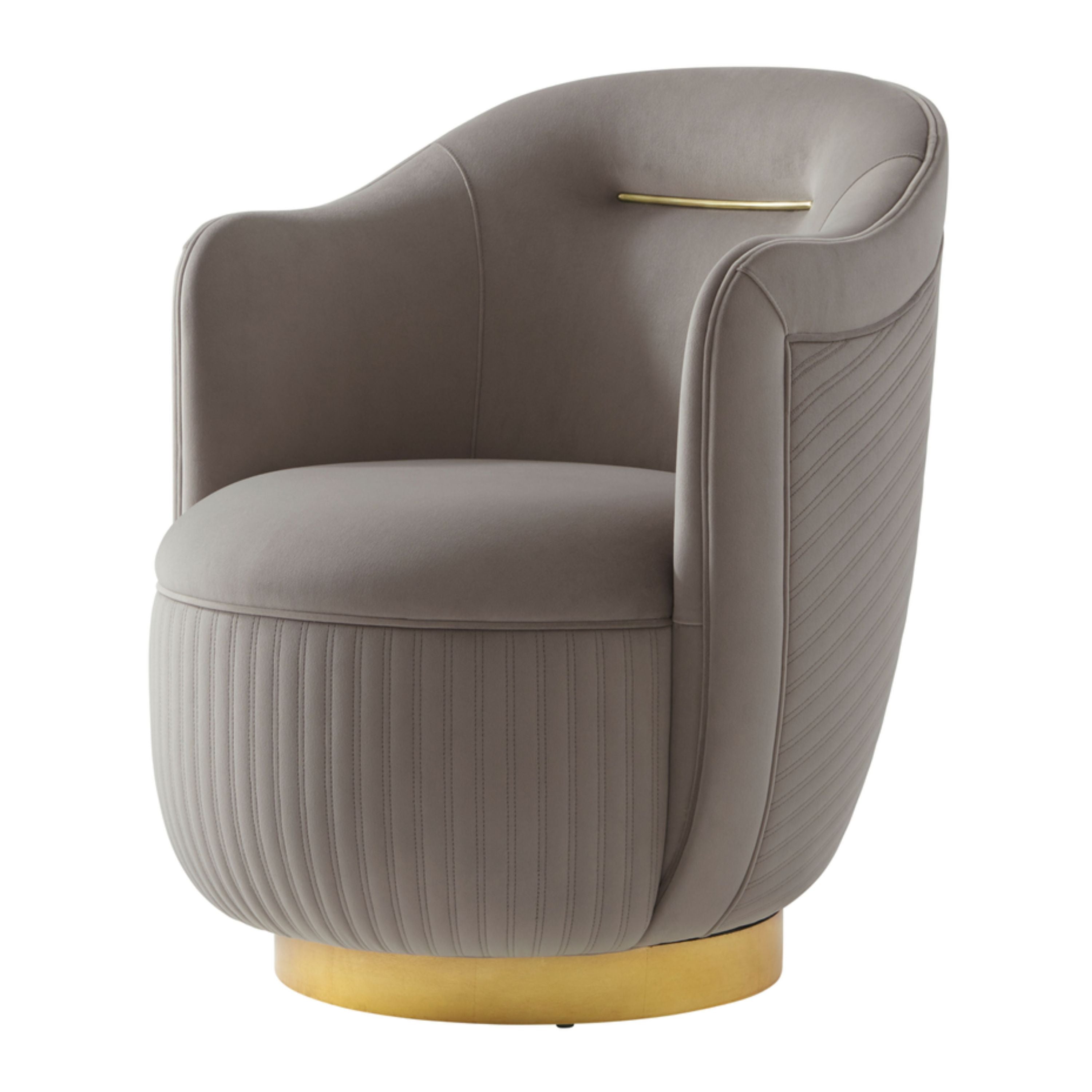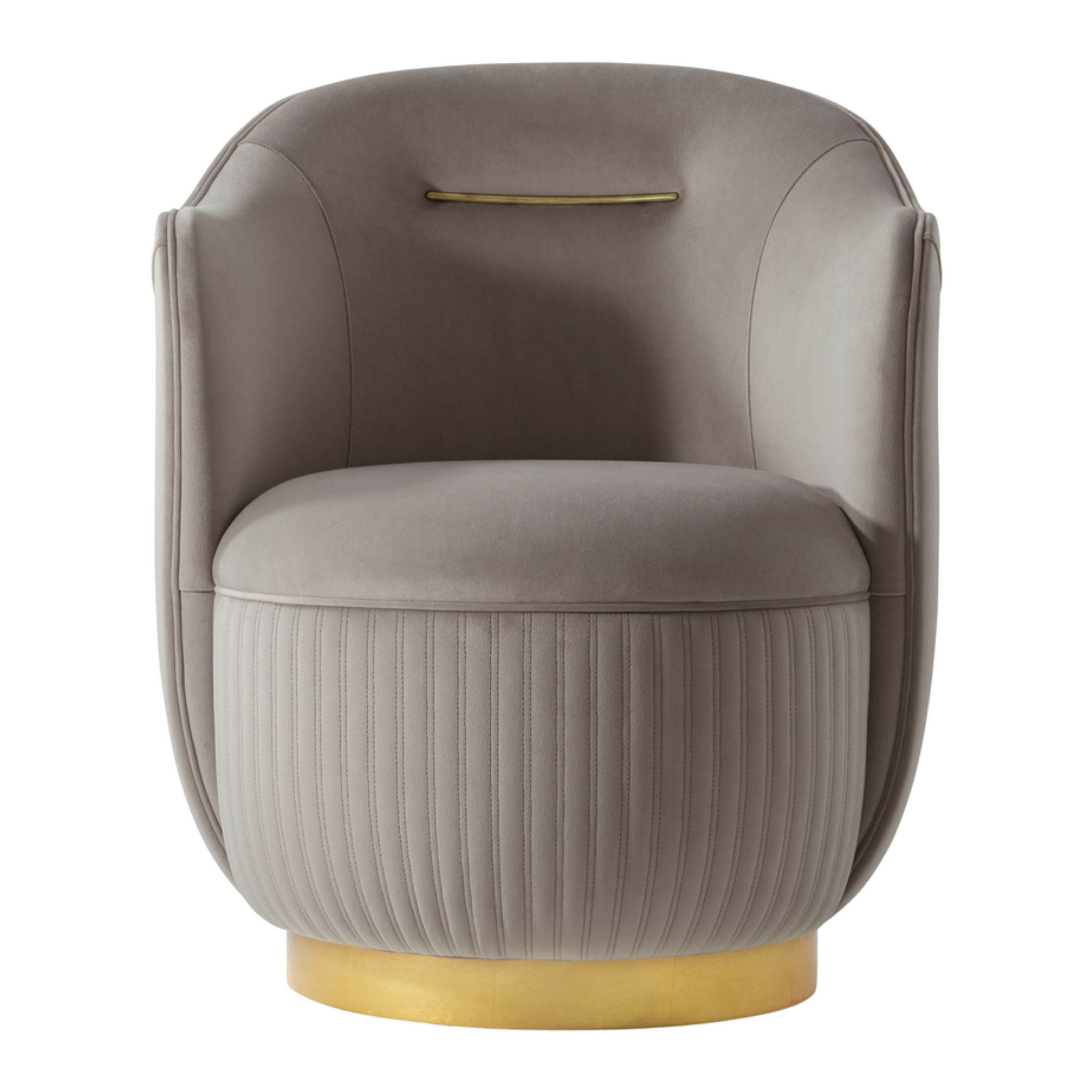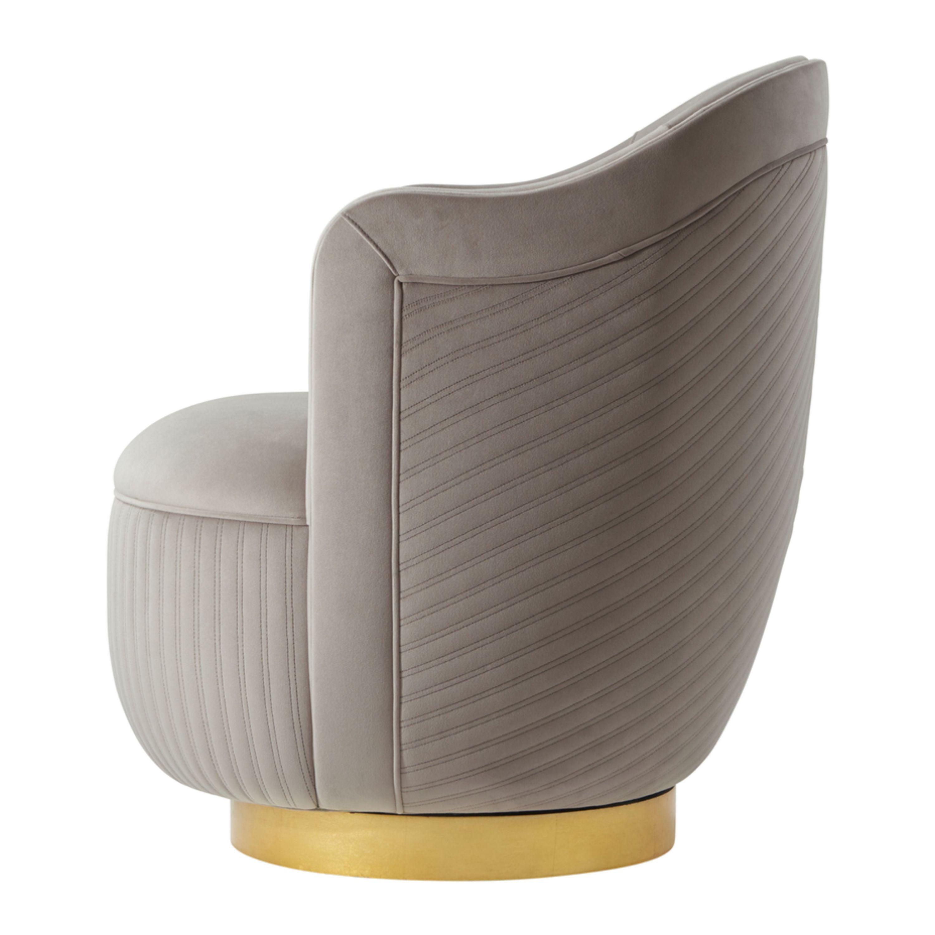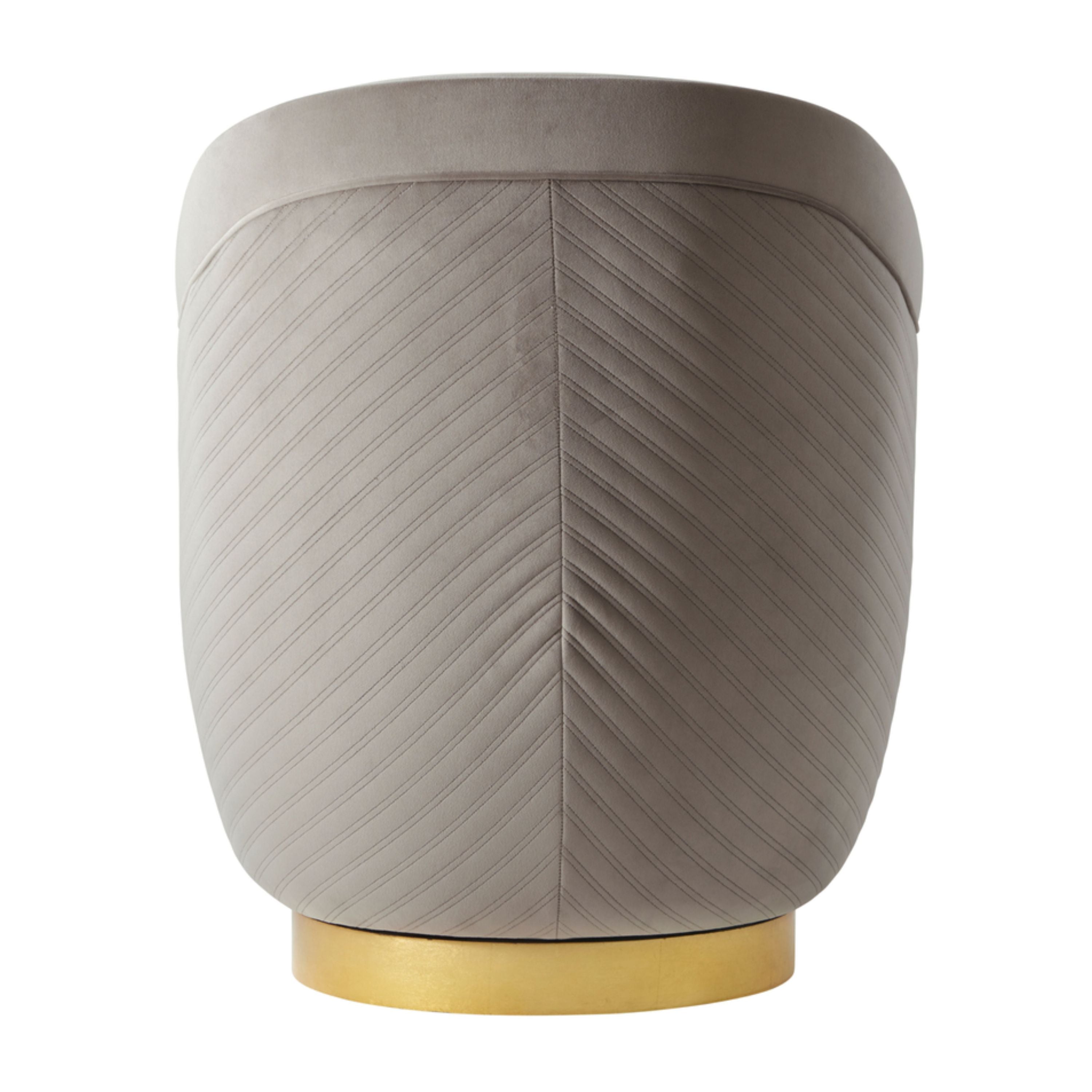 كرسي خلع الملابس الدوار، ذو الظهر المقوس مع أذرع ثعبانية واسعة، والجزء الخارجي المبطن بالقناة والقاعدة والظهر المنجد الضيق مع تفاصيل القالب، والمقعد الدائري على قاعدة من الذهب.