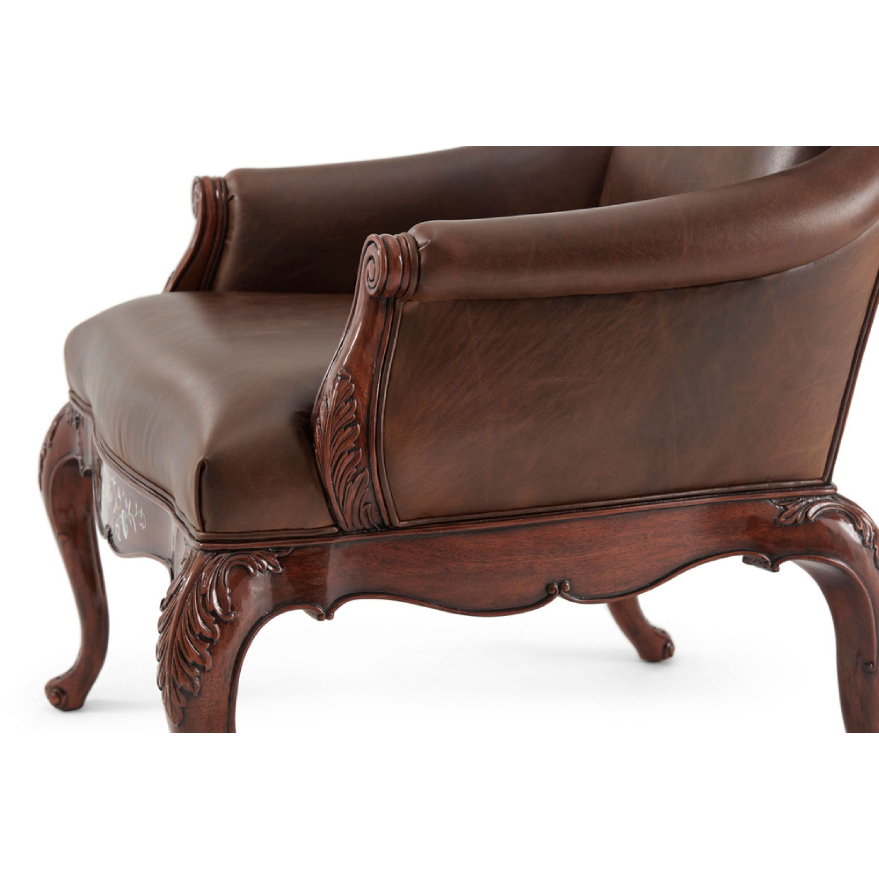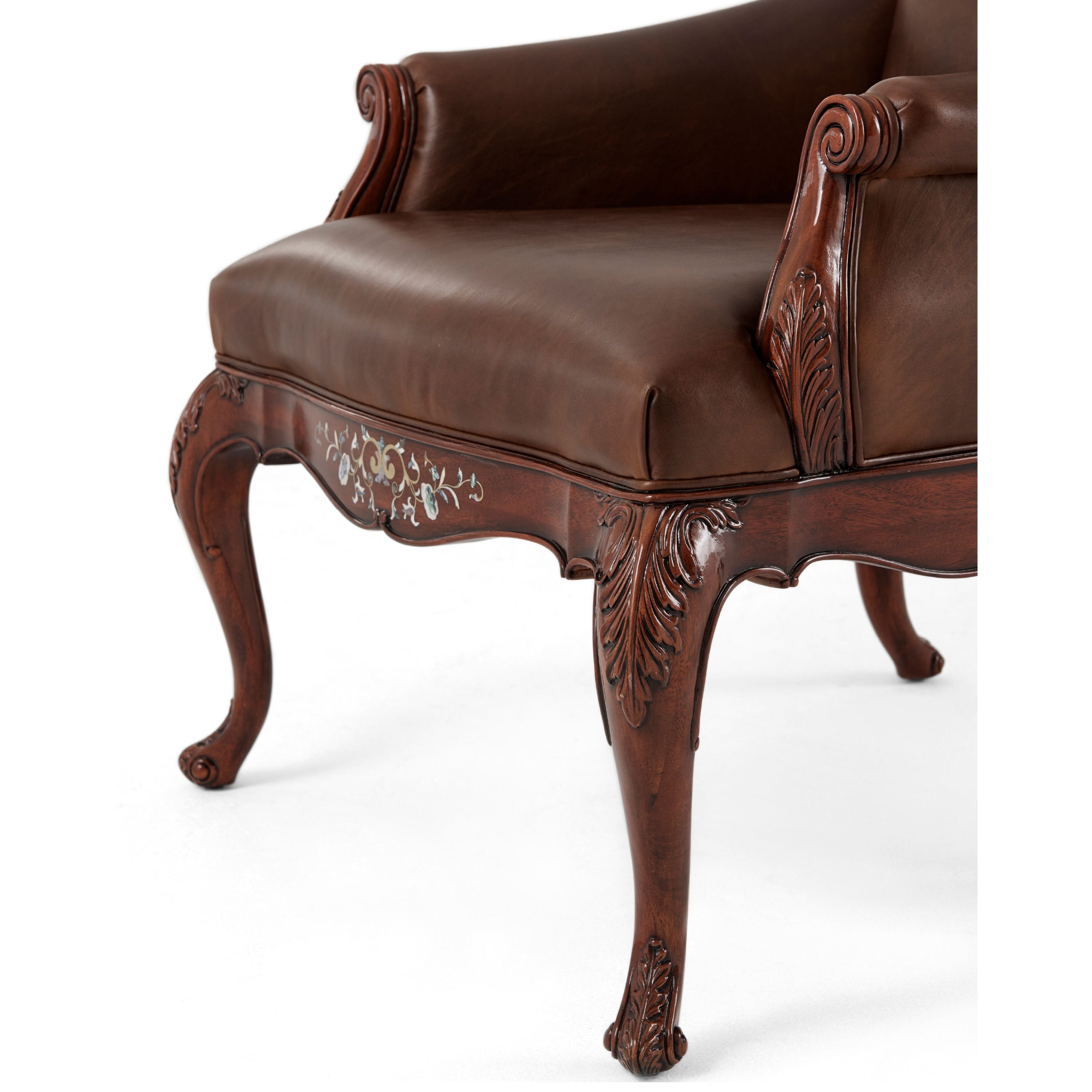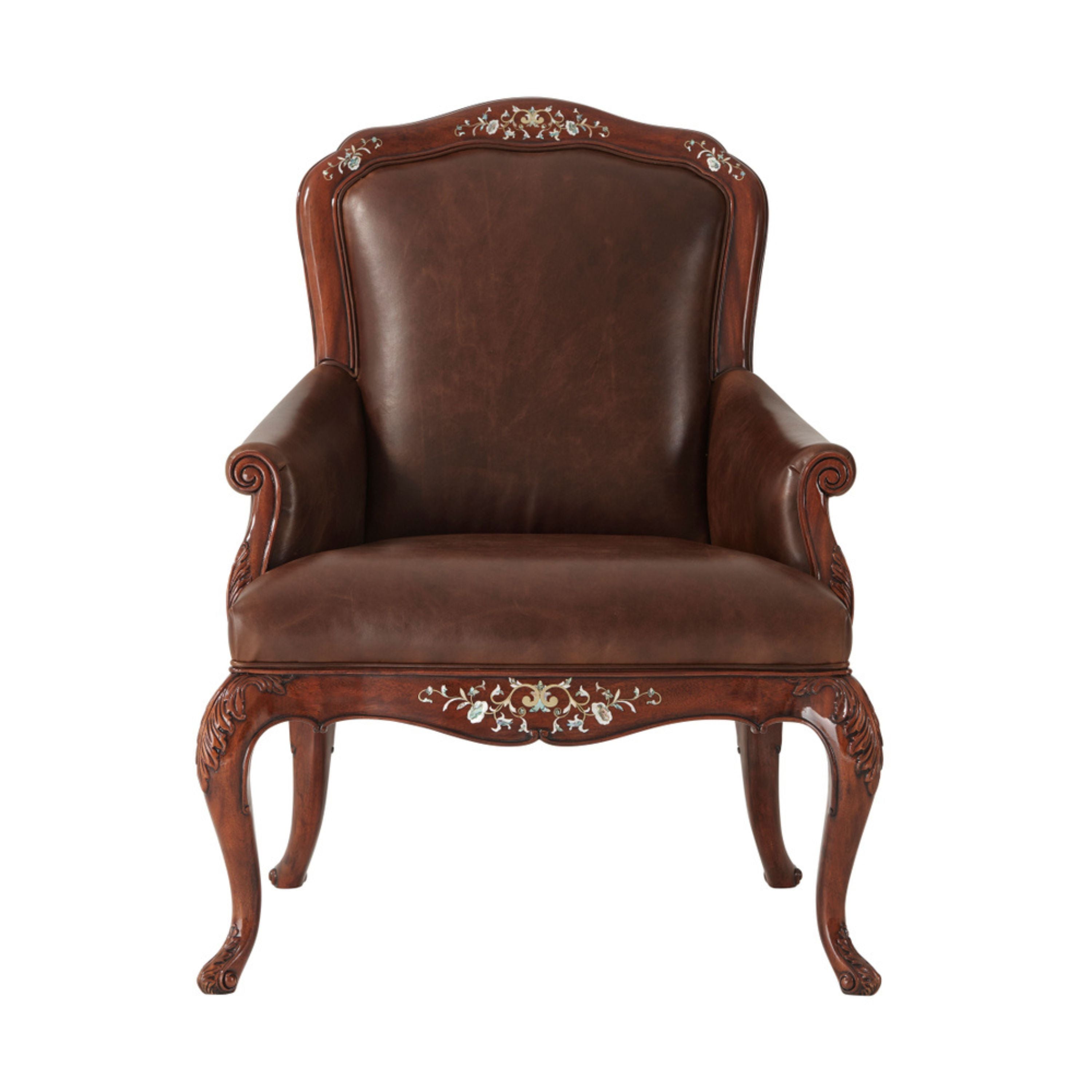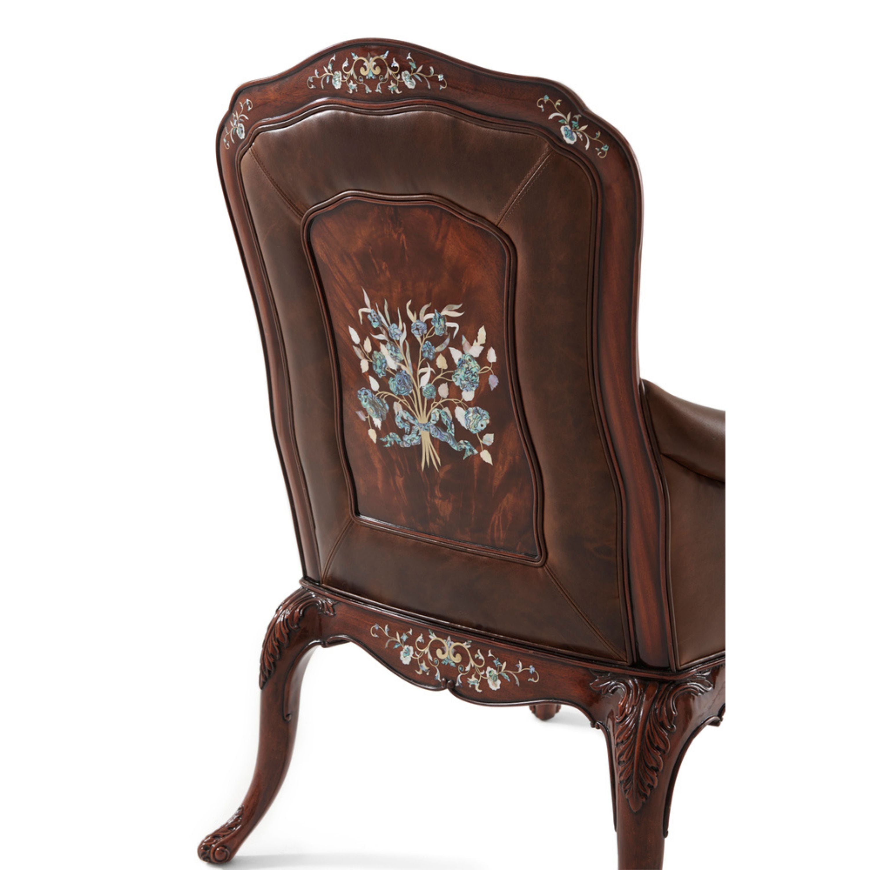 كرسي بذراعين منحوت يدويًا بدقة، ومطعّم بعرق اللؤلؤ، بظهر مبطن بشكل ثعباني وذراعين مزخرفتين تحيطان بمقعد منجد، مع قضبان من نفس الشكل تمتد إلى أرجل منحوتة من الأقنثة. أما الجزء الخلفي الخارجي، فيتميز بلوحة مركزية من خشب الماهوجني المتوهج، مرصعة بباقة زهور مزخرفة بقشرة وعرق اللؤلؤ.