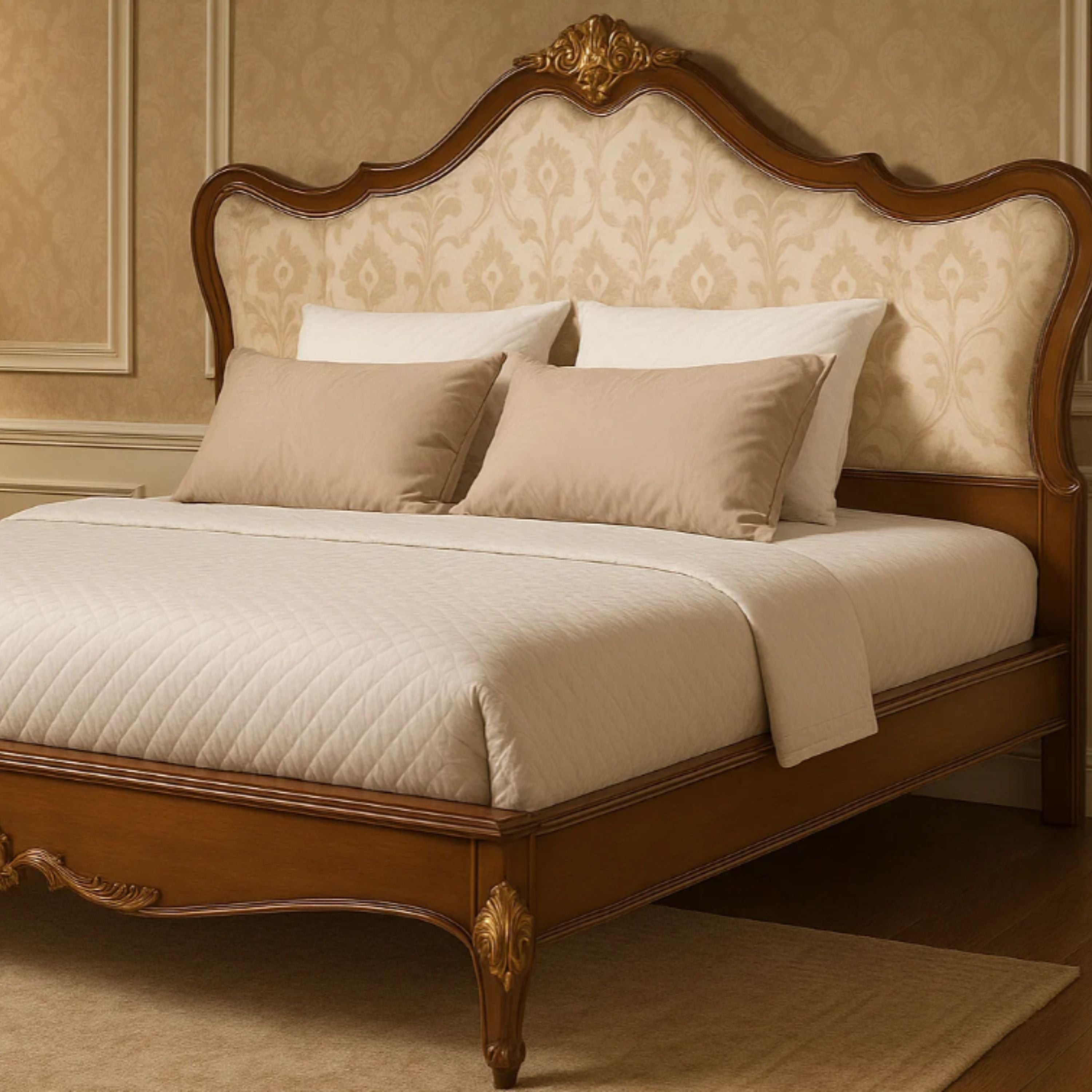 بانحناءاته الواسعة، وشعاره المذهب، ولوحه الأمامي المنجد بنقوشه الدقيقة، يضفي سرير أفلين لمسةً من الأناقة على غرفة النوم الكلاسيكية. مصنوع من خشب الجوز الدافئ، ويوازن بين النعومة والهيكل مع سحرٍ خالد.