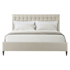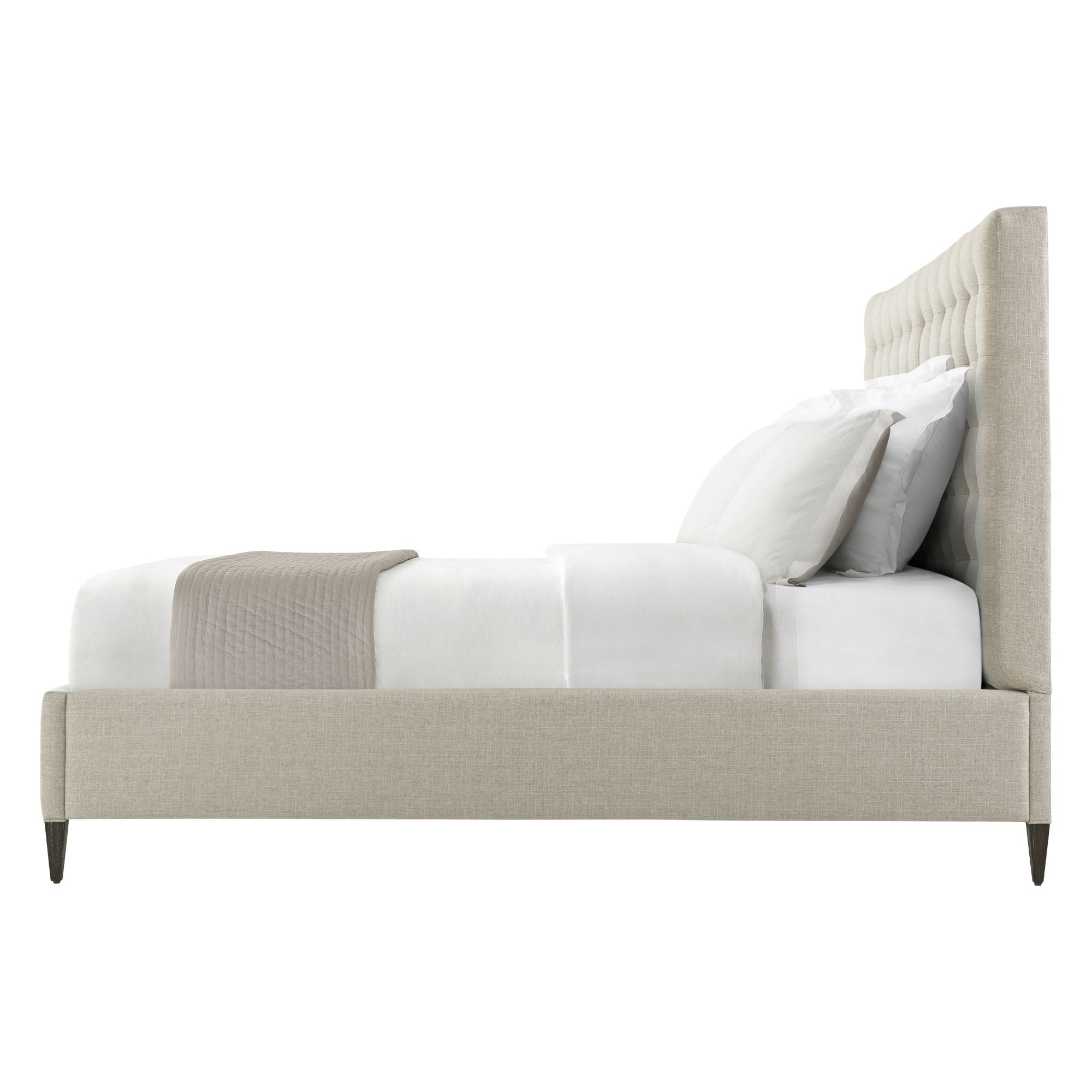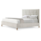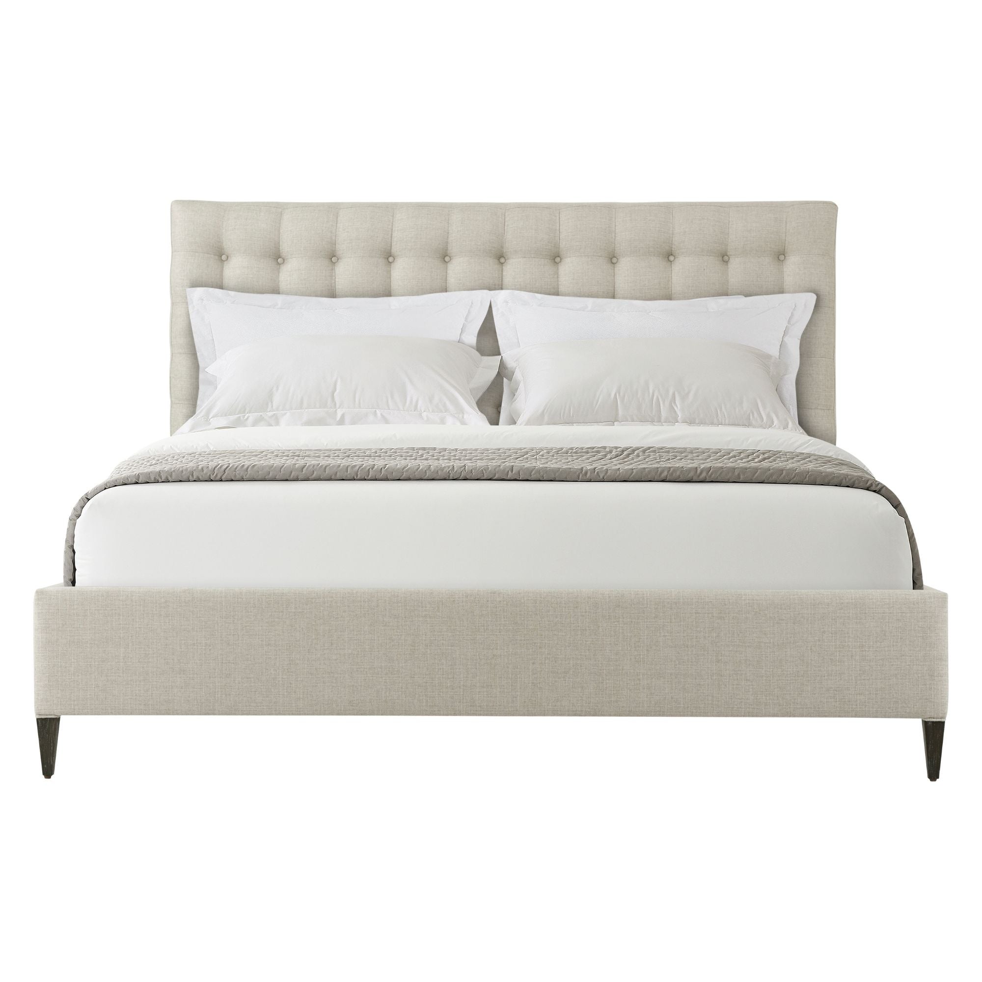 Modern bed with a biscuit tufted upholstered headboard and beech wood legs in our rowan finish.