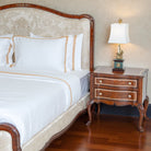 The refined golden lattice embroidery brings a classic yet contemporary charm, making it a versatile centerpiece for your interiors. Designed for premium comfort and sophistication, the set includes a flat sheet, fitted sheet, duvet cover, pillowcases, and shams—providing a complete bedding upgrade.