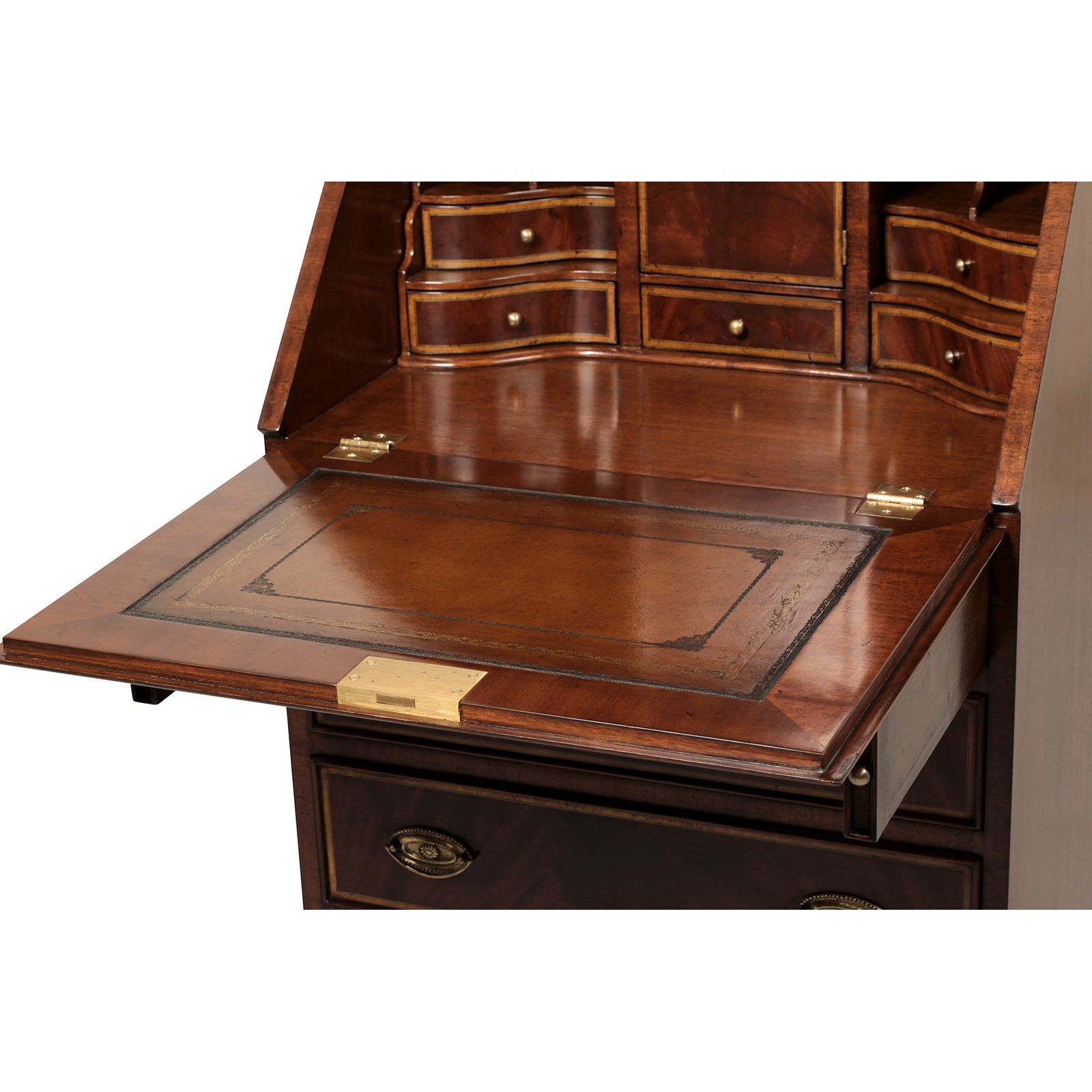 مكتبة من خشب الماهوجني مع تطعيمات بريما فيرا، وباب زجاجي منفصل، وسطح كتابة من الجلد ومقابض من النحاس