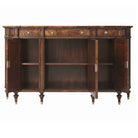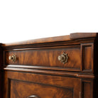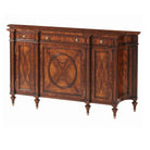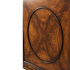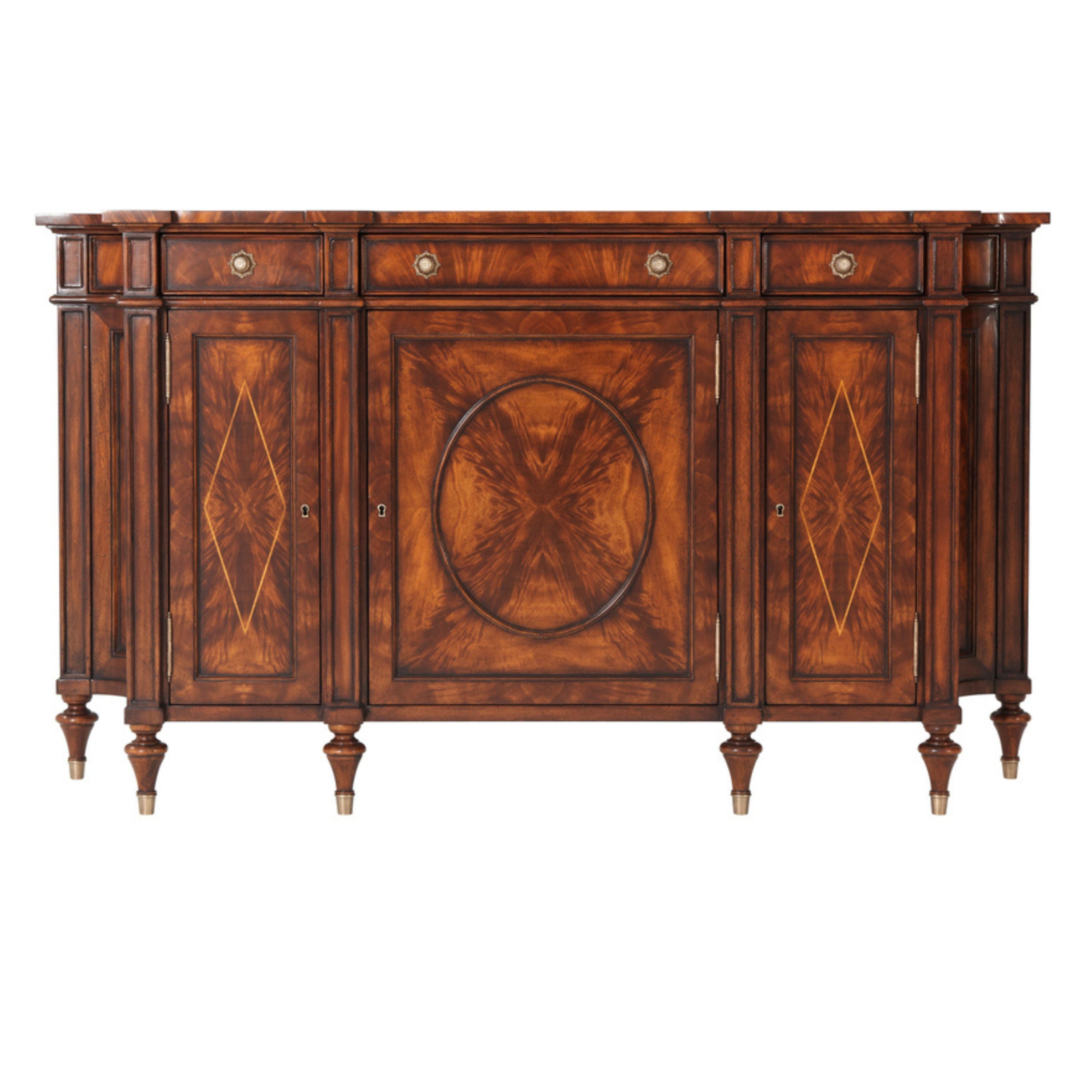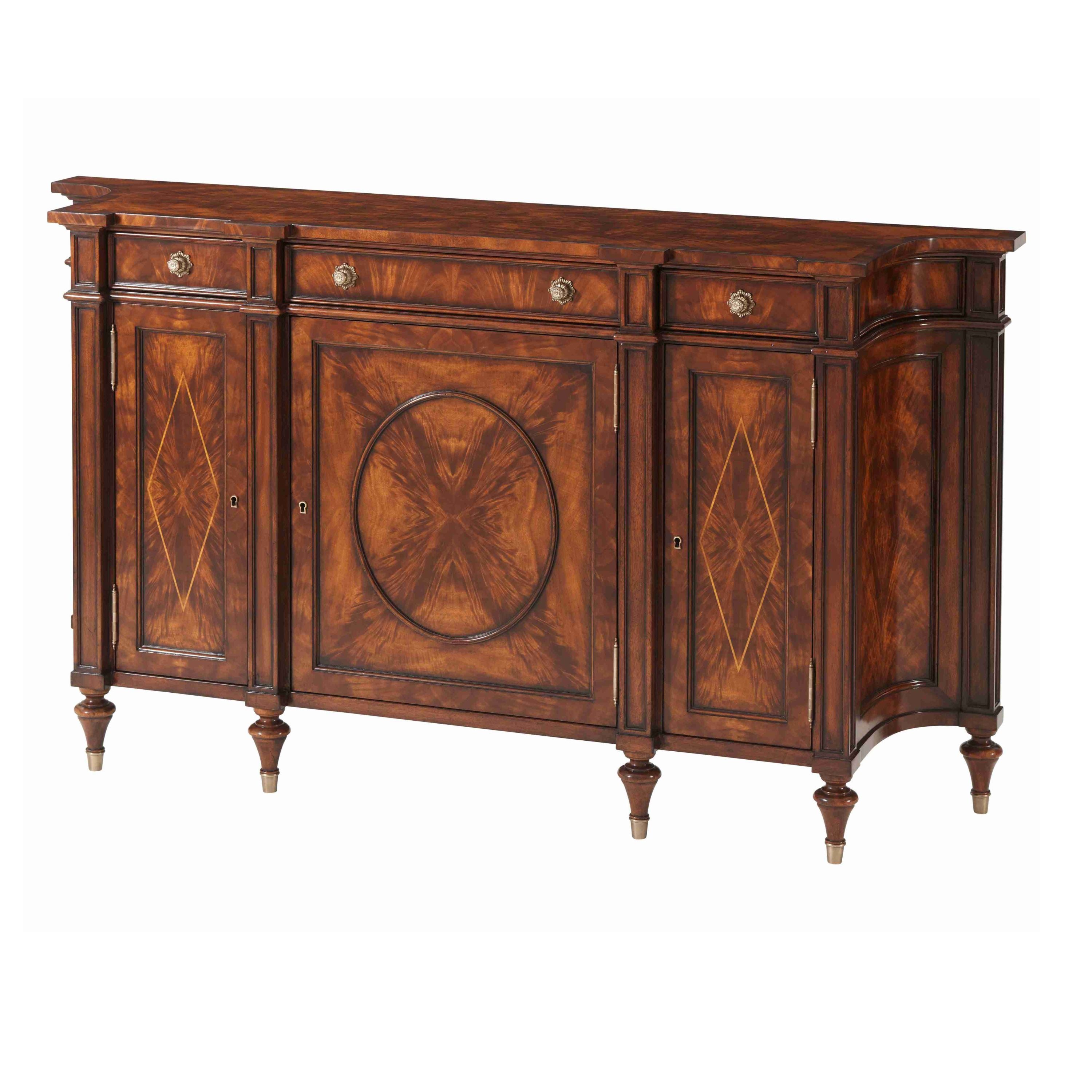 خزانة جانبية مصنوعة من خشب الماهوجني الفاخر، ومغطاة بقشرة من الخشب المزخرف بعقدة، مع ثلاثة أدراج مزخرفة فوق لوحة بيضاوية مقابلة وأبواب مزخرفة بشكل معين تحيط بأرفف قابلة للتعديل، ذات جوانب مقعرة، على أرجل مستديرة مع أغطية من النحاس.