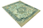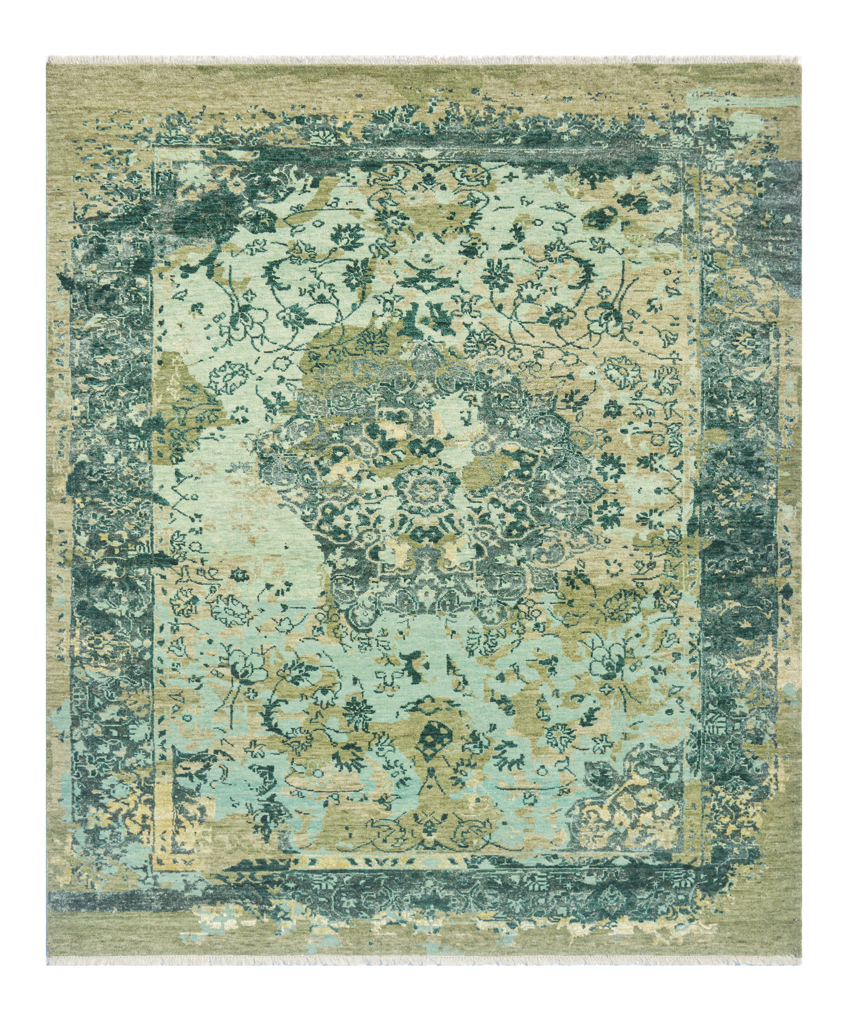 A richly layered composition of emerald, teal, and gold tones gives this hand knotted carpet a unique aged patina, reminiscent of antique Persian masterpieces. Crafted from 80% hand spun wool and 20% natural silk, its delicate floral medallion design exudes both tradition and contemporary edge. The silk accents offer a subtle shimmer, enhancing the piece’s textured elegance and bringing depth to any interior setting.