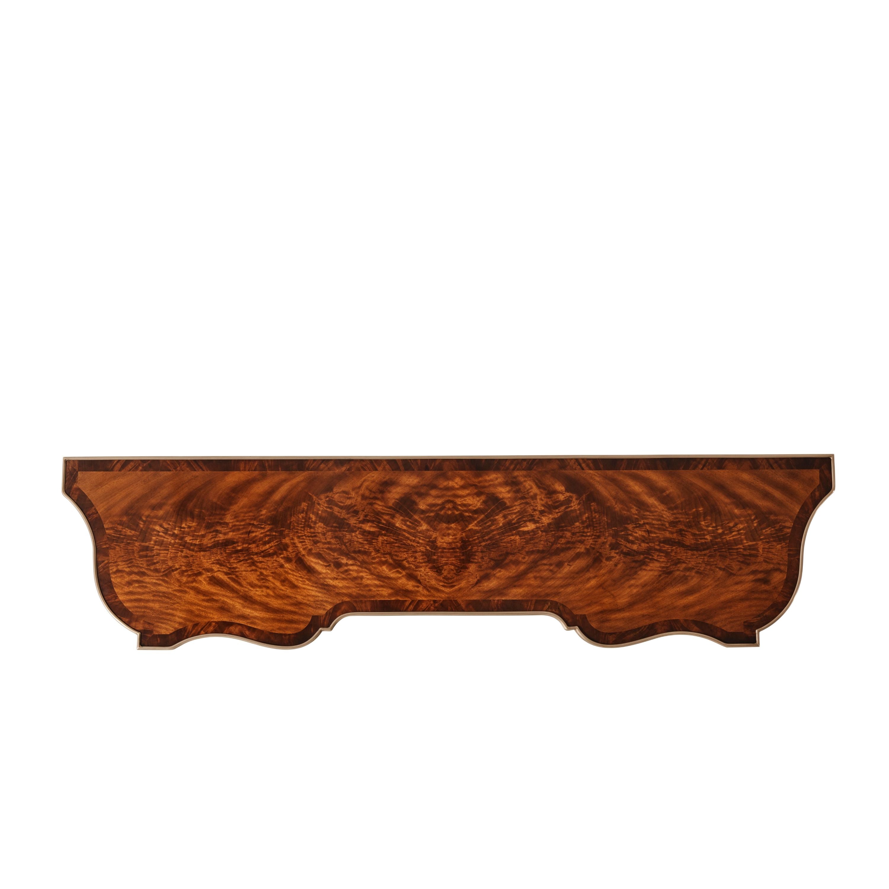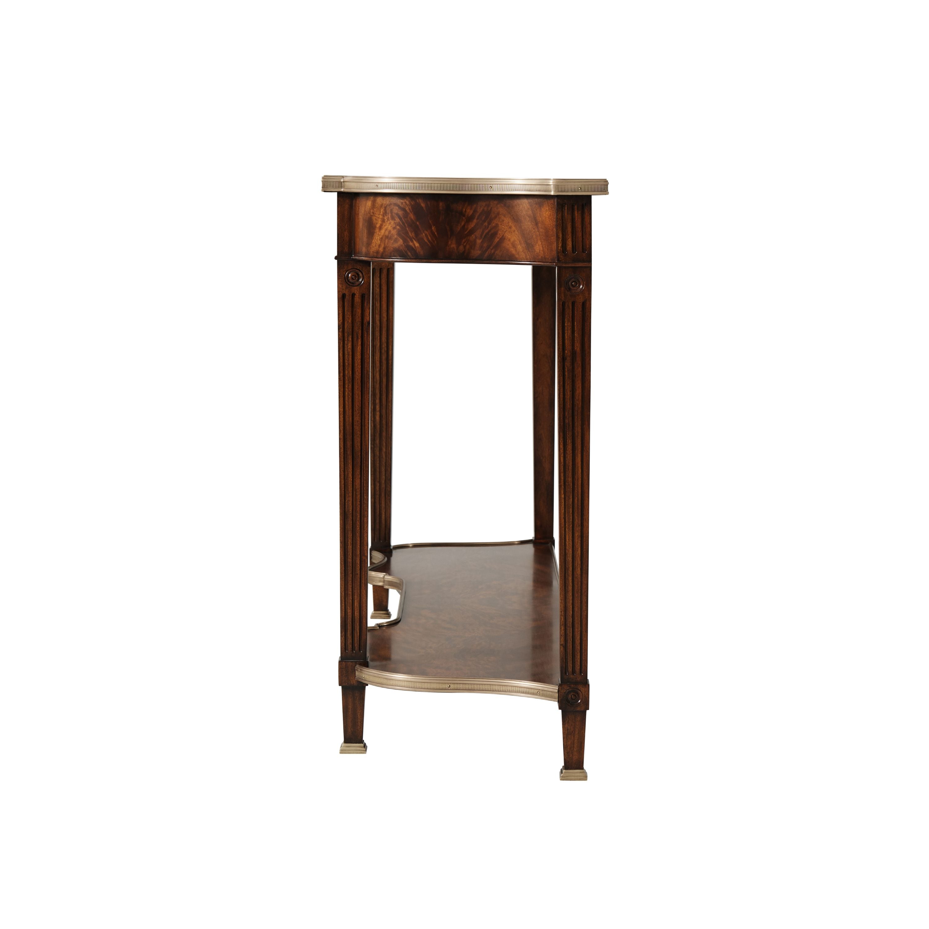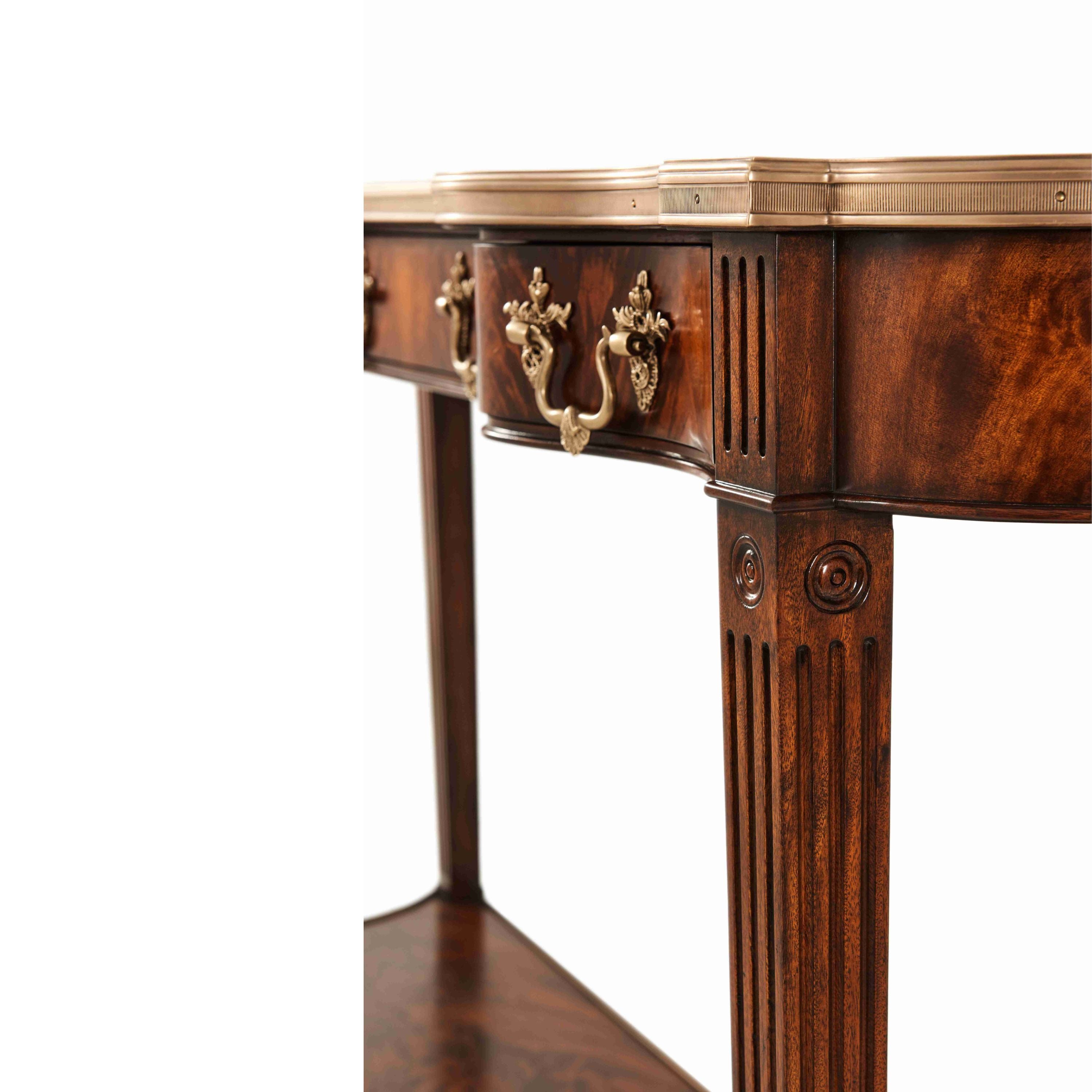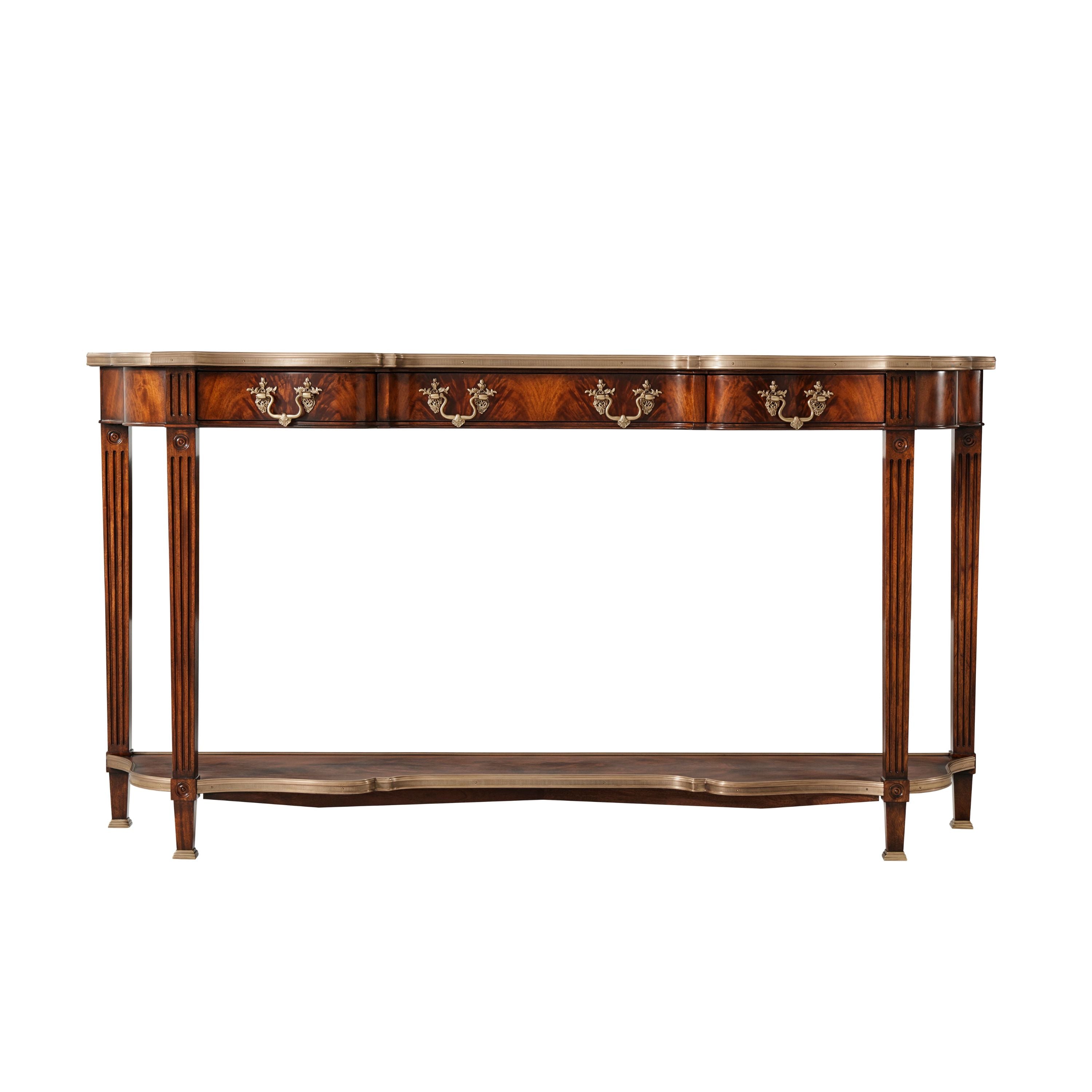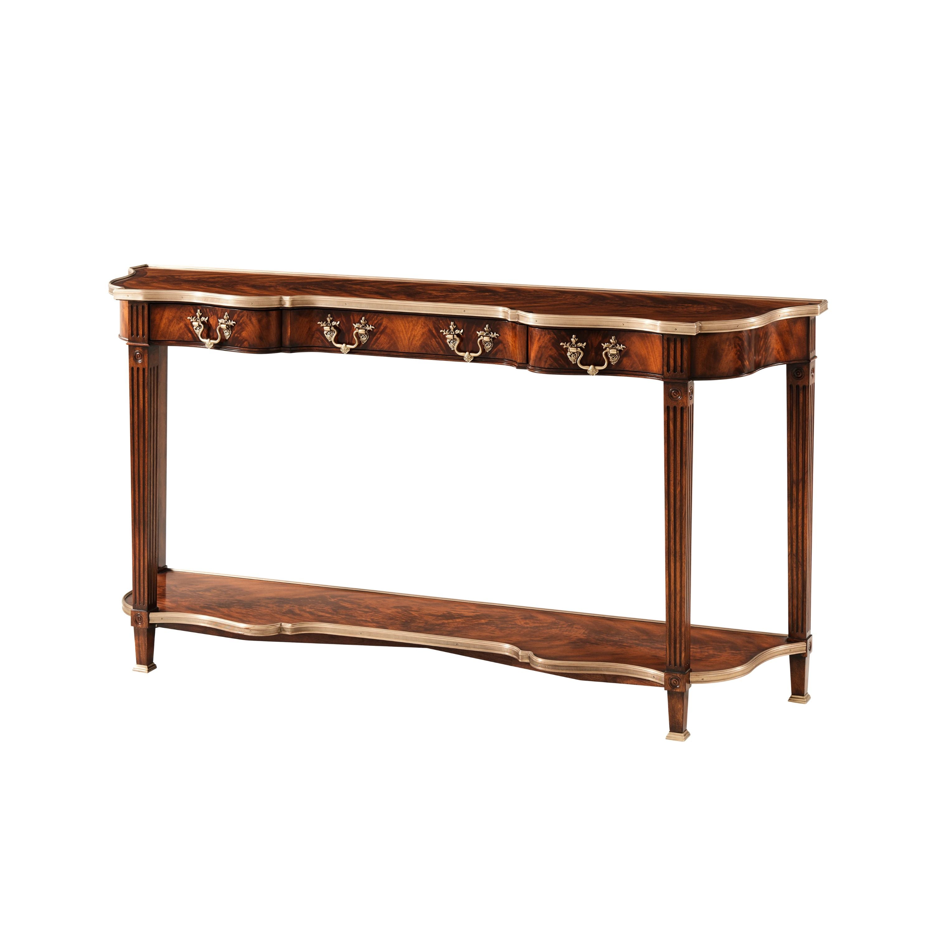 طاولة كونسول. سطح مكسو بقشرة لهب وأشرطة متقاطعة. لمسة نهائية من خشب الماهوجني رامزي. سطح من خشب السربنتين مُغلف بالنحاس. ثلاثة أدراج مزخرفة بزخارف روكاي. أرجل مزخرفة بزخارف مُضلّعة ودائرية، وقاعدة سفلية مُغلفة بالنحاس. أقدام نحاسية مُدرجة.