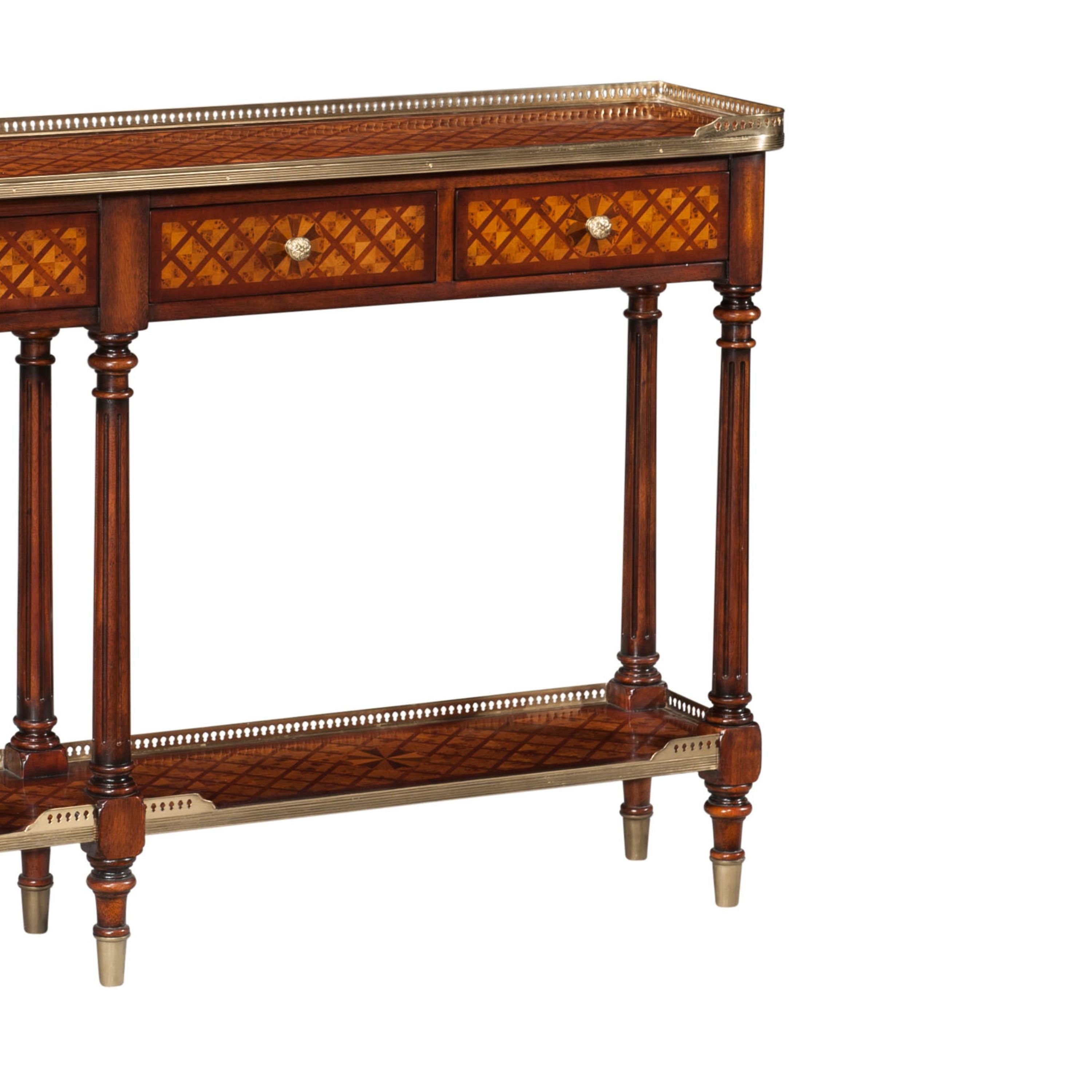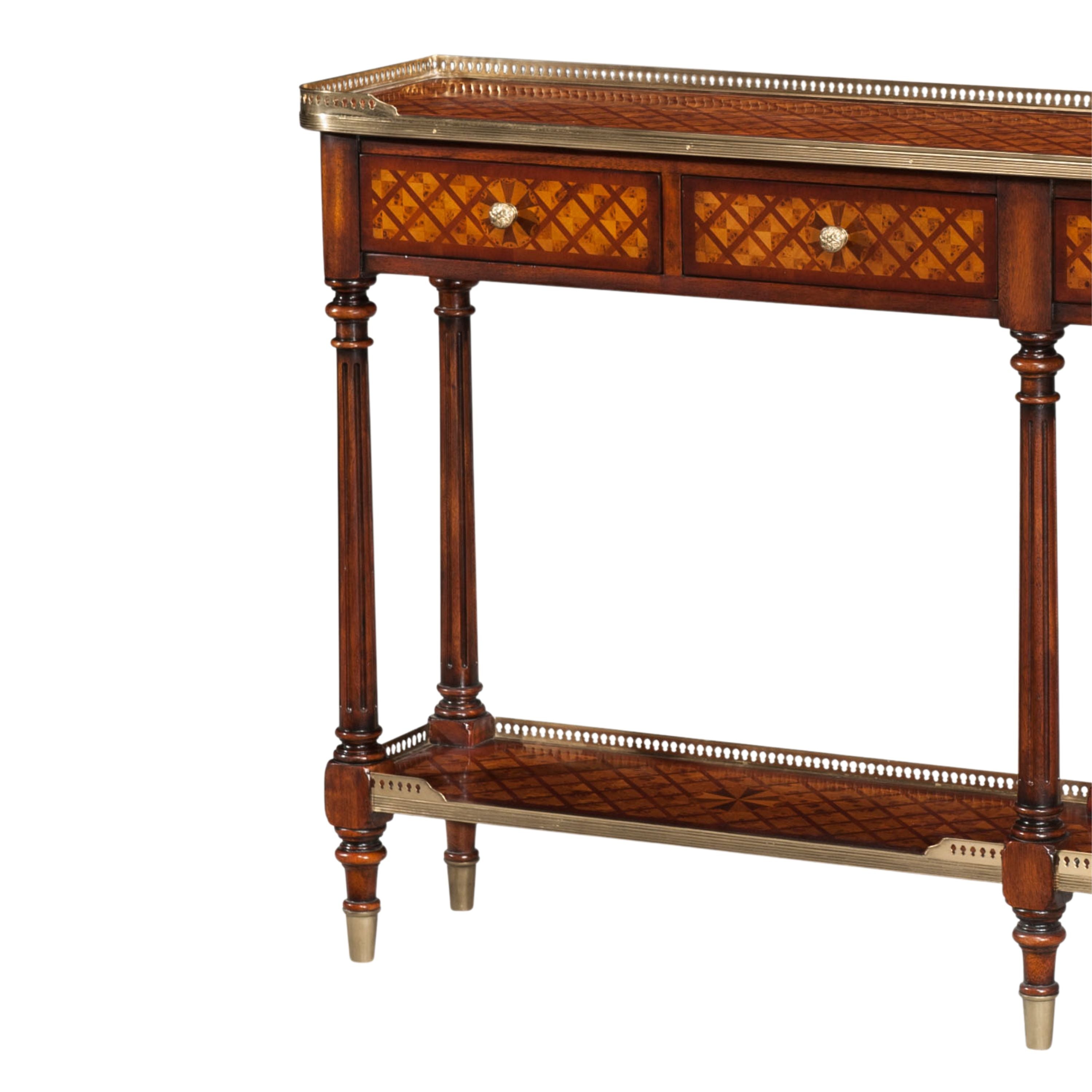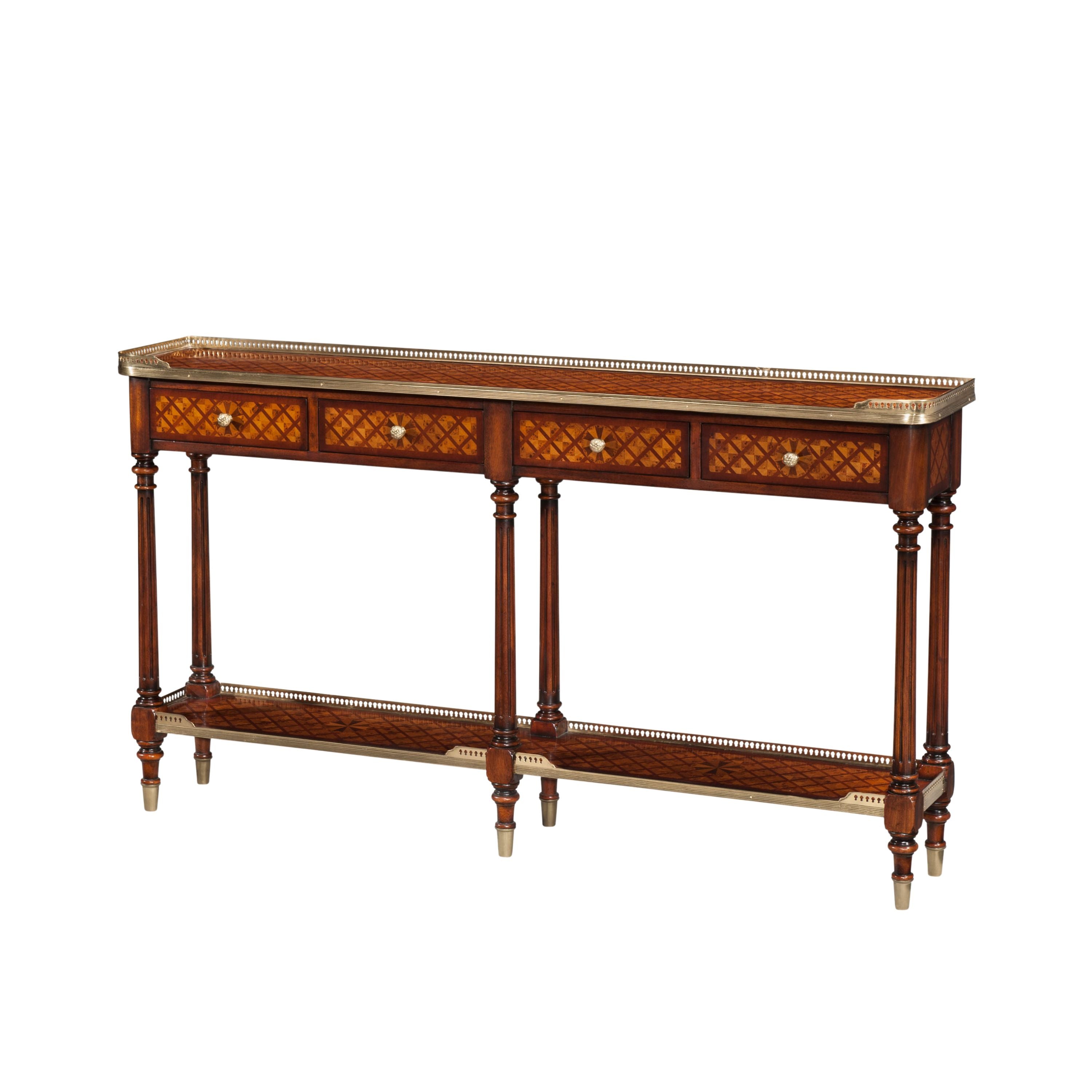 خشب باركيه شبكي، طاولة كونسول مثبتة بالنحاس، أربعة أدراج مزخرفة، على أرجل مخروطية ومضلعة متصلة بطبقة سفلية. لويس السادس عشر الأصلي.
