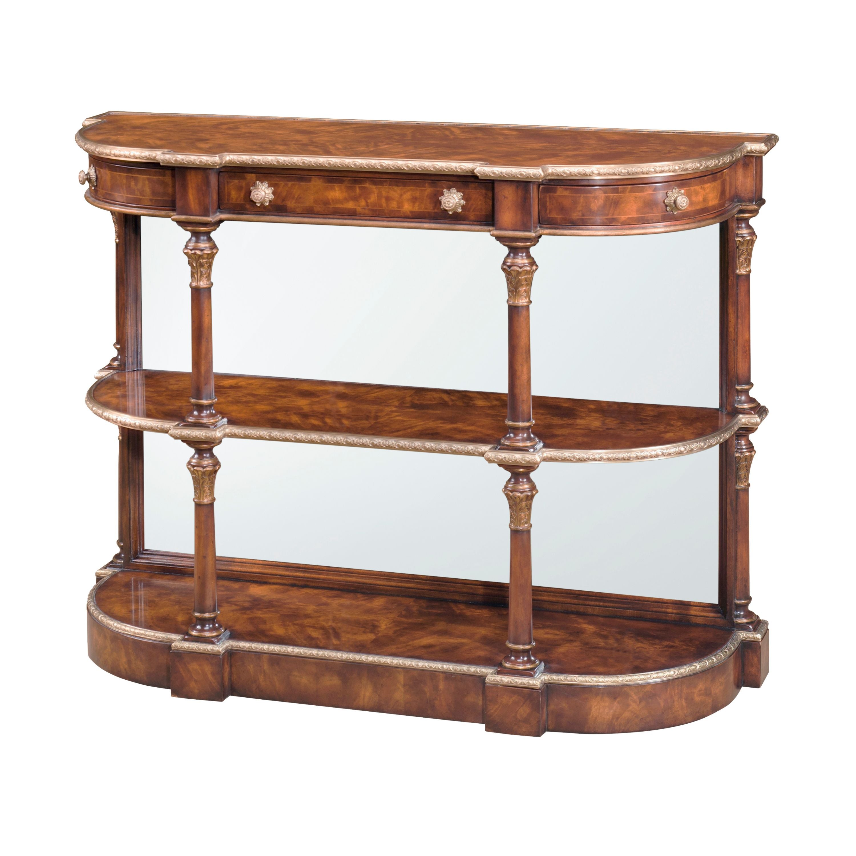 وحدة تحكم ذات مرآة خلفية من خشب الماهوجني والمذهب مهجورة، مع حافة مصبوبة بشكل جيد في الأعلى وطبقات أمامية مقوسة في الأسفل، والجزء العلوي مزود بثلاثة أدراج إفريز، على دعامات أعمدة كورنثية.