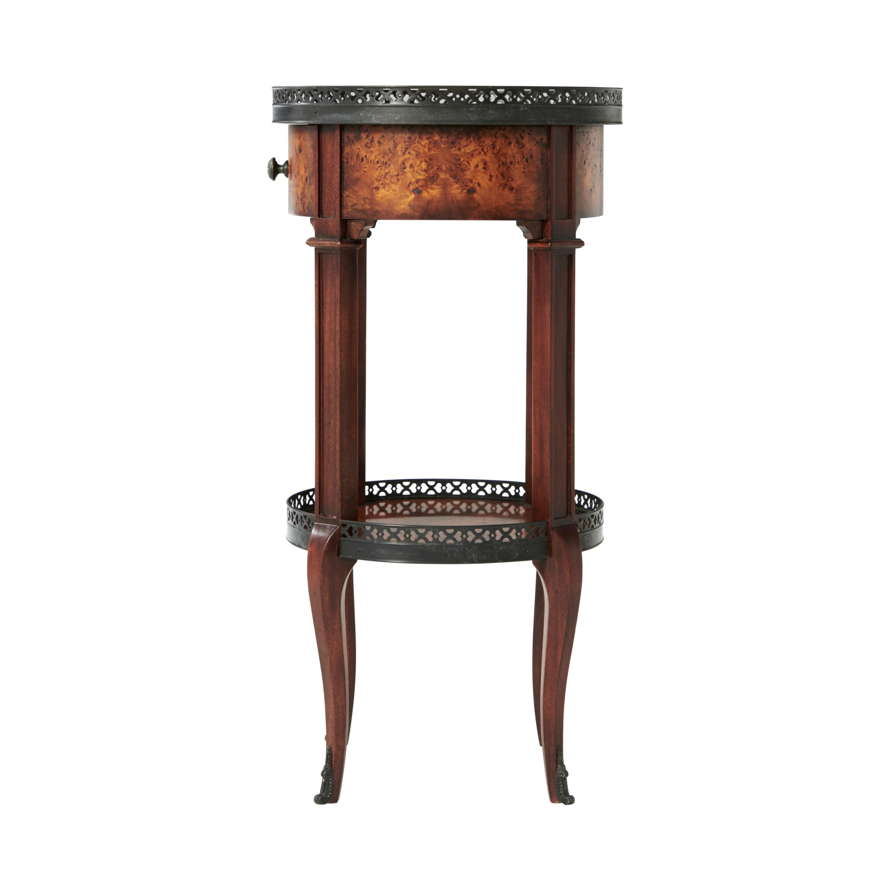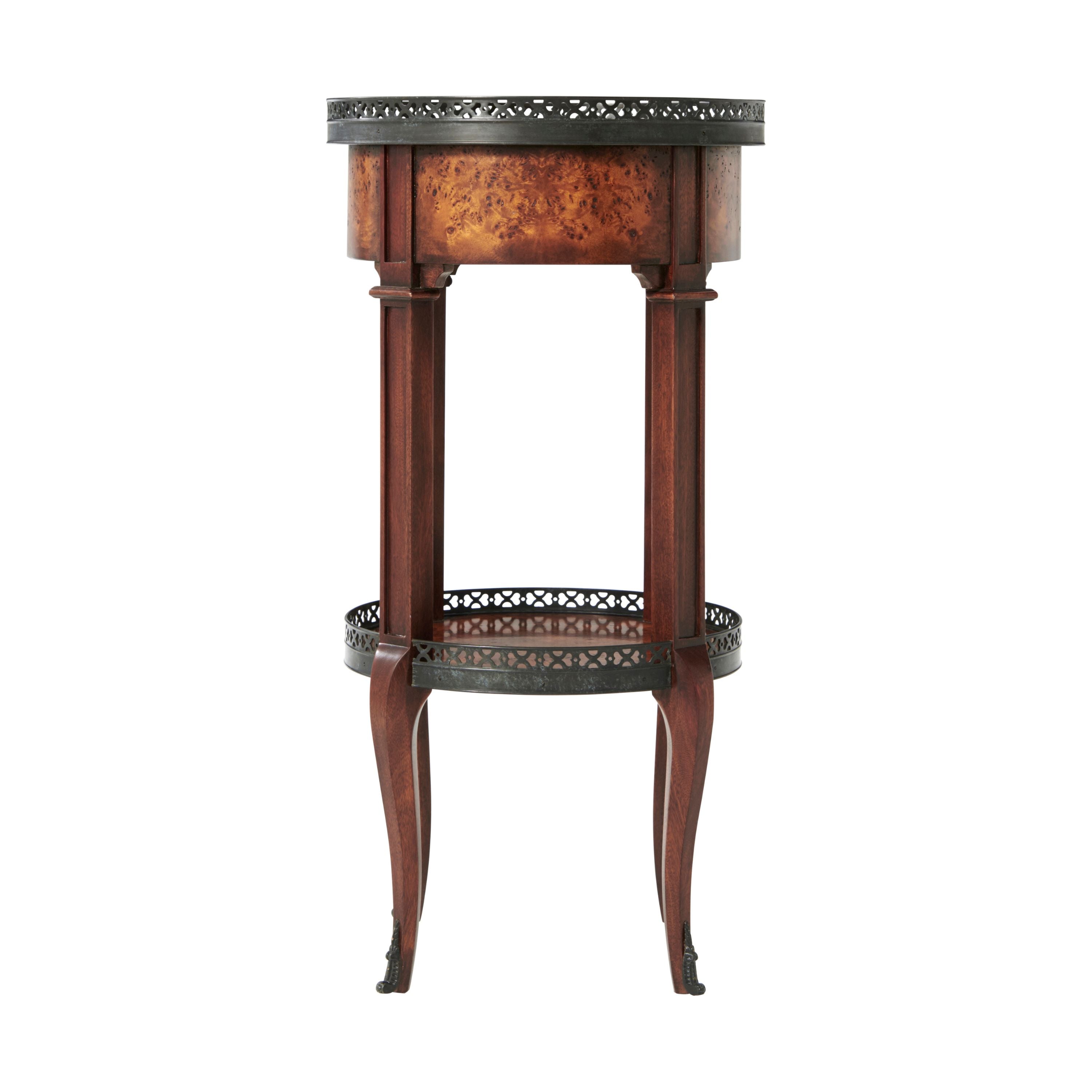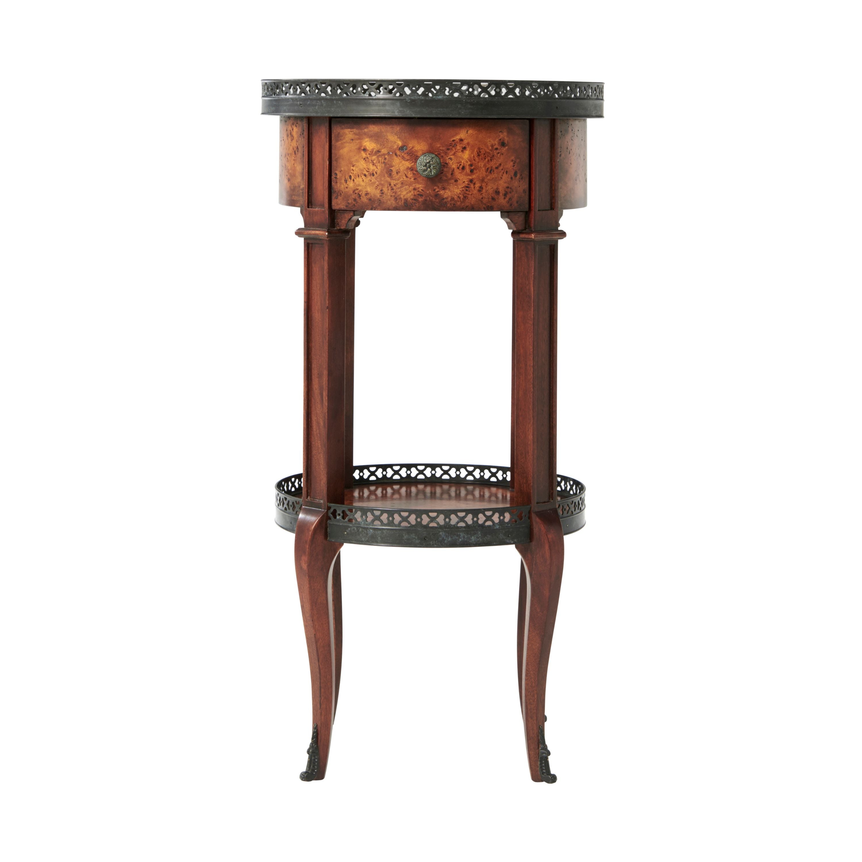طاولة مصباح دائرية من خشب الحور، سطحها من خشب الحور، مع رواق نحاسي مثقوب، وطبقة سفلية مشابهة فوق درج إفريز من خشب الحور مقوس، ودعائم مربعة ذات ألواح على أرجل منحنية تنتهي بقباقيب نحاسية. لويس السادس عشر الأصلي.