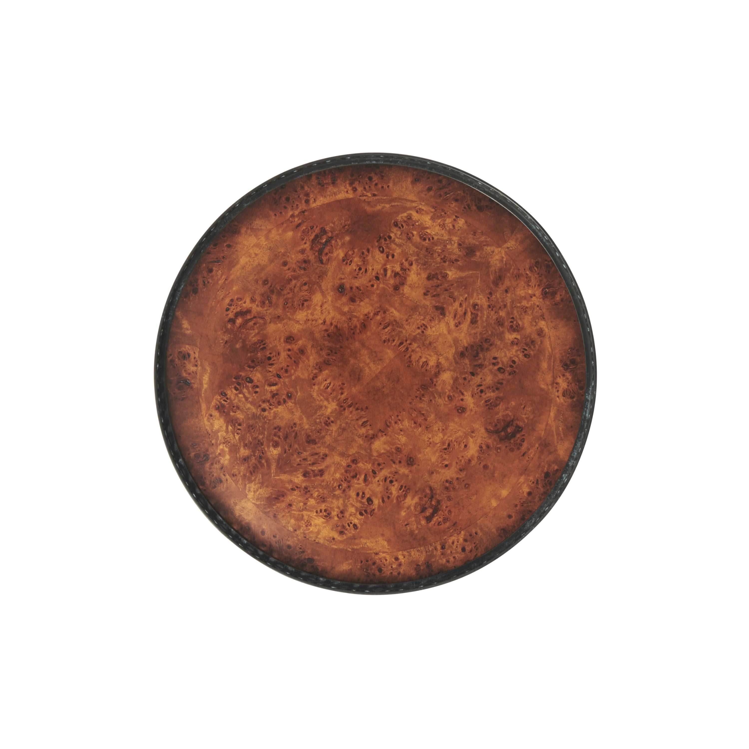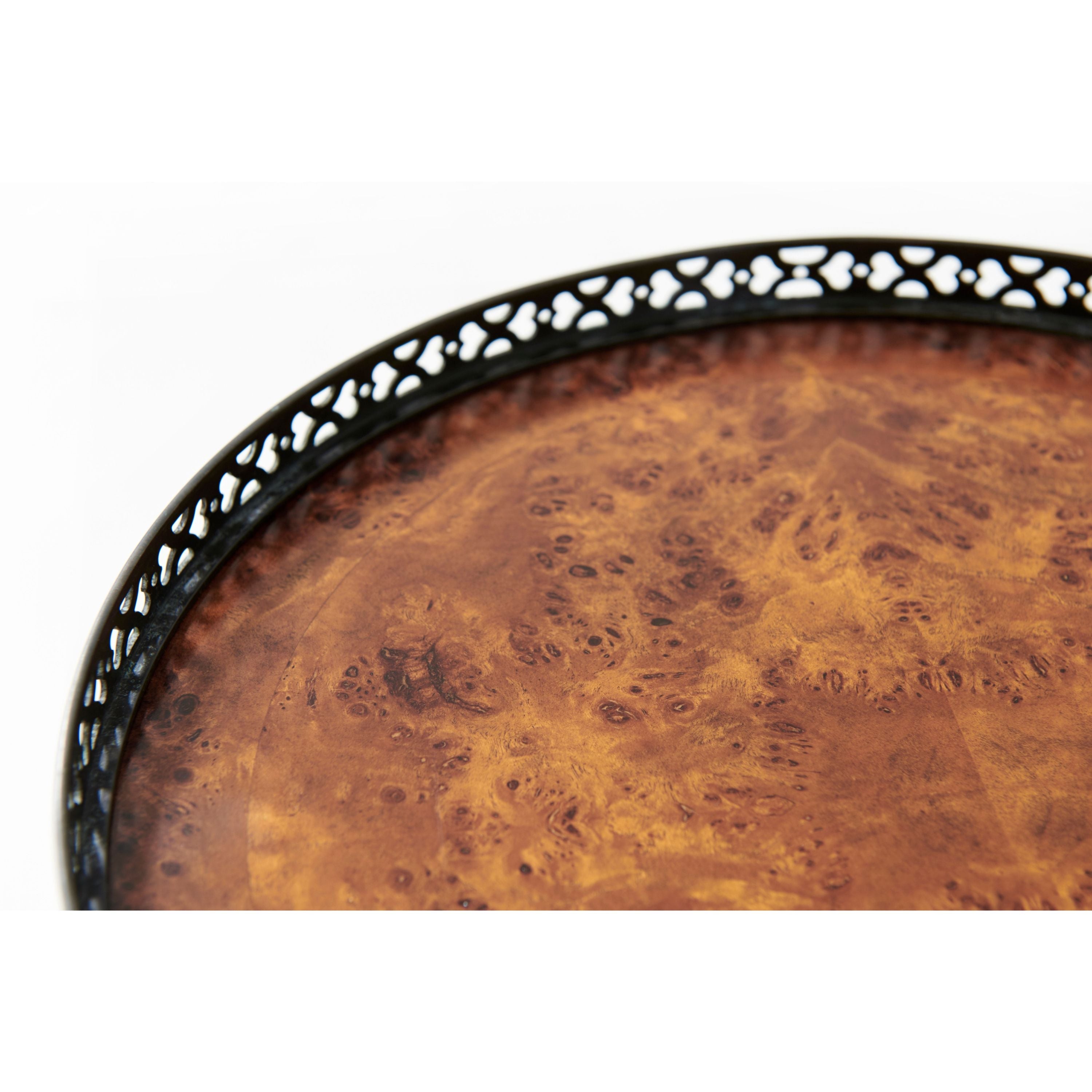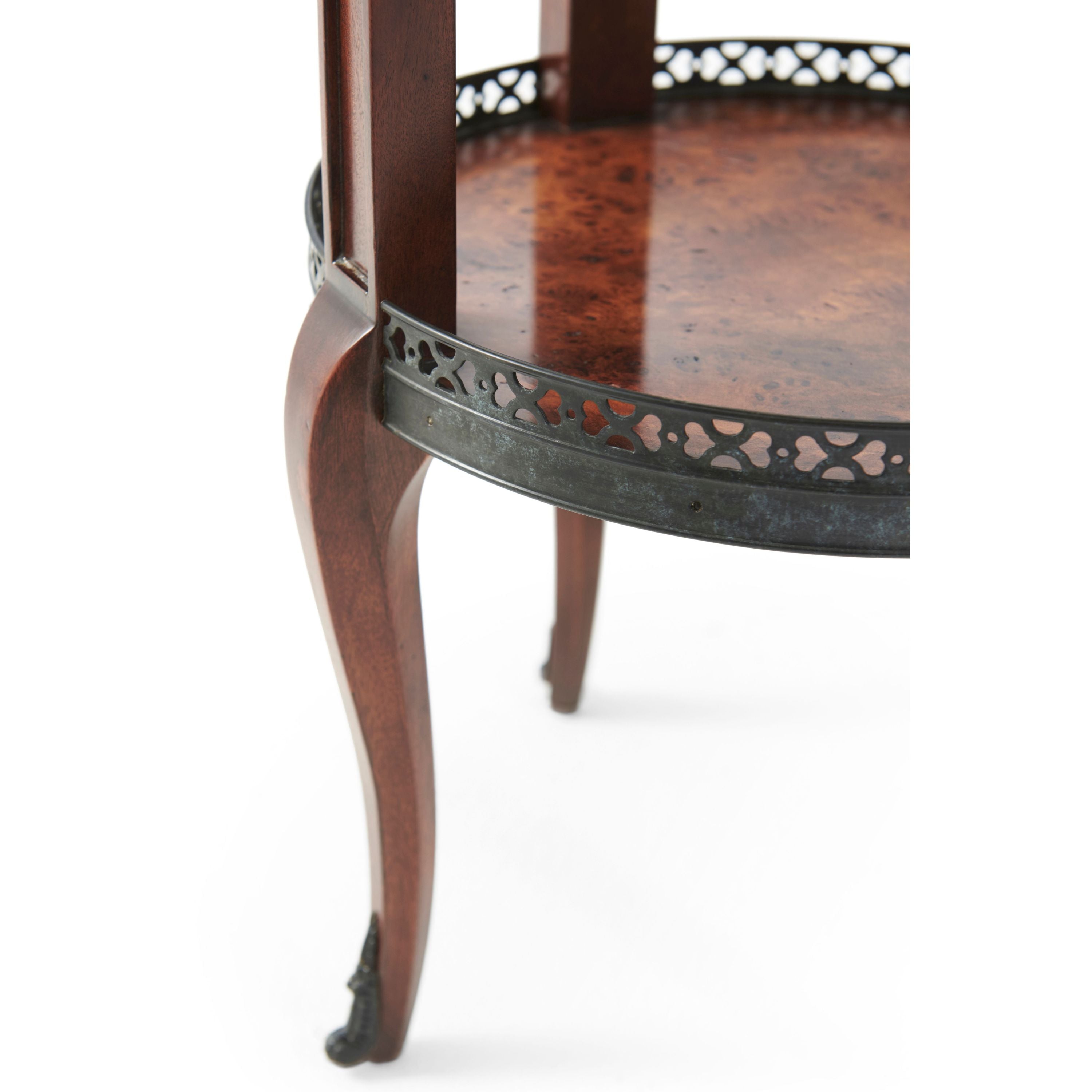 طاولة مصباح دائرية من خشب الحور، سطحها من خشب الحور، مع رواق نحاسي مثقوب، وطبقة سفلية مشابهة فوق درج إفريز من خشب الحور مقوس، ودعائم مربعة ذات ألواح على أرجل منحنية تنتهي بقباقيب نحاسية. لويس السادس عشر الأصلي.