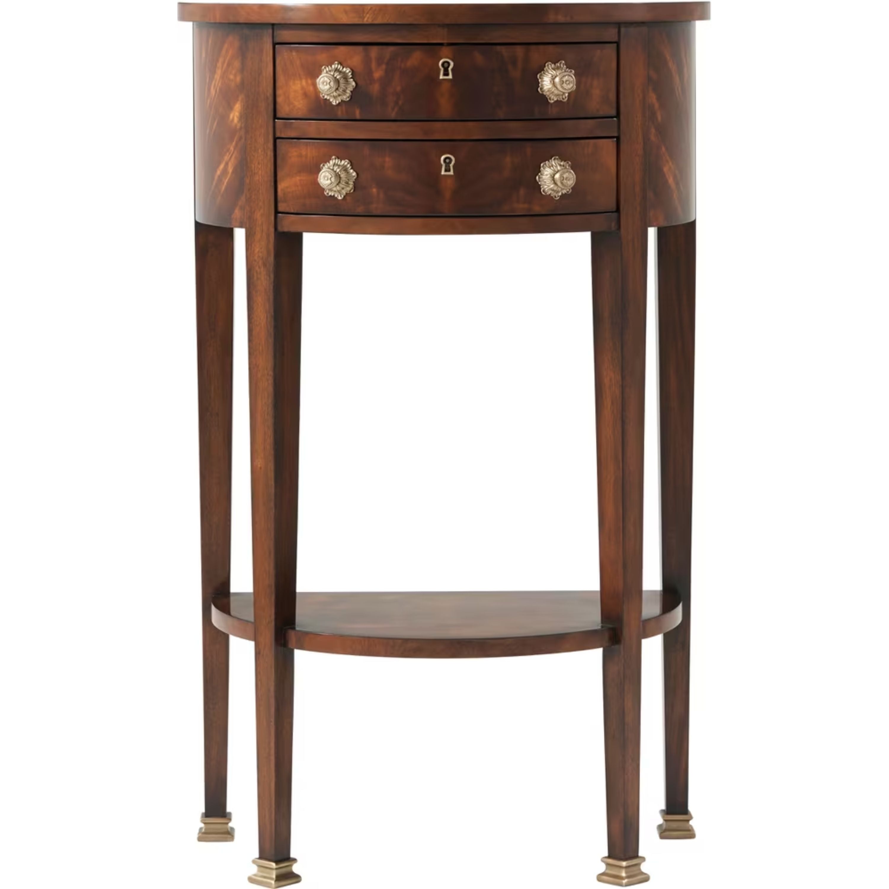وحدة تحكم نصف قمرية من خشب الماهوجني بأبعاد صغيرة، مزودة بدرجين مركزيين مزخرفين بمقابض وأقفال من النحاس، على أرجل مربعة مدببة تنتهي بأقدام من النحاس متصلة بطبقة سفلية.