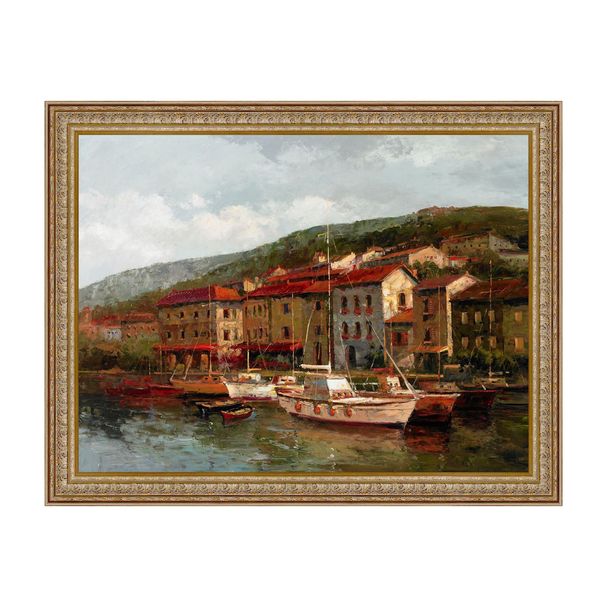 A charming Mediterranean harbor scene with fishing boats and yachts gently moored along the waterfront. Warm-toned buildings with red-tiled roofs line the shore, their reflections shimmering in the calm water beneath a softly lit evening sky.