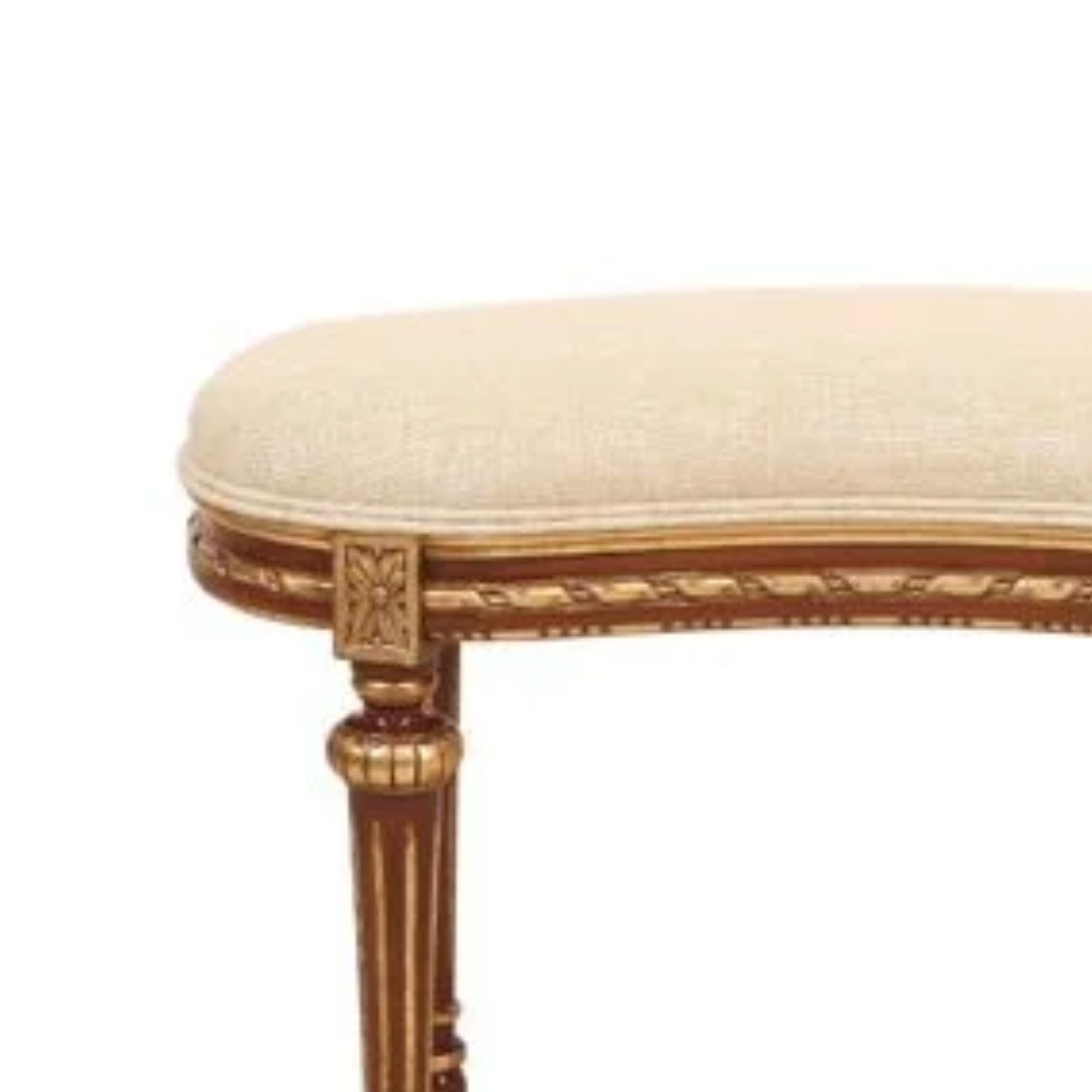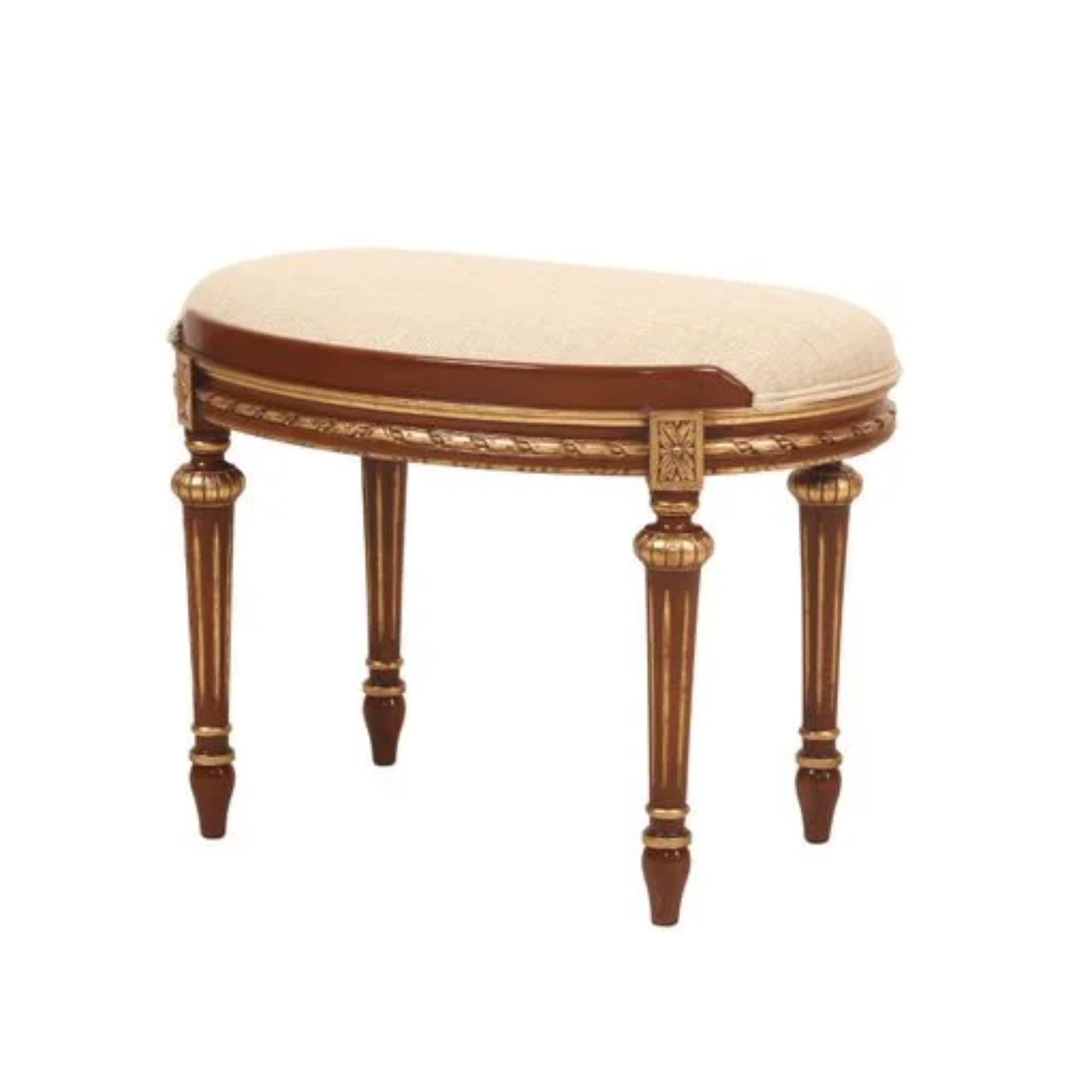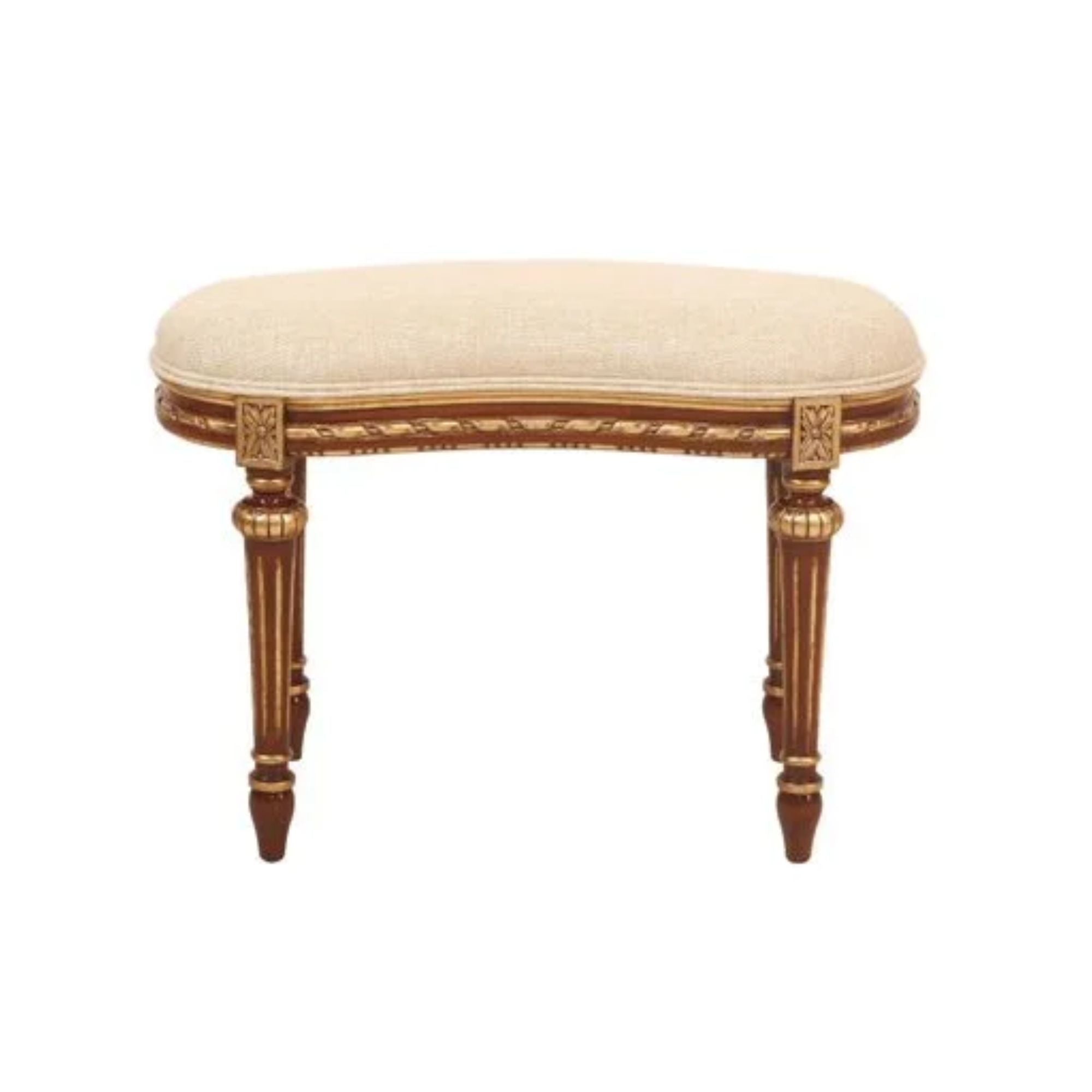 The Melissa Classic Upholstered Stool combines comfort with timeless elegance. Crafted from finely carved wood with golden accents, its gently curved frame and fluted legs showcase artisanal detailing. The plush upholstered seat offers both support and sophistication, making it a versatile addition to dressing tables, vanities, or as an accent in any refined interior.