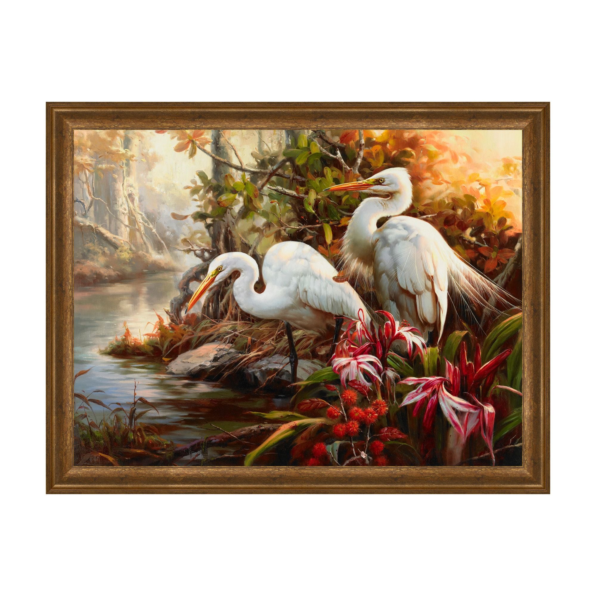 This captivating wall painting portrays two elegant white herons poised gracefully by a serene woodland stream.