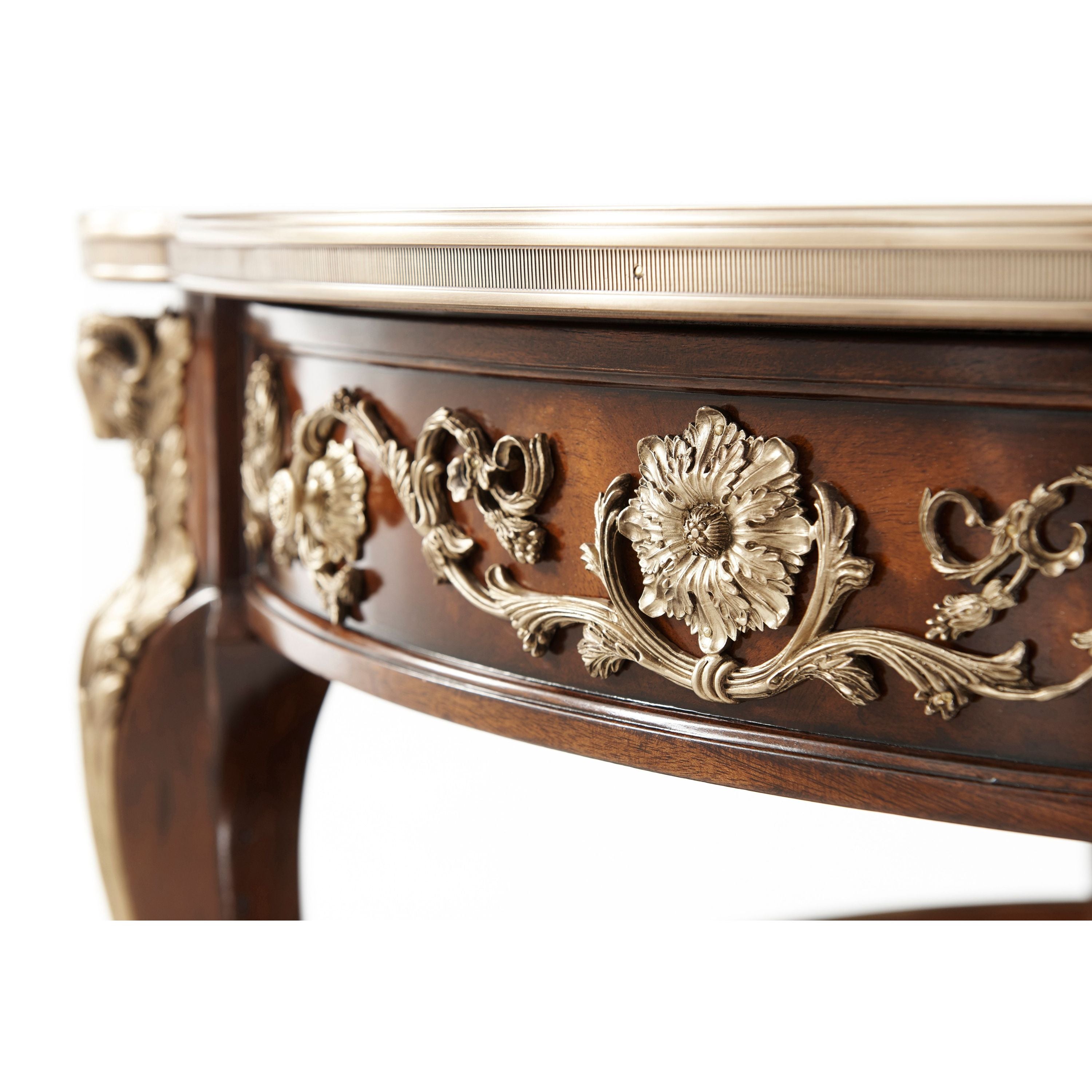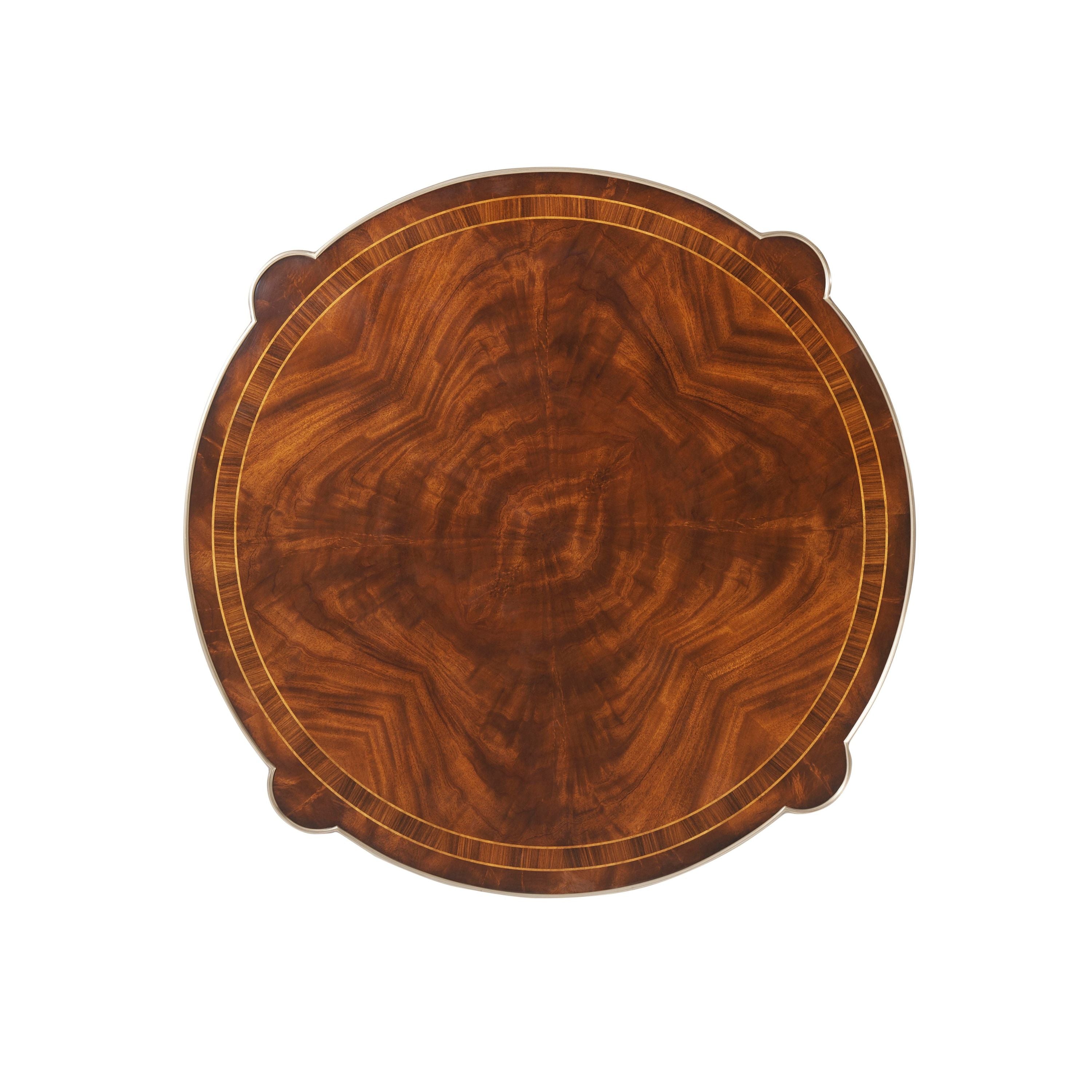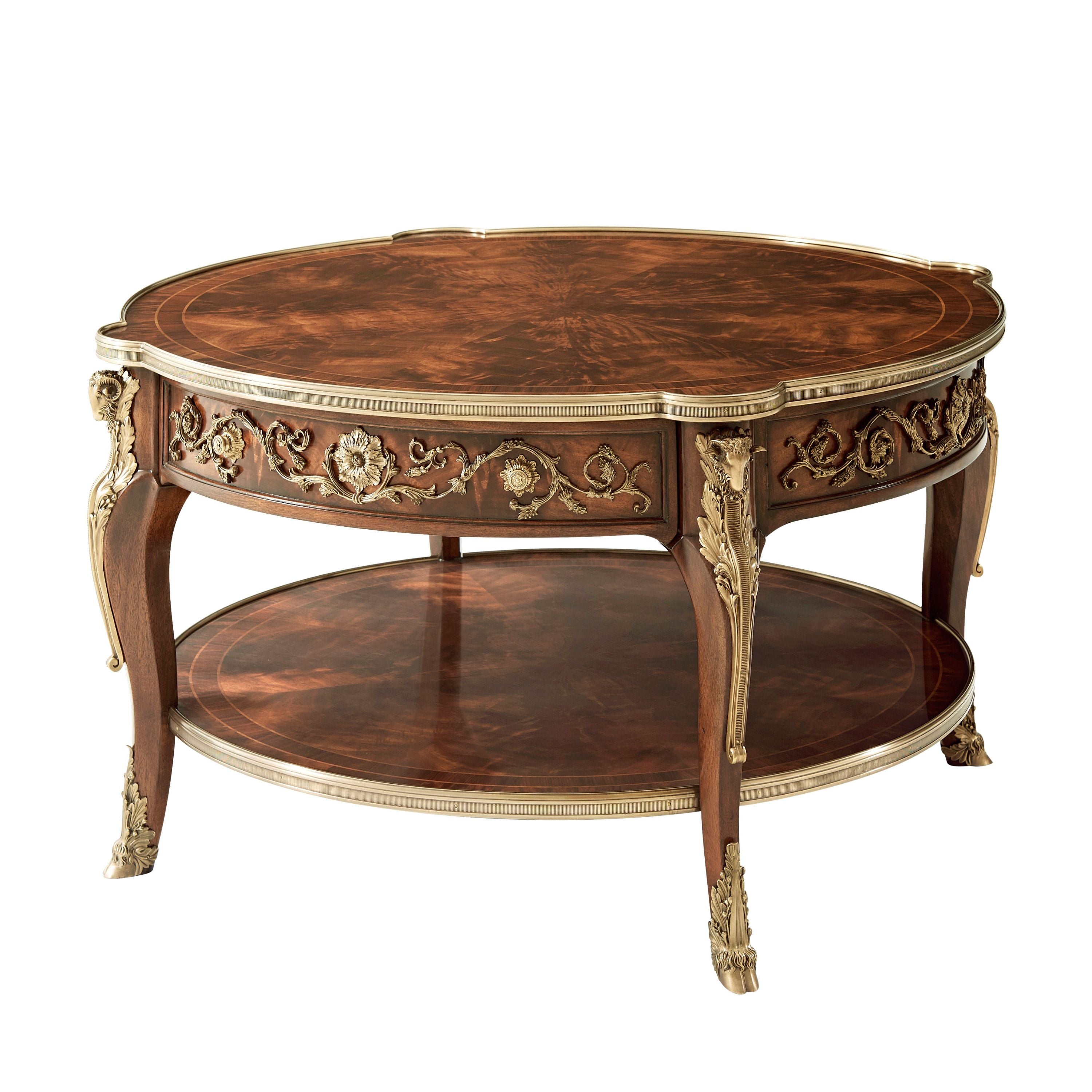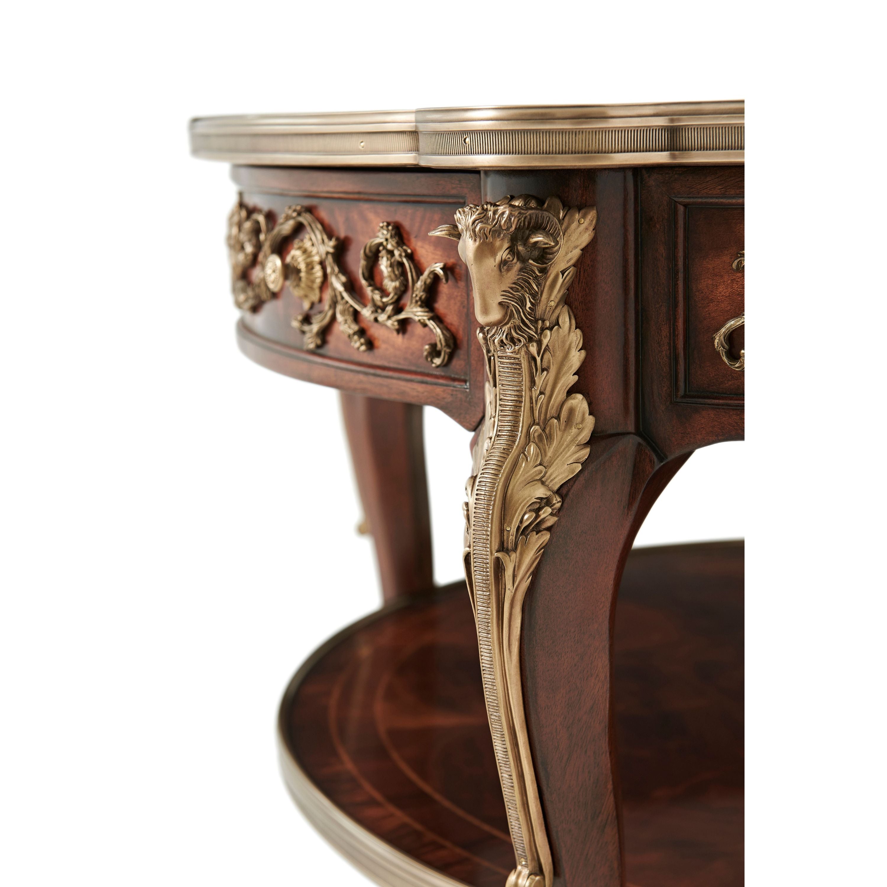 طاولة كوكتيل مصنوعة من خشب الماهوجني والمورادو مع حواف نحاسية دقيقة للغاية، الجزء العلوي دائري الشكل محاط بالنحاس مع زوايا بارزة، إفريز به درجان متقابلان، على أرجل تاج رأس الكبش متصلة بطبقة سفلية.