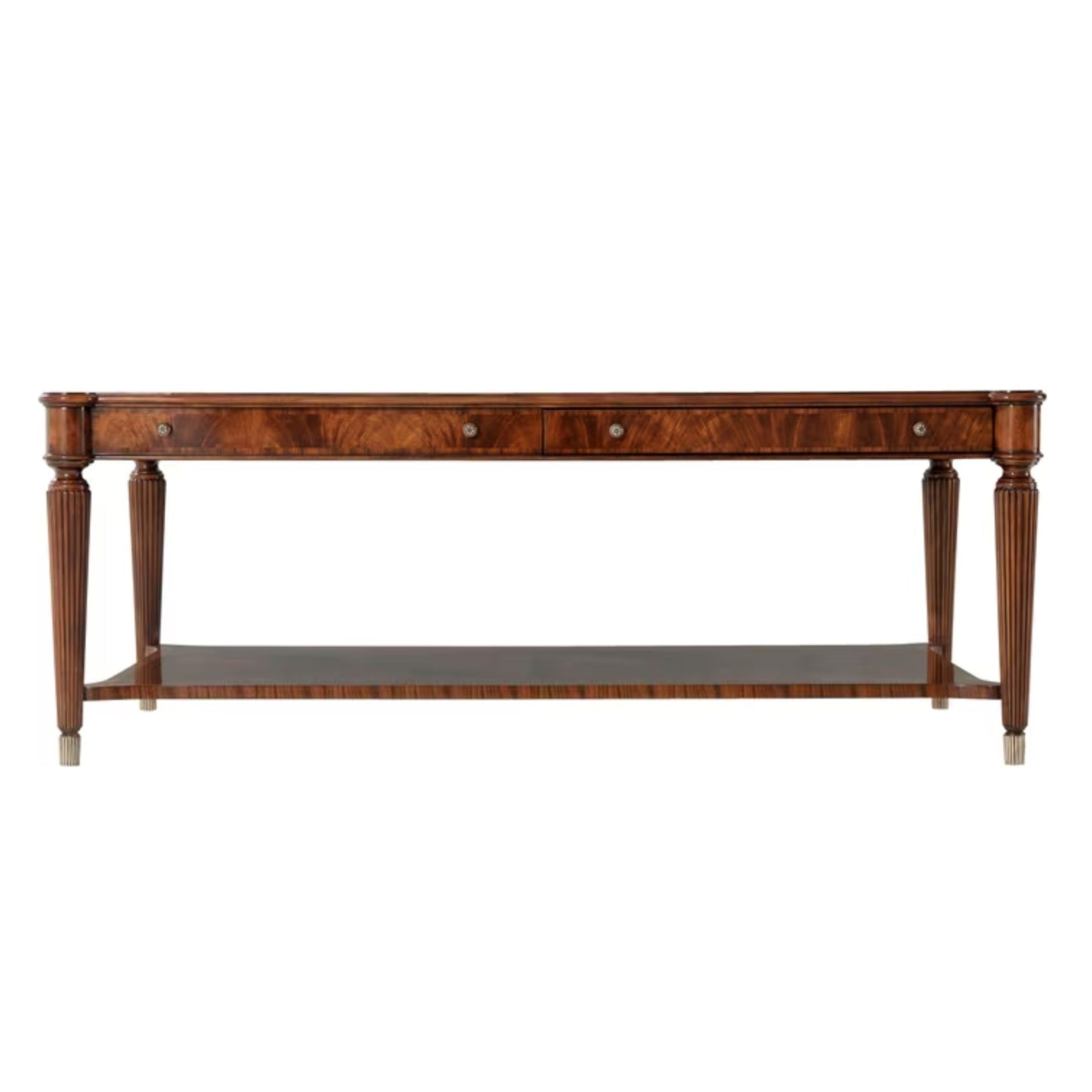 طاولة كوكتيل مصنوعة من خشب الساتان وخشب المورادو المتقاطع، ذات سطح مستطيل بزوايا بارزة مستديرة مع درجين جانبيين متقابلين ومتباعدين، على أرجل مخروطية مدببة ومضلعة متصلة بطبقة سفلية مقعرة الجوانب، على أقدام نحاسية.