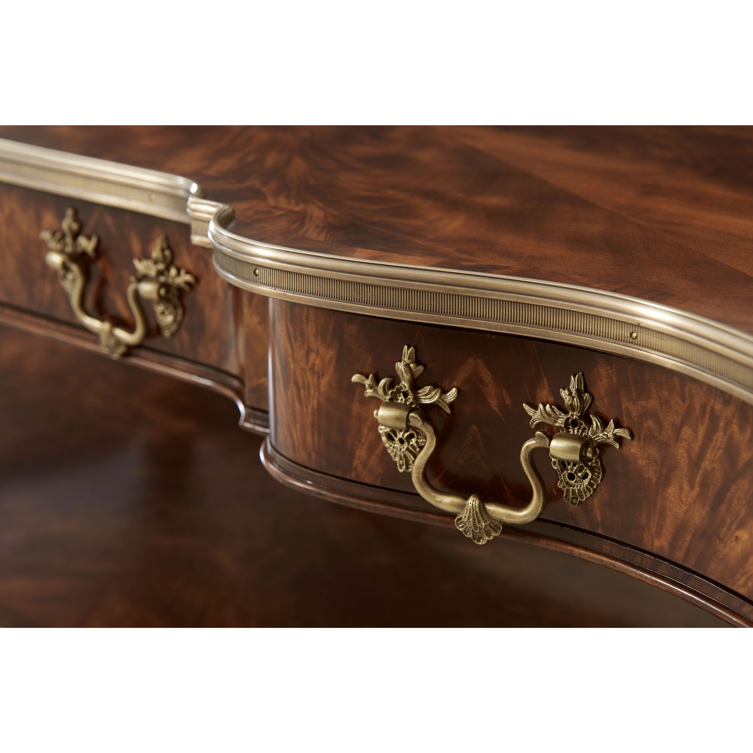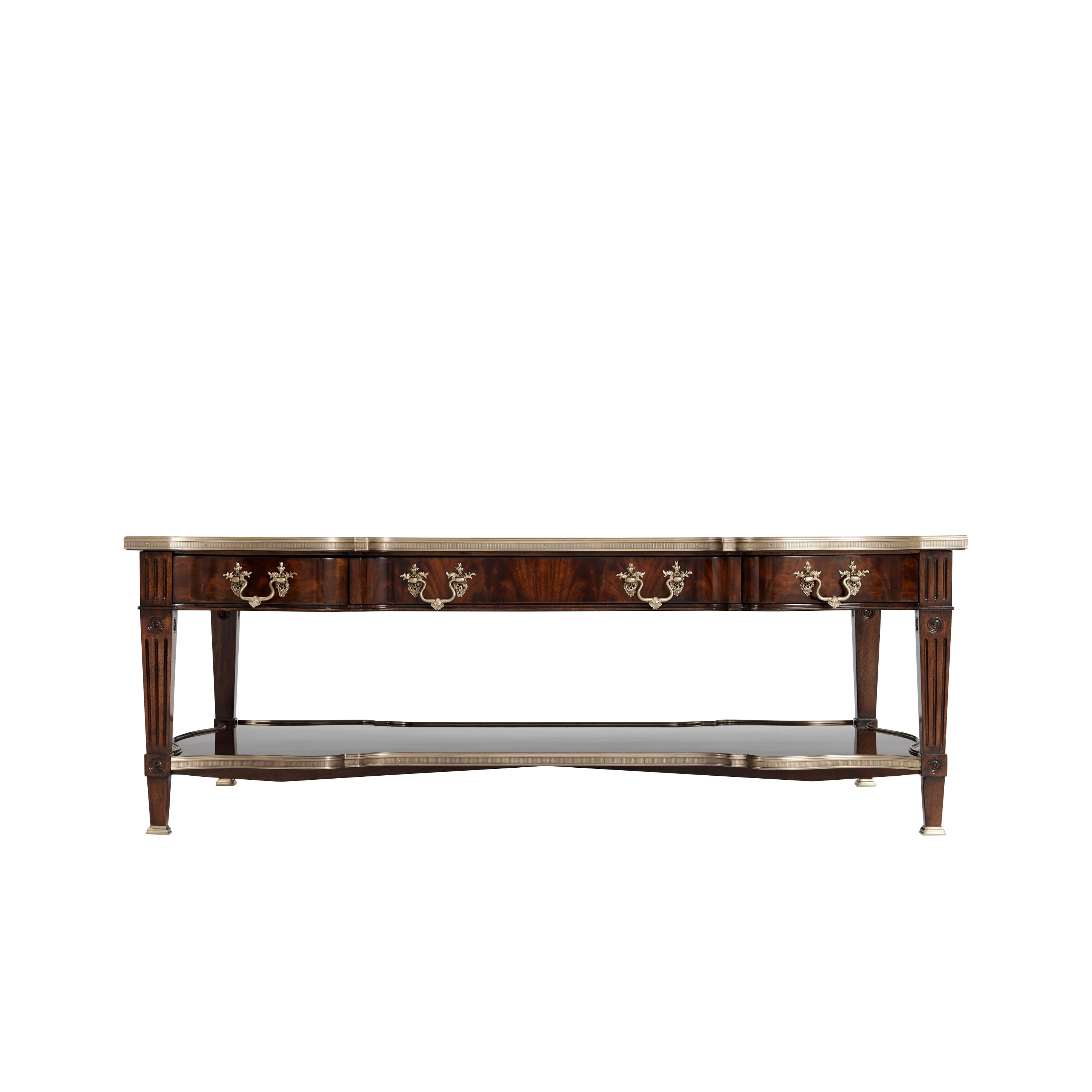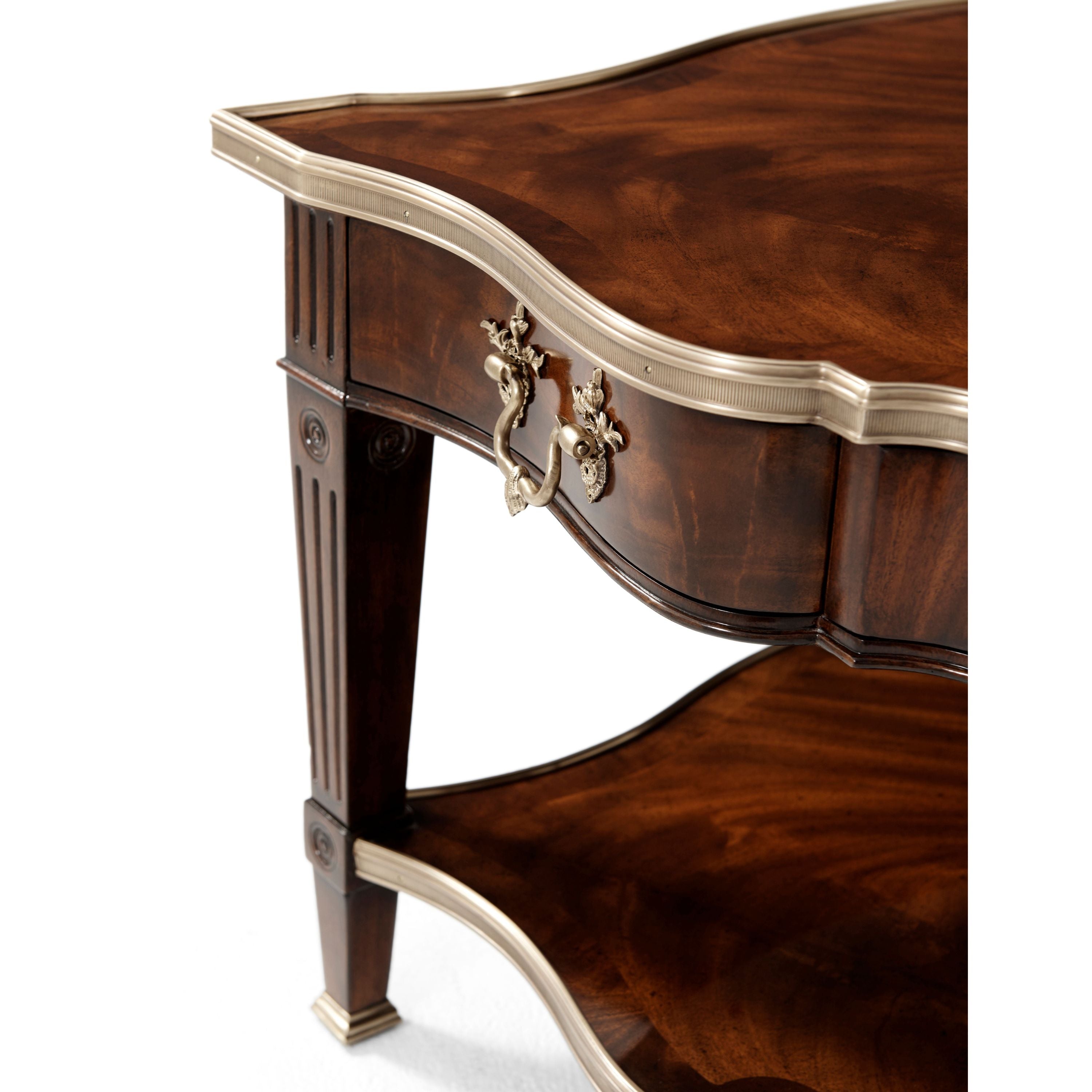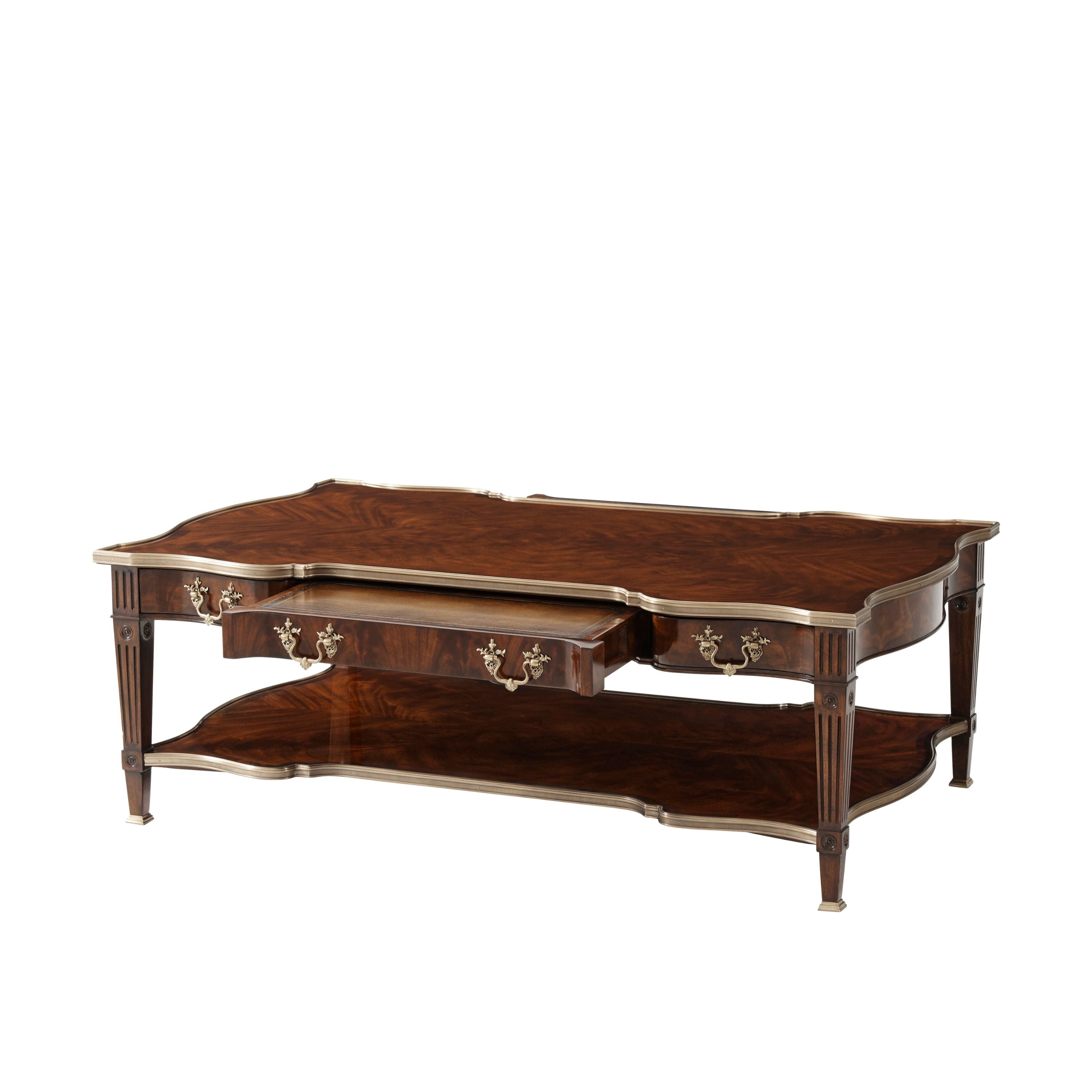 طاولة كوكتيل مصنوعة من الخشب الصلب ومغطاة بقشرة من اللهب، ذات سطح مغطى بطبقة من النحاس على شكل ثعبان فوق درجين على كل جانب، يتوسطهما درج منزلق من الجلد مع درج مخفي، وكلها بمقابض روكاي من النحاس، على أرجل مربعة مدببة ومزخرفة متصلة بطبقة سفلية مغطاة بطبقة من النحاس على شكل ثعبان.