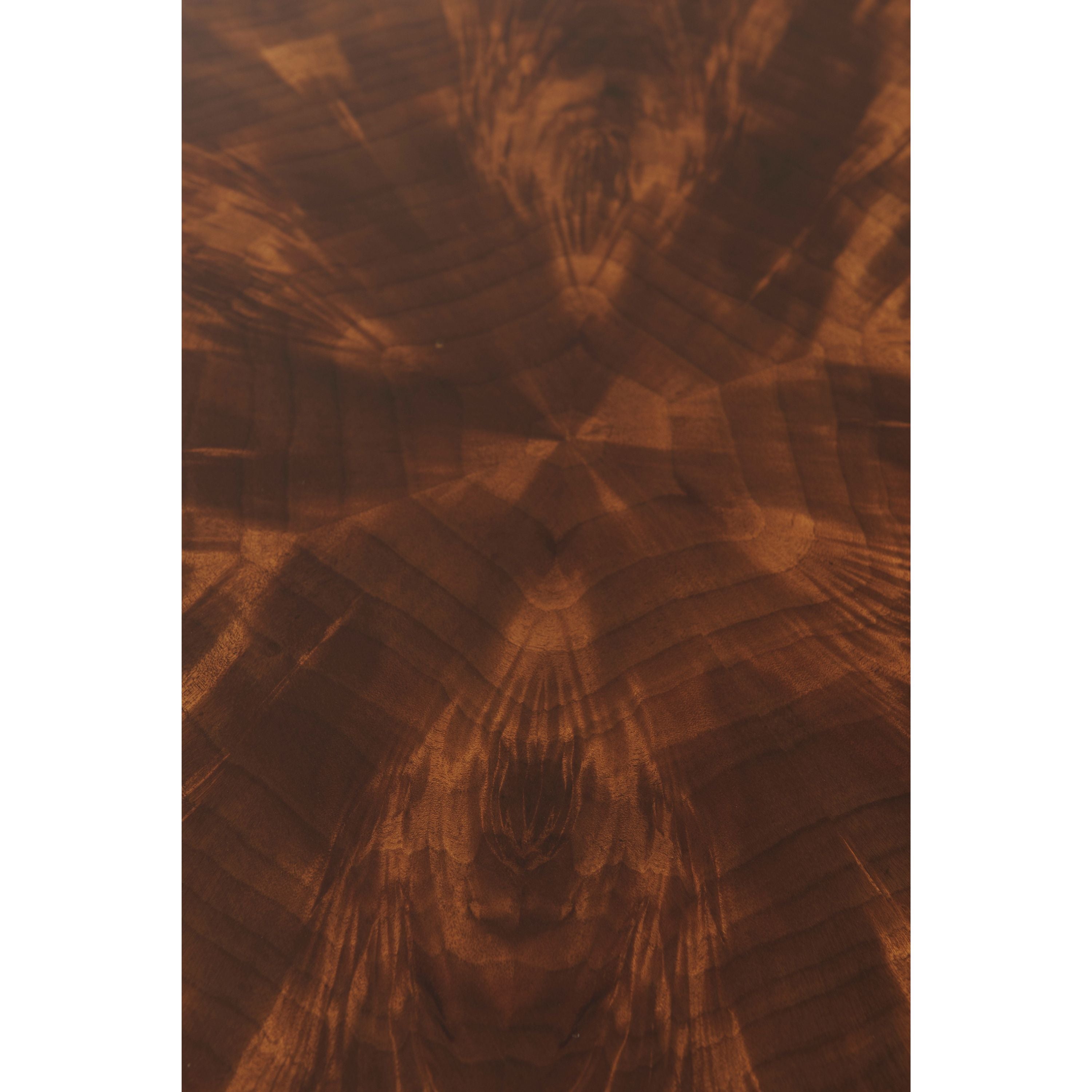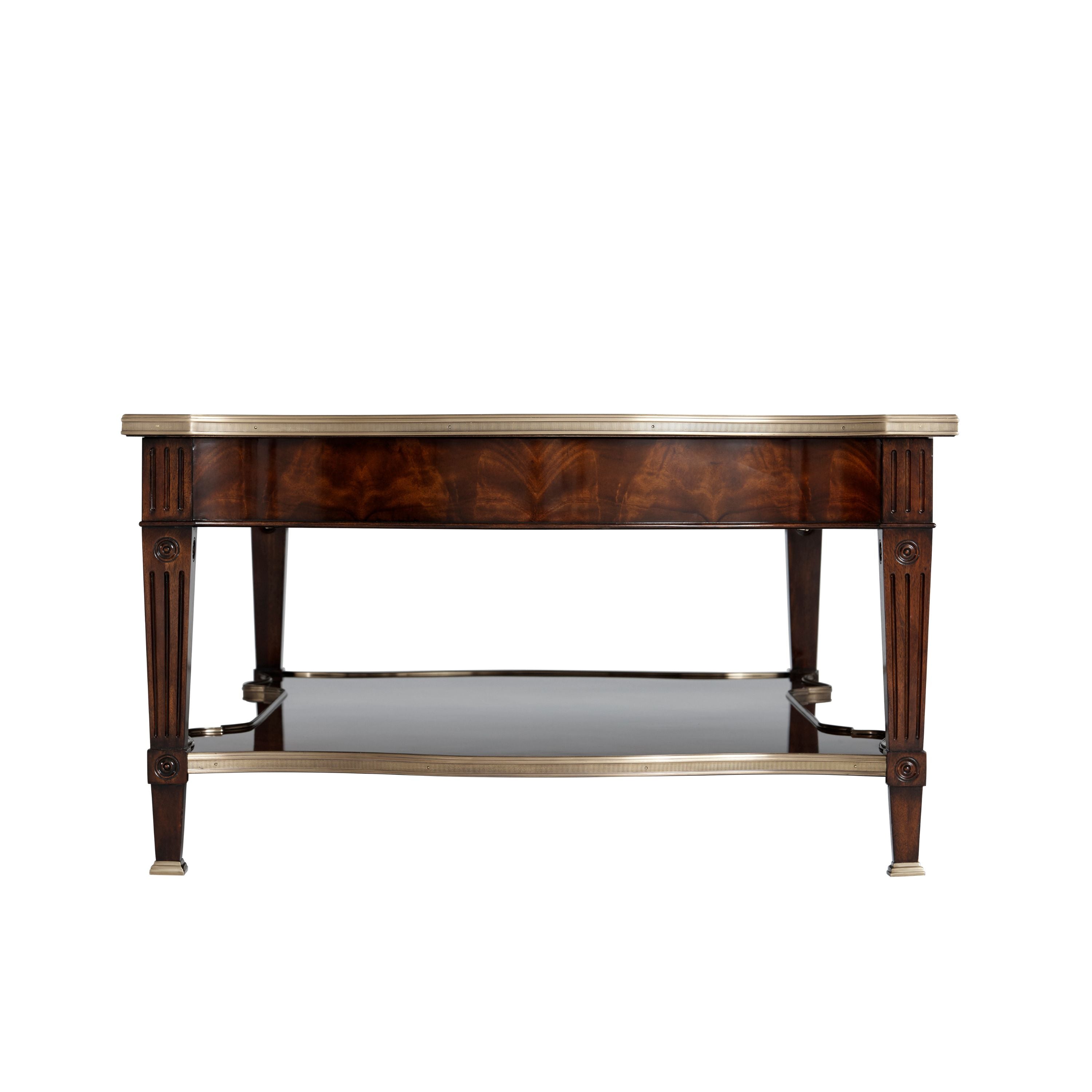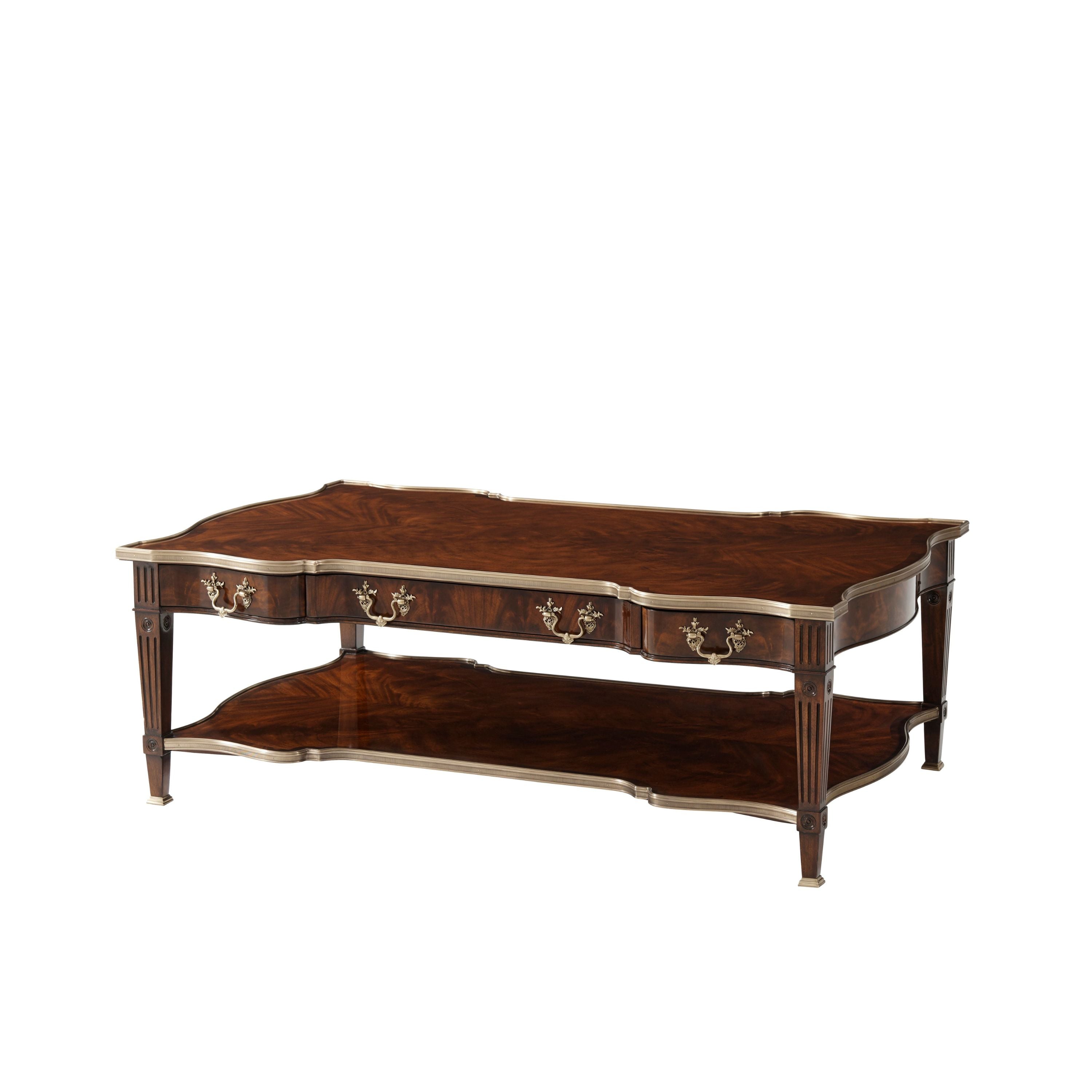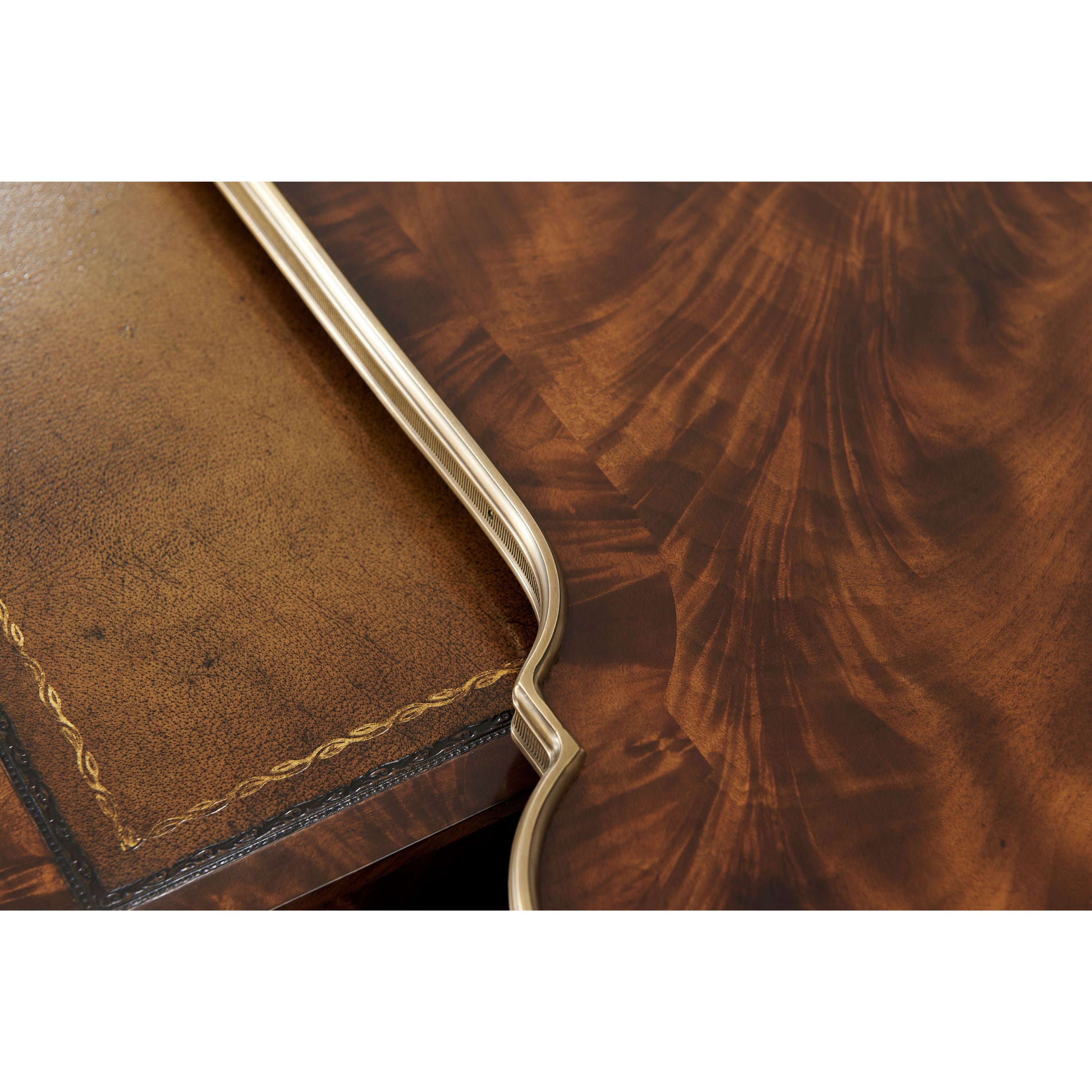 طاولة كوكتيل مصنوعة من الخشب الصلب ومغطاة بقشرة من اللهب، ذات سطح مغطى بطبقة من النحاس على شكل ثعبان فوق درجين على كل جانب، يتوسطهما درج منزلق من الجلد مع درج مخفي، وكلها بمقابض روكاي من النحاس، على أرجل مربعة مدببة ومزخرفة متصلة بطبقة سفلية مغطاة بطبقة من النحاس على شكل ثعبان.