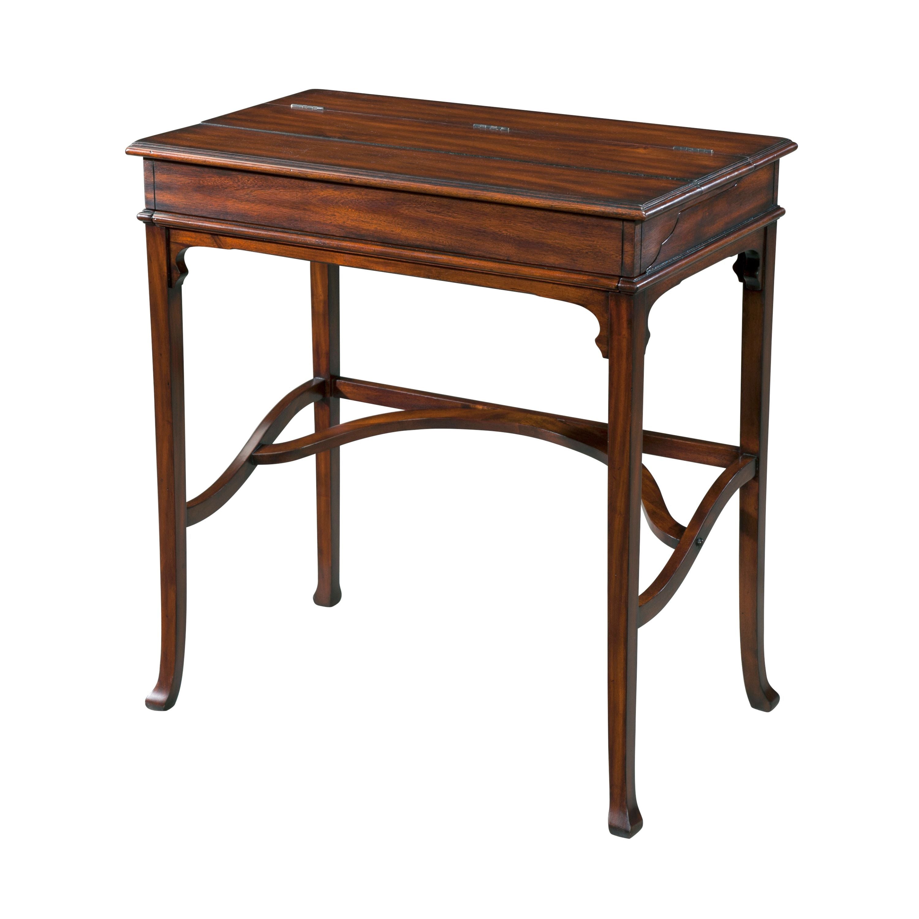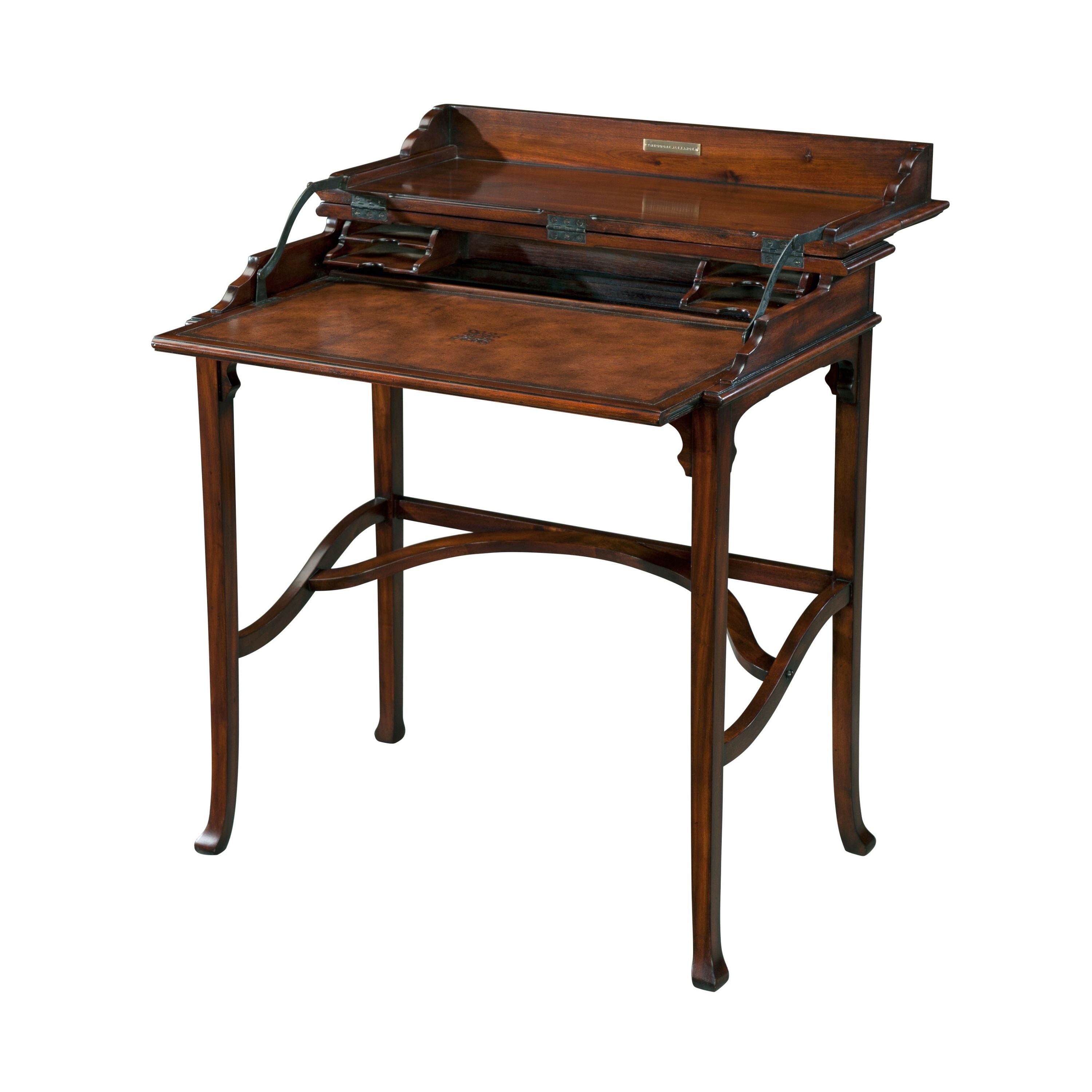 مكتب حملة، يكشف سطحه القابل للطي عن مساحة داخلية مُجهزة، وسطح كتابة جلدي، وأرجل متباعدة. تصميمه الأصلي من العصر الفيكتوري.