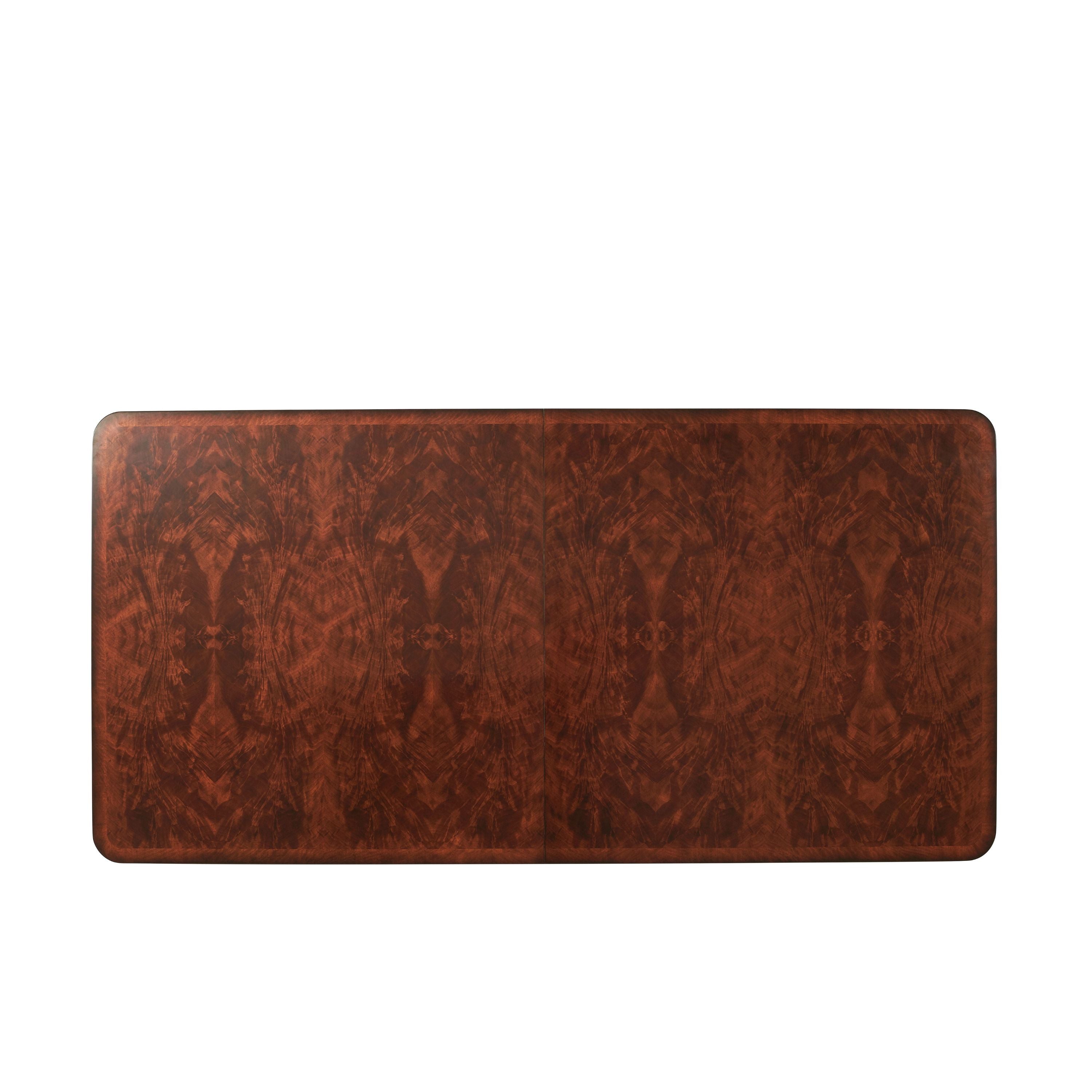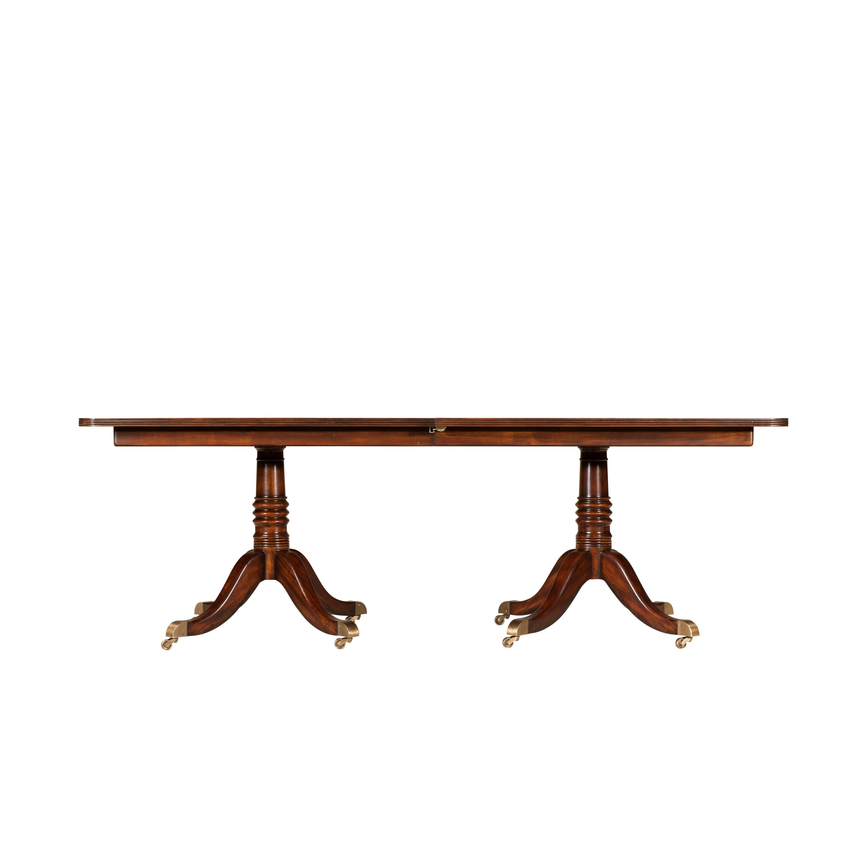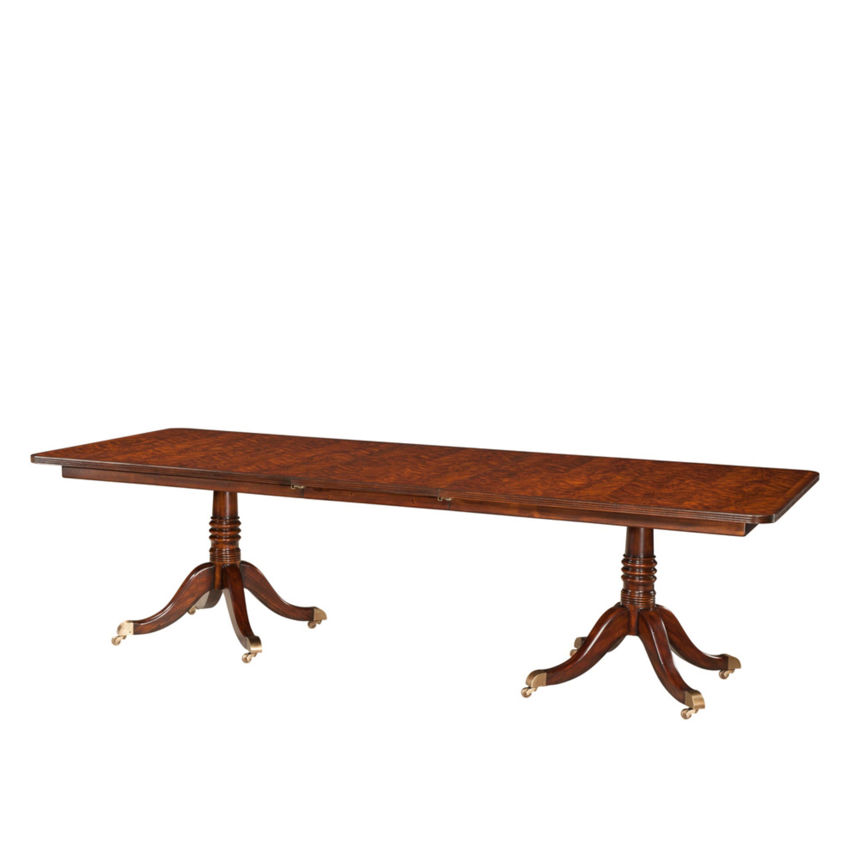 طاولة طعام ممتدة ذات قاعدتين من خشب الماهوجني الصلب ومغطاة بقشرة من اللهب، ذات حافة متقاطعة من القصب في الجزء العلوي مع زوايا مستديرة تفتح لاستيعاب ورقة متطابقة، فوق إفريز مخطط على عمودين ملتويين على شكل برميل بندقية ينتهي كل منهما بأربعة أرجل متجهة للأسفل مع عجلات نحاسية.