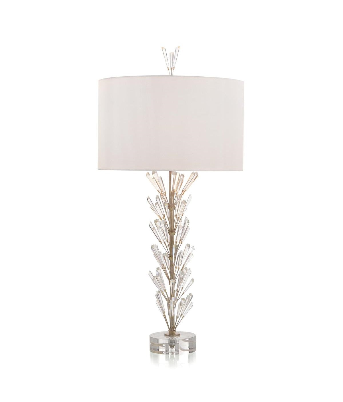 يتميز هذا المصباح المكتبي المصنوع من قضبان الكريستال بلمسة نهائية من أوراق الفضة العتيقة وقاعدة من الكريستال.