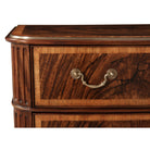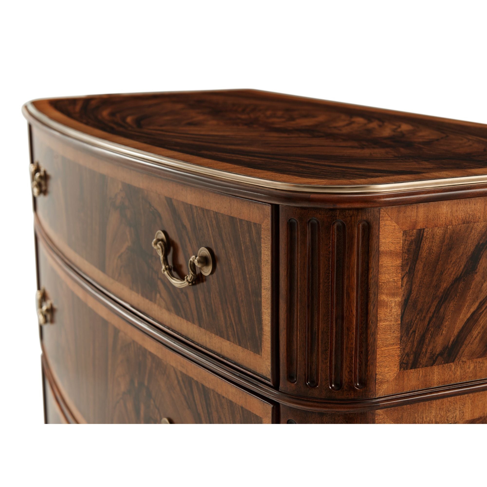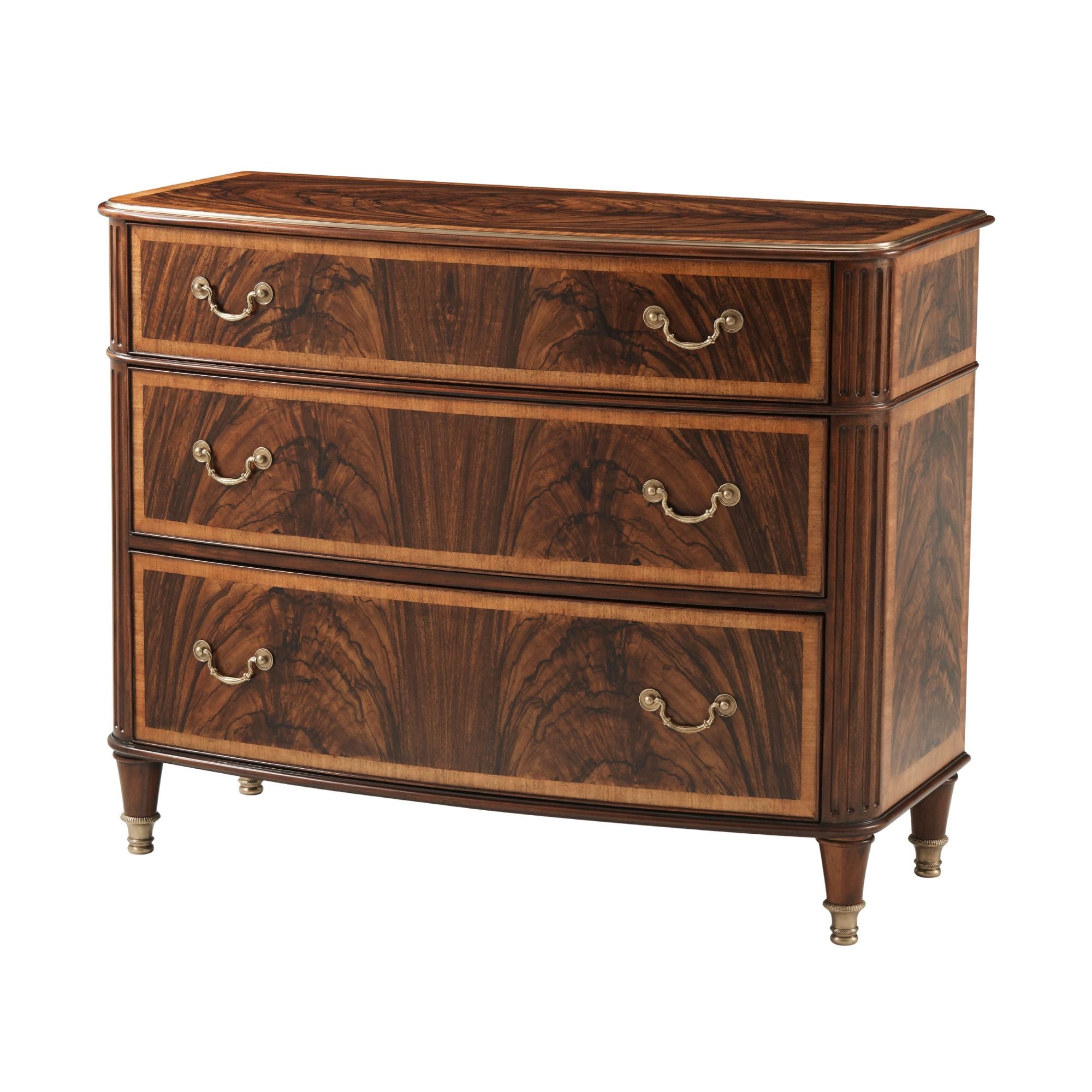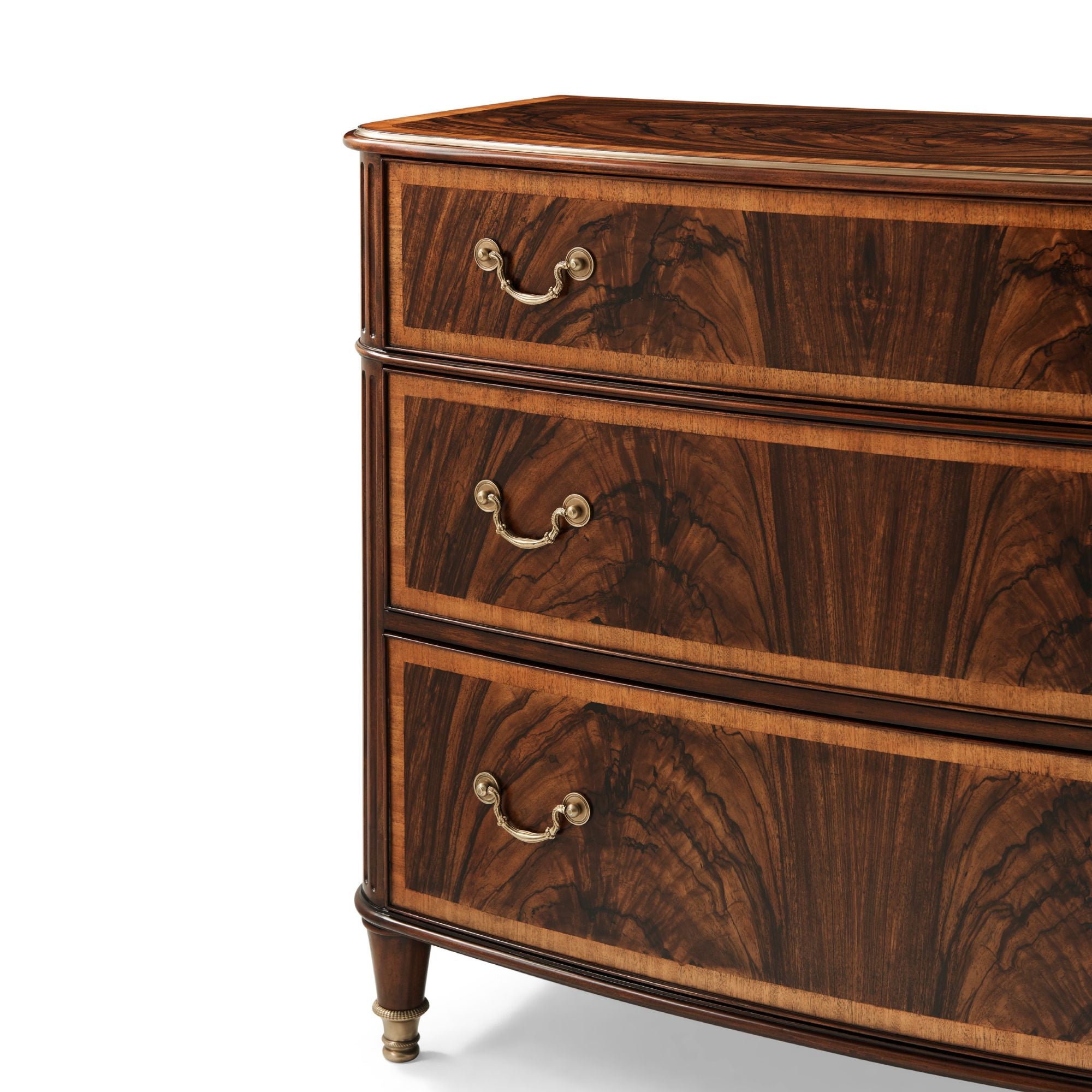 This handsome primavera marquetry-designed chest features veneered Zebrali with a makore oak frame. Three frieze detailed drawers with our Dark English finished brass handles sit atop of a classically turned leg all in our renowned Dibdin Crotch finish.