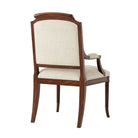 A finely carved mahogany dining armchair, the upholstered framed back with a swirl mahogany veneered scroll over toprail with fine brass details, the upholstered seat between part-padded arms, on panelled seat rails with turned and fluted legs with splay feet.