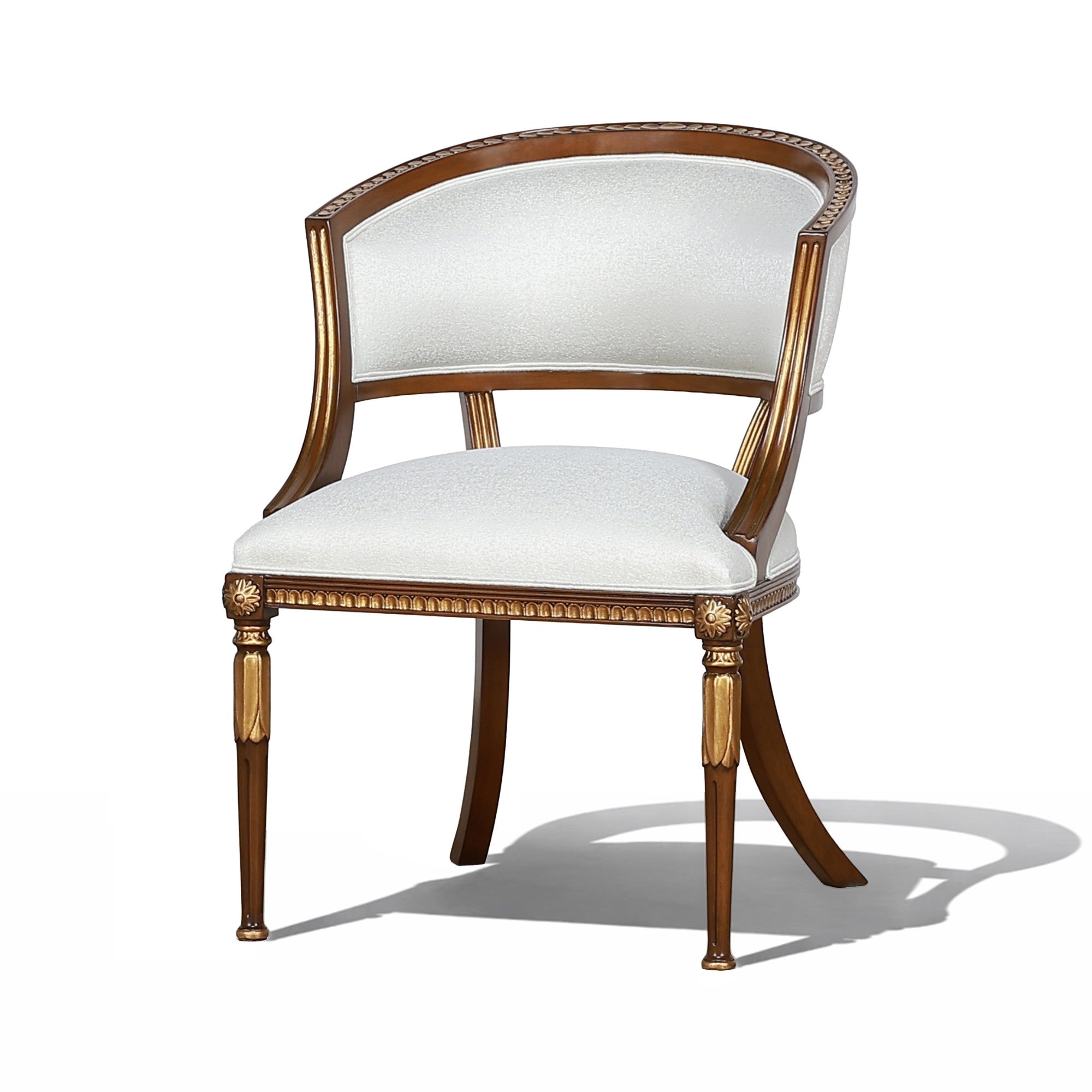 A refined accent chair with a gently curved back and classic cabriole-inspired silhouette. Upholstered in ivory damask and finished with hand-applied gold leaf accents, it offers timeless charm and poised elegance for dressing areas or formal seating spaces.