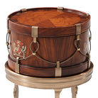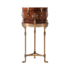 A mahogany and brass drum-shaped box on a brass stand with lion claw feet joined by concave stretchers and painted with the Spencer coat of arms.