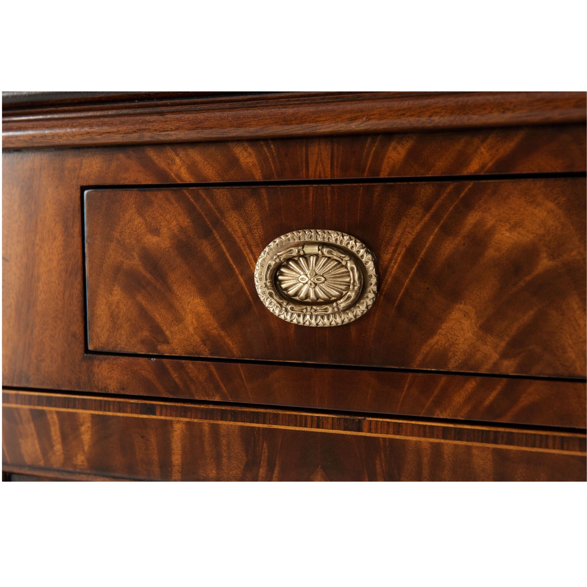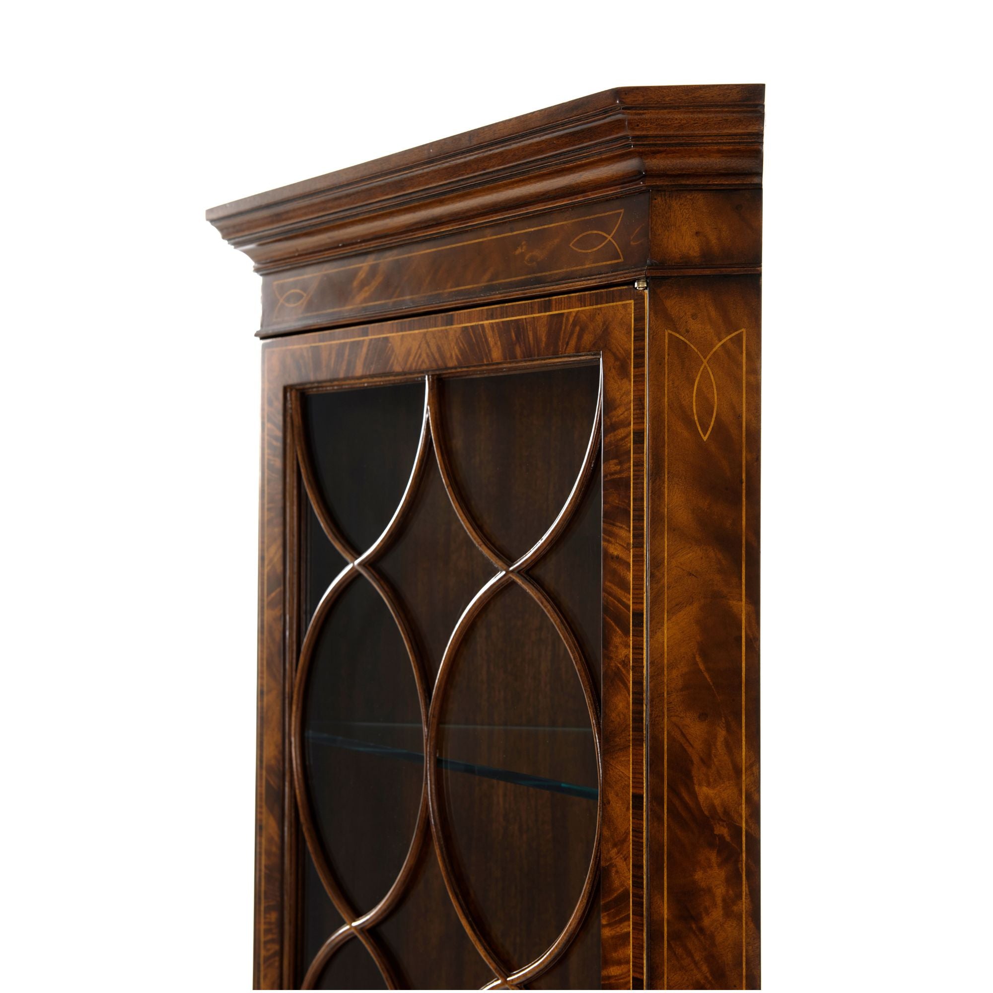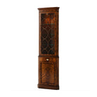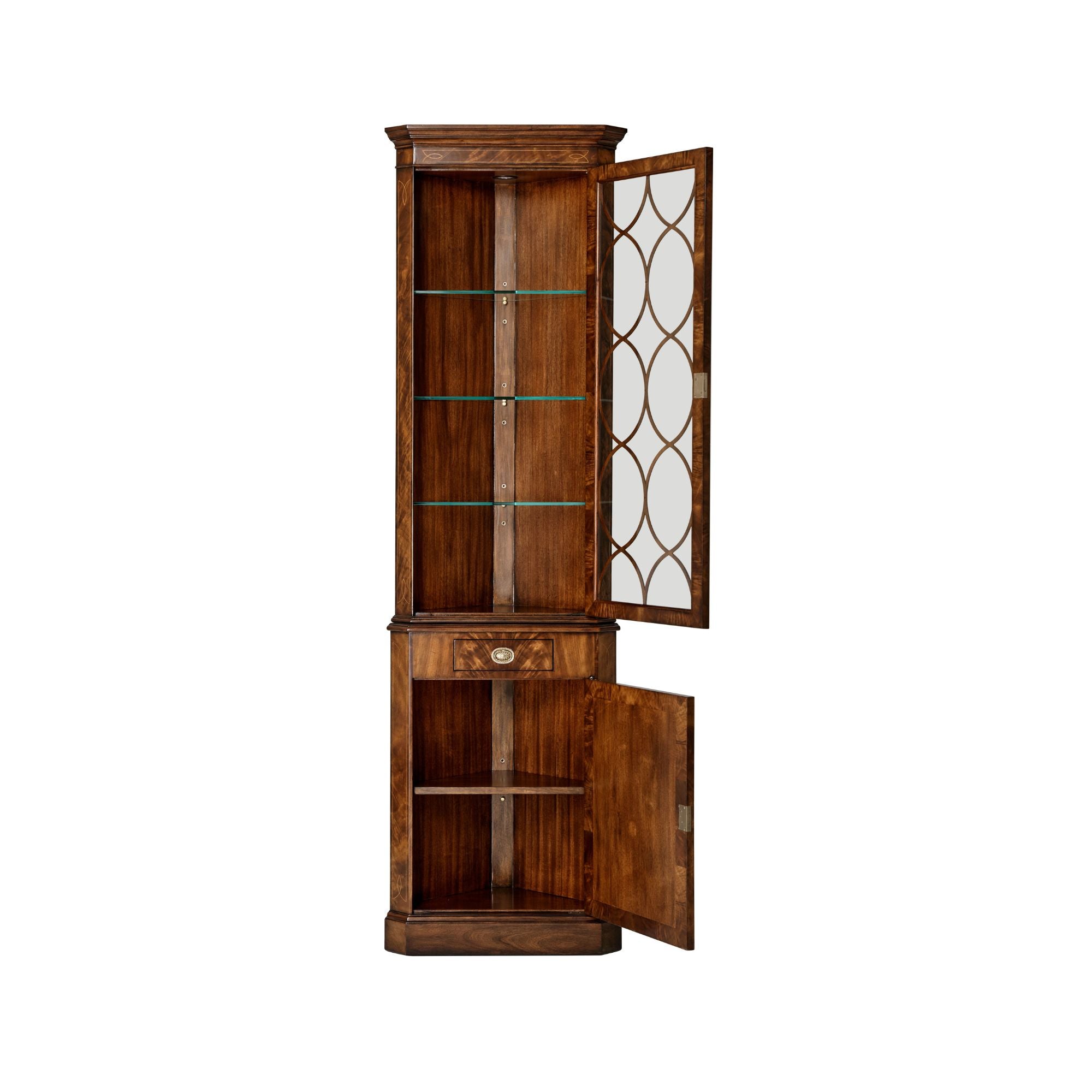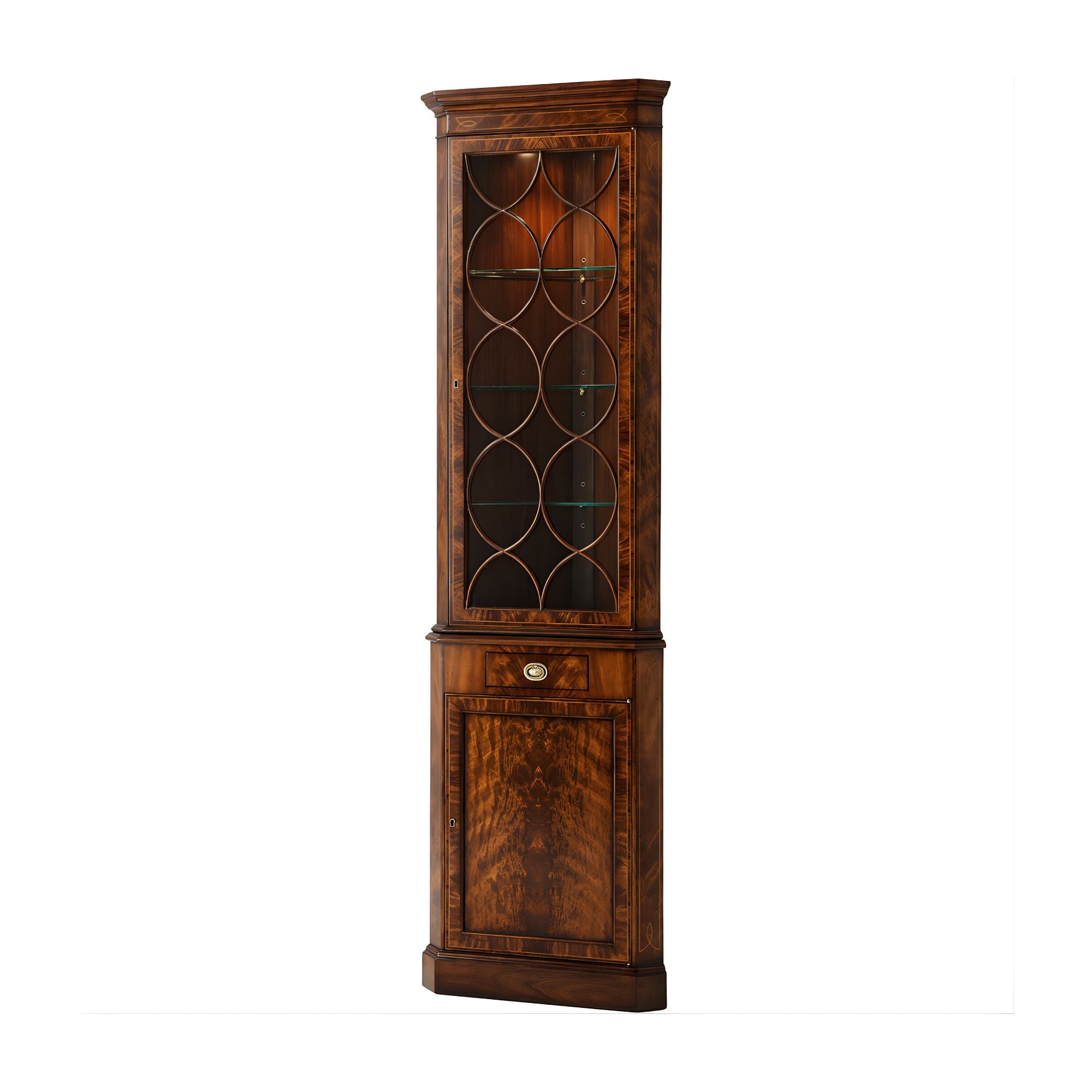 The Georgian Corner Cabinet from Theodore Alexander is a flame mahogany corner cabinet featuring an upper astragal glazed door enclosing lights and three glass adjustable shelves. Above a frieze drawer and lower cabinet door enclosing an adjustable shelf. Original George III English styling.