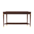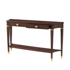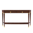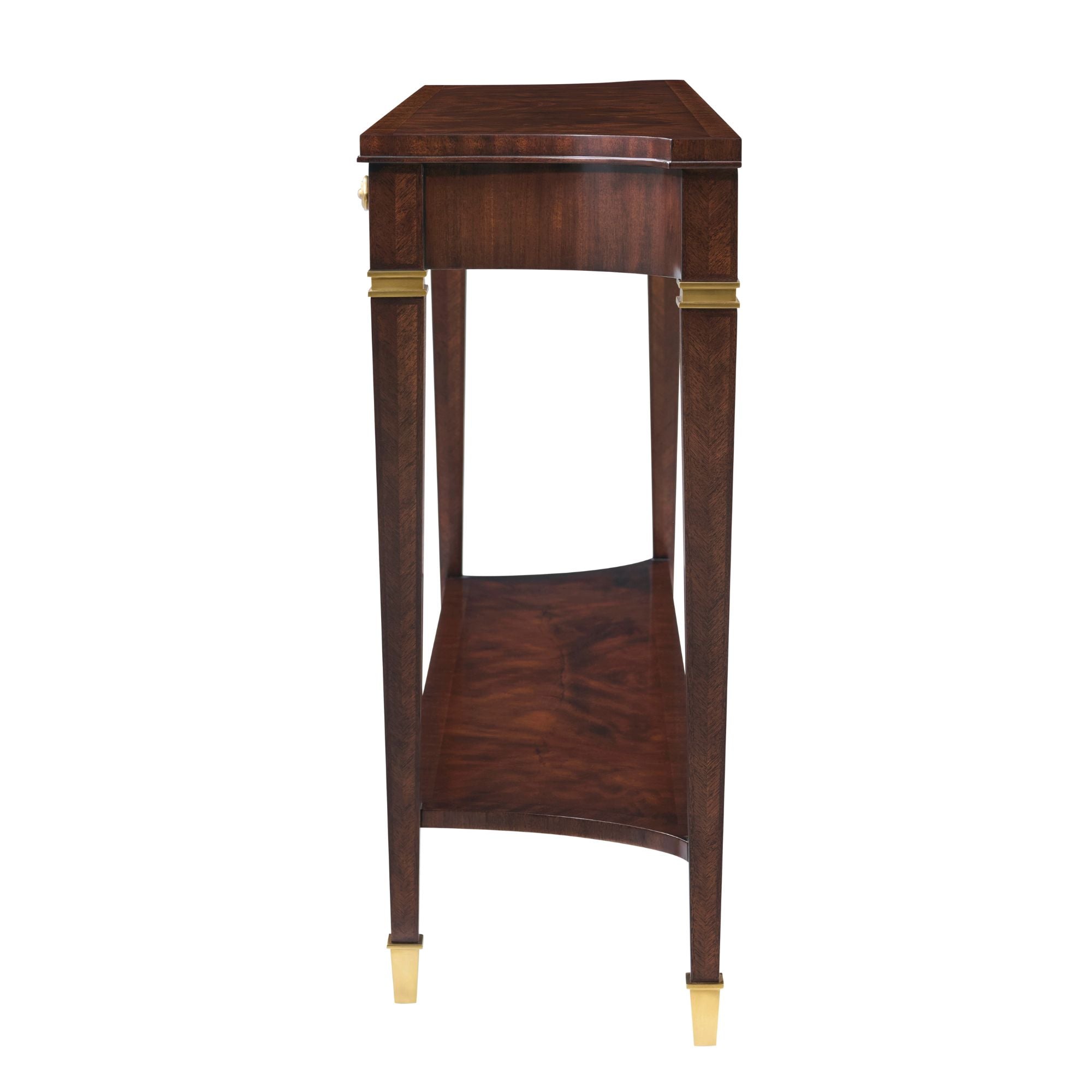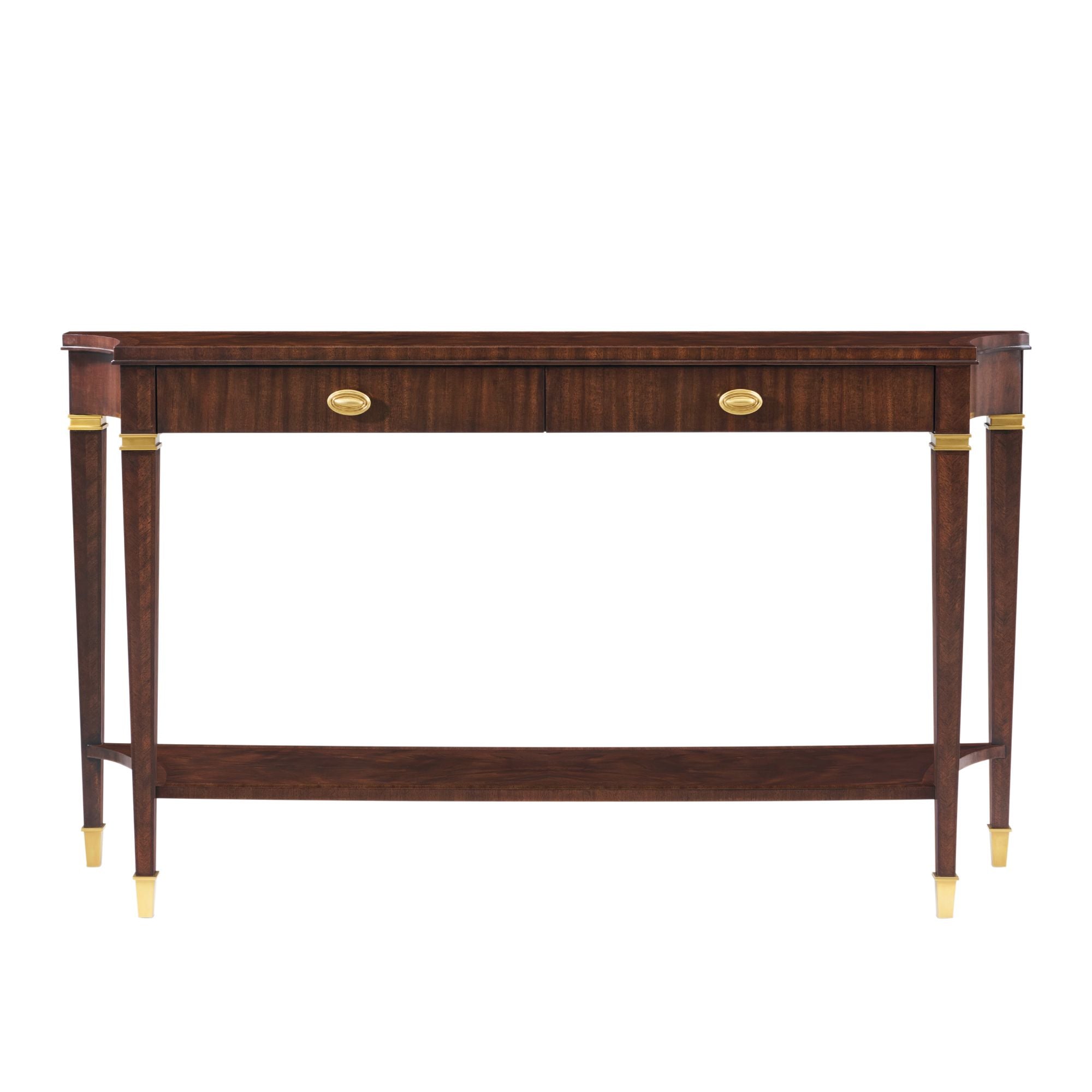 Inspired by the luxurious minimalist beauty of Art Deco design, the Hawthorne Console Table offers undeniable visual interest through its unique trapezoid shape, sleek curved cutouts, and spacious display areas. Lustrous Hampton Brass details include oval-shaped drawer pulls, accent ferrules, and shining foot caps to set off the piece's tapered legs. Hawthorne has been handcrafted from khaya swirl and is finished in a choice of two colorways, Cambridge or Geo Coast.