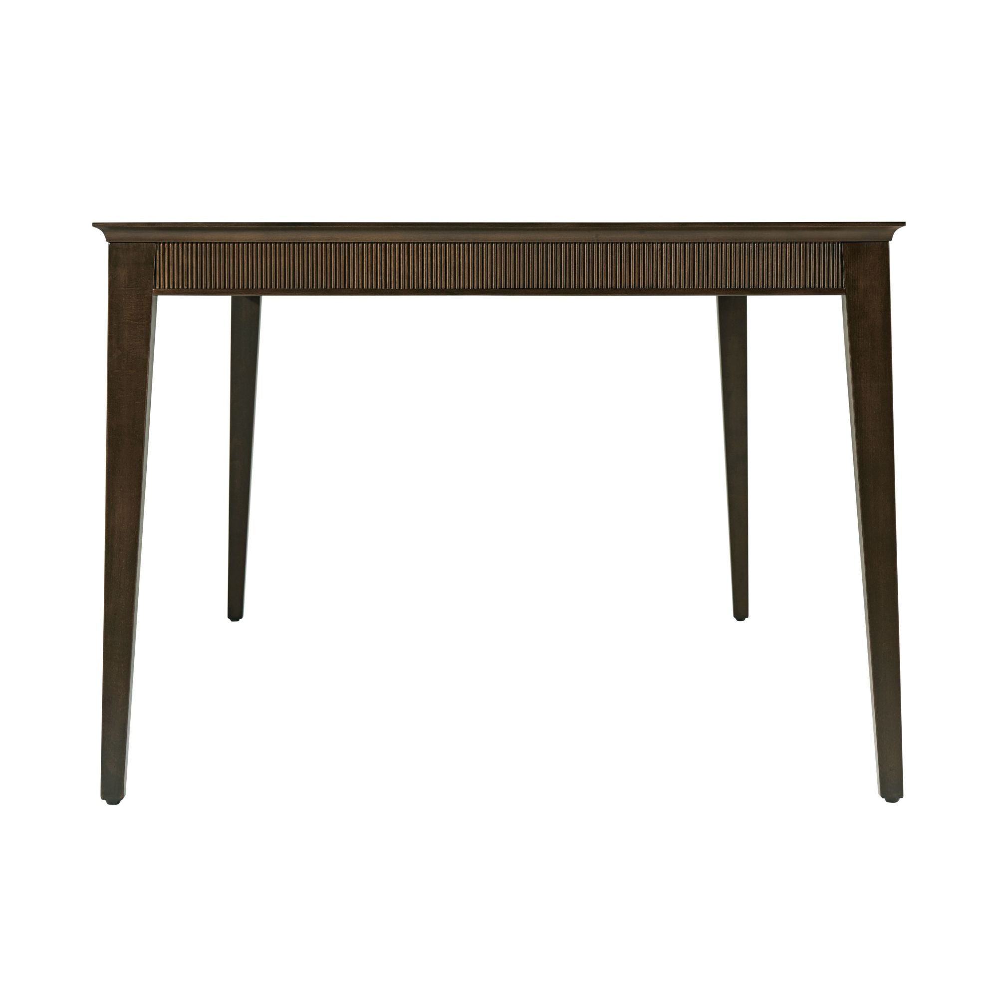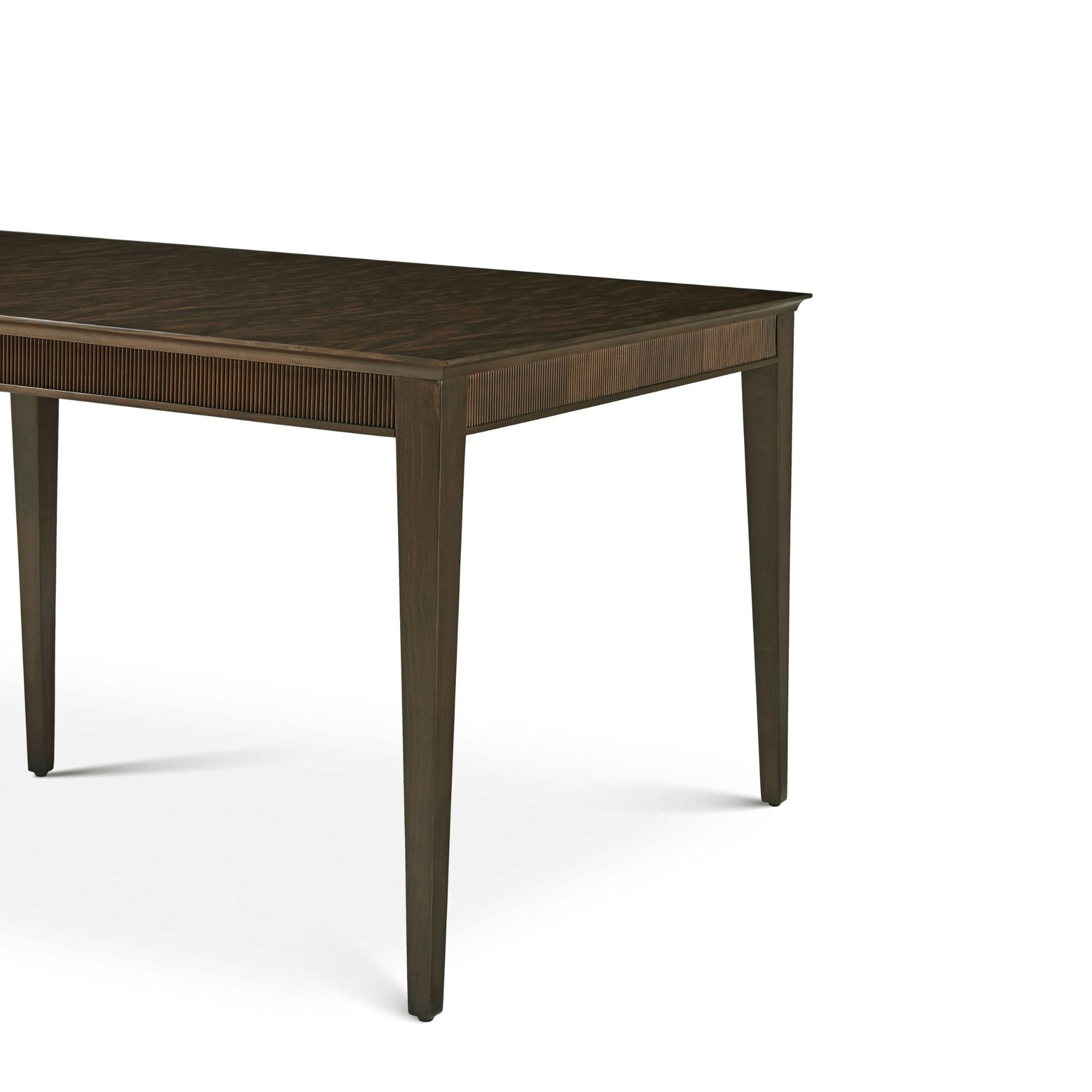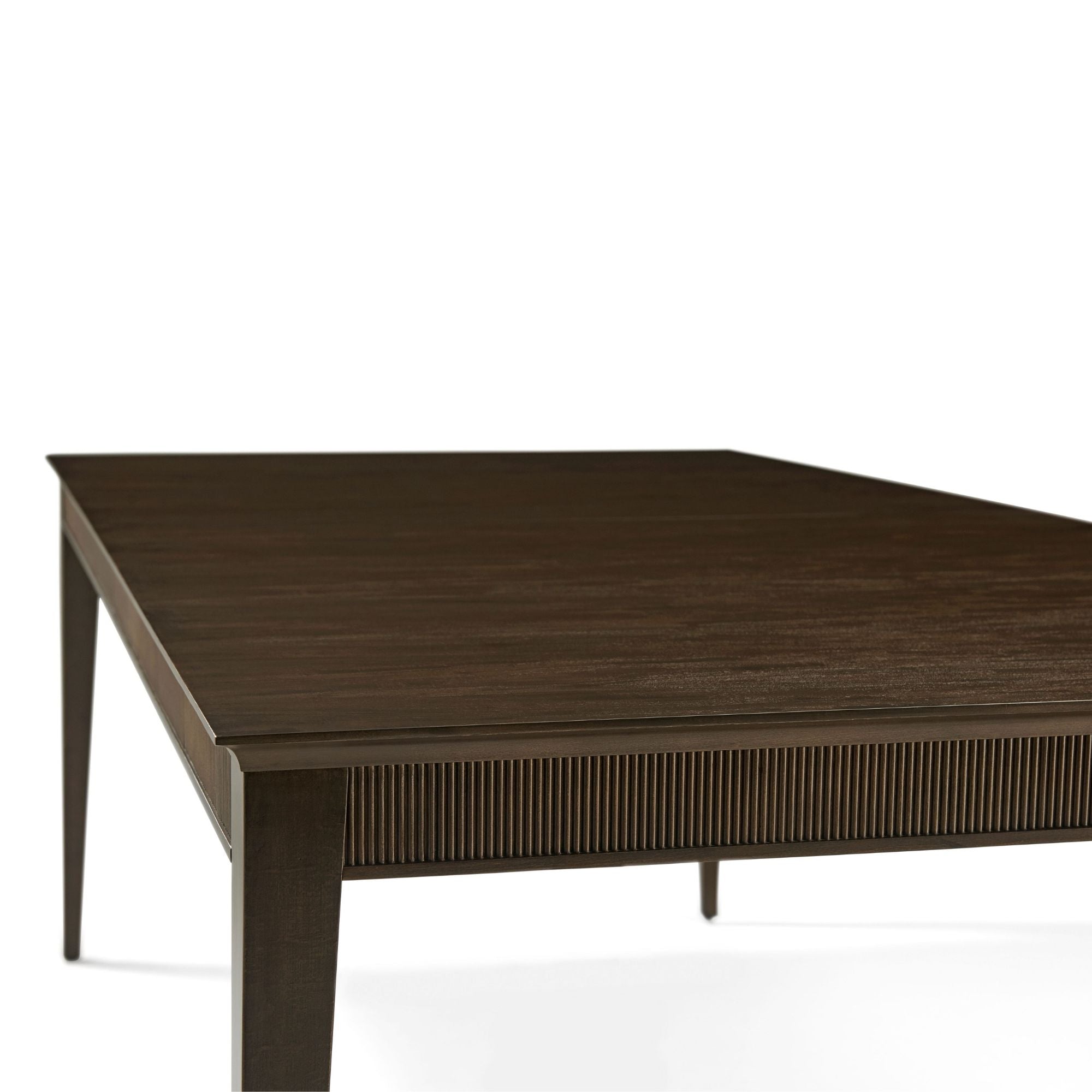 The Lido Rectangular Dining Table, crafted in a Prima Vera in our Bistre finish, features a reeded apron set upon sleek tapered legs. Includes two leaf inserts and two additional legs for a more luxurious dining experience.