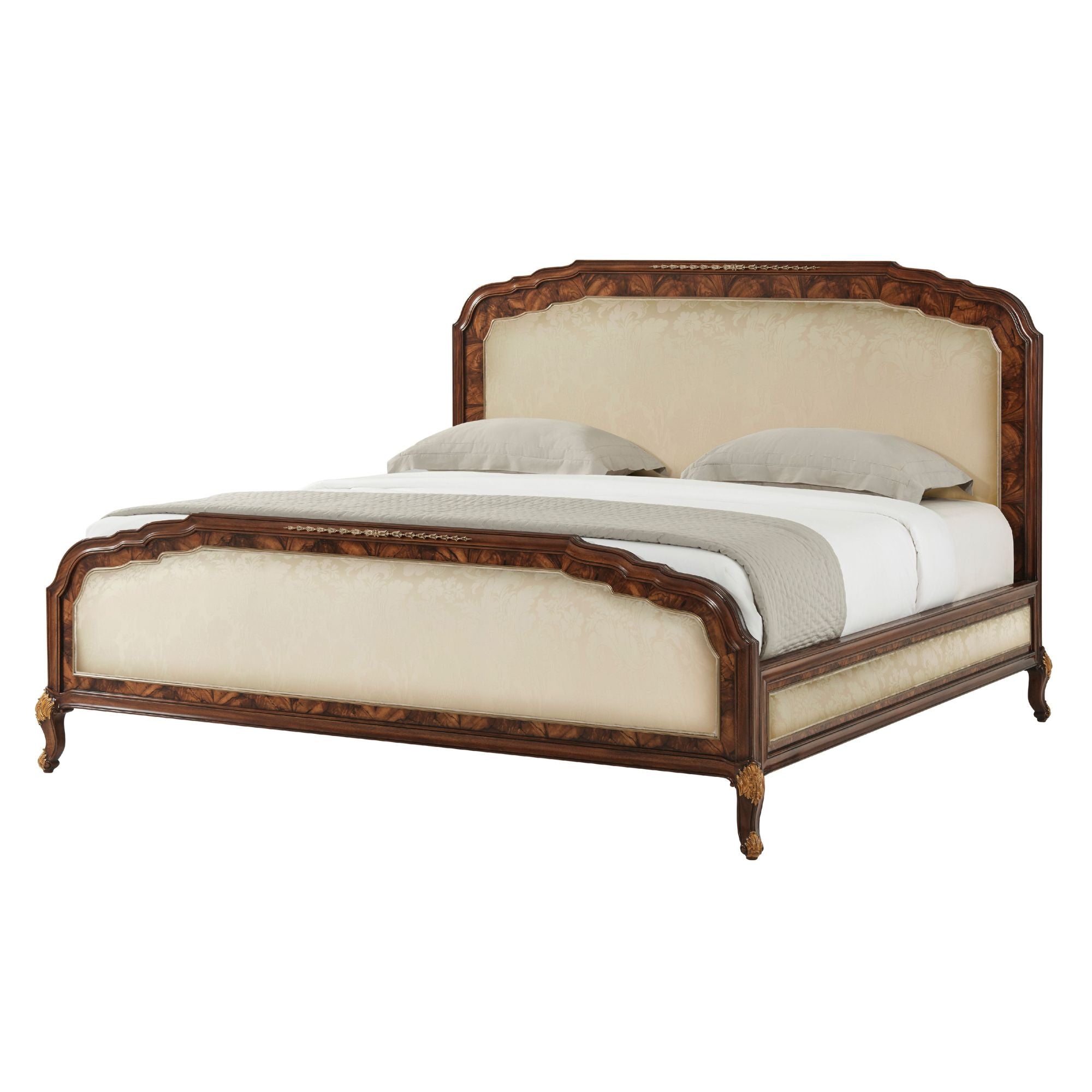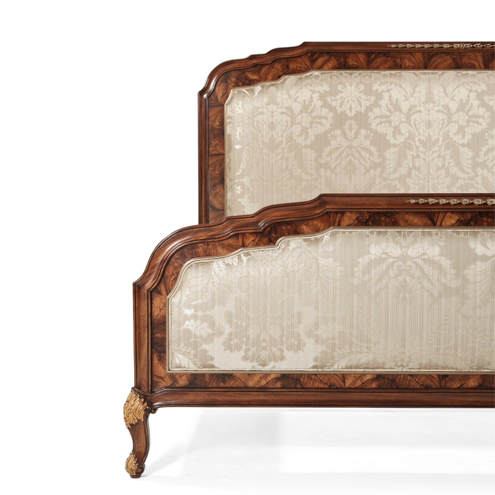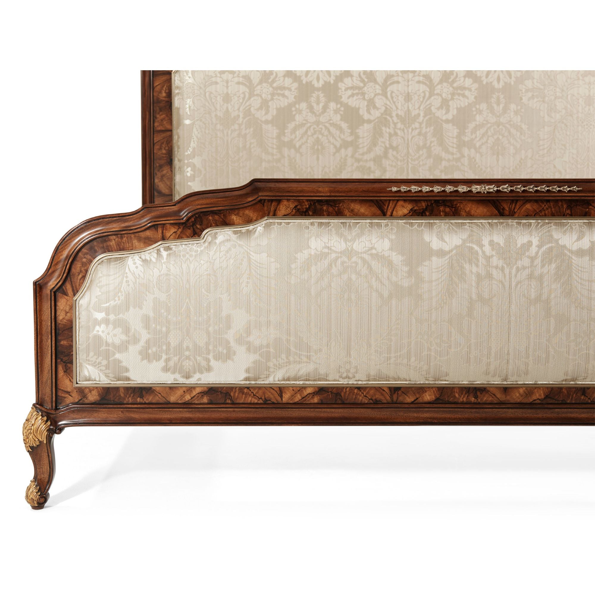 An elegantly crafted Kahya veneer bed, seen in our Dibdin Crotch finish, is a royal statement piece with an upholstered serpentine head and footboard. Supported with an upholstered rail and chippendale legs, detailed with gold leaf finishing.