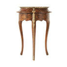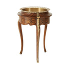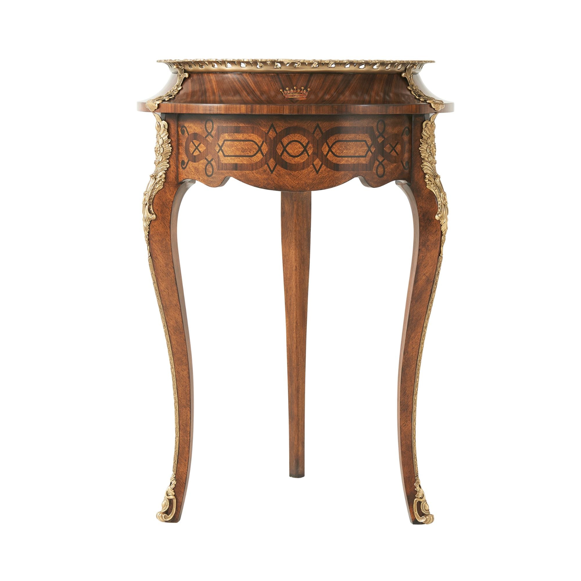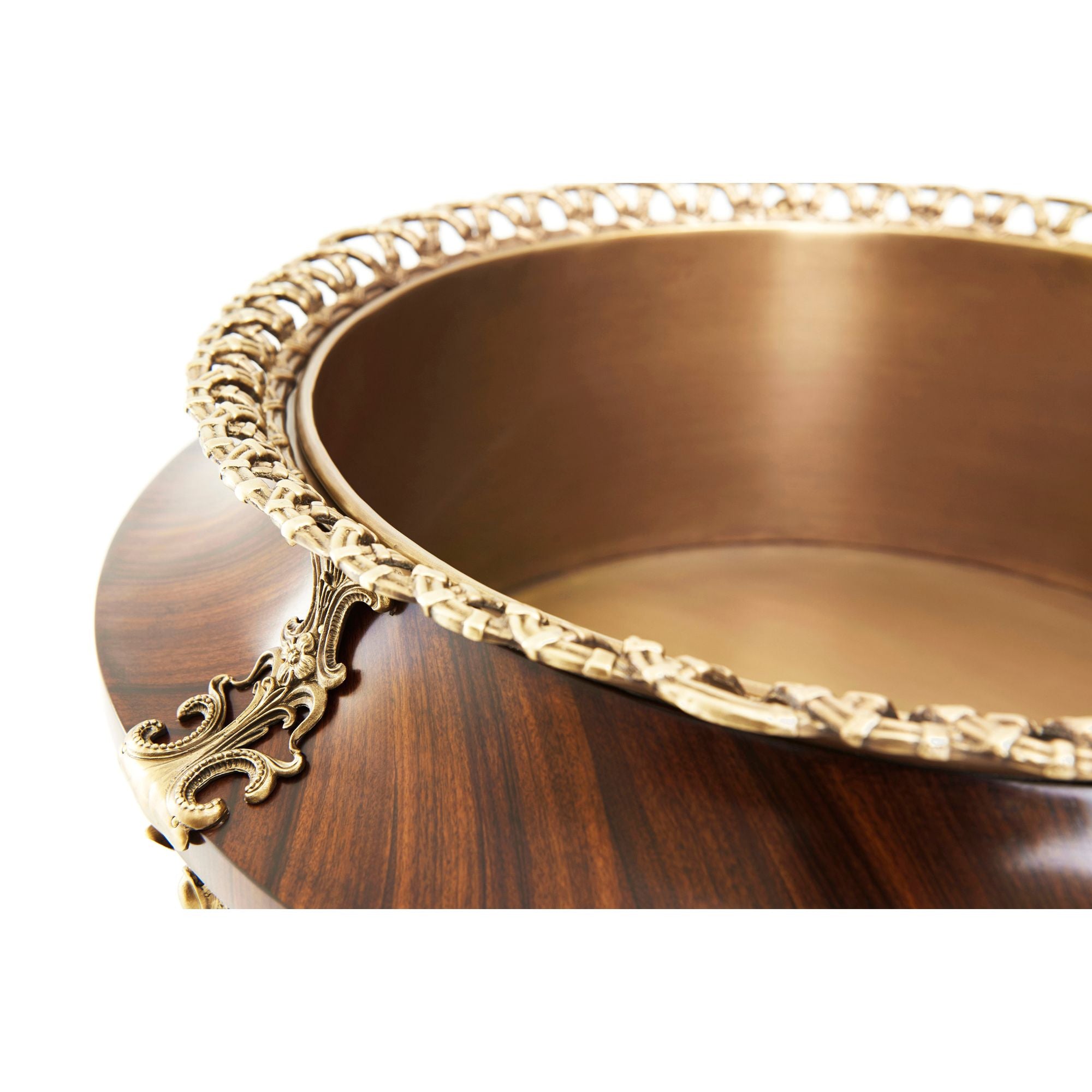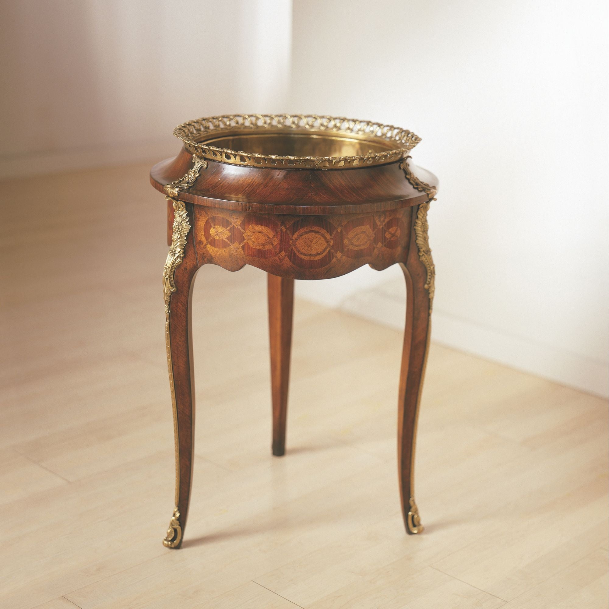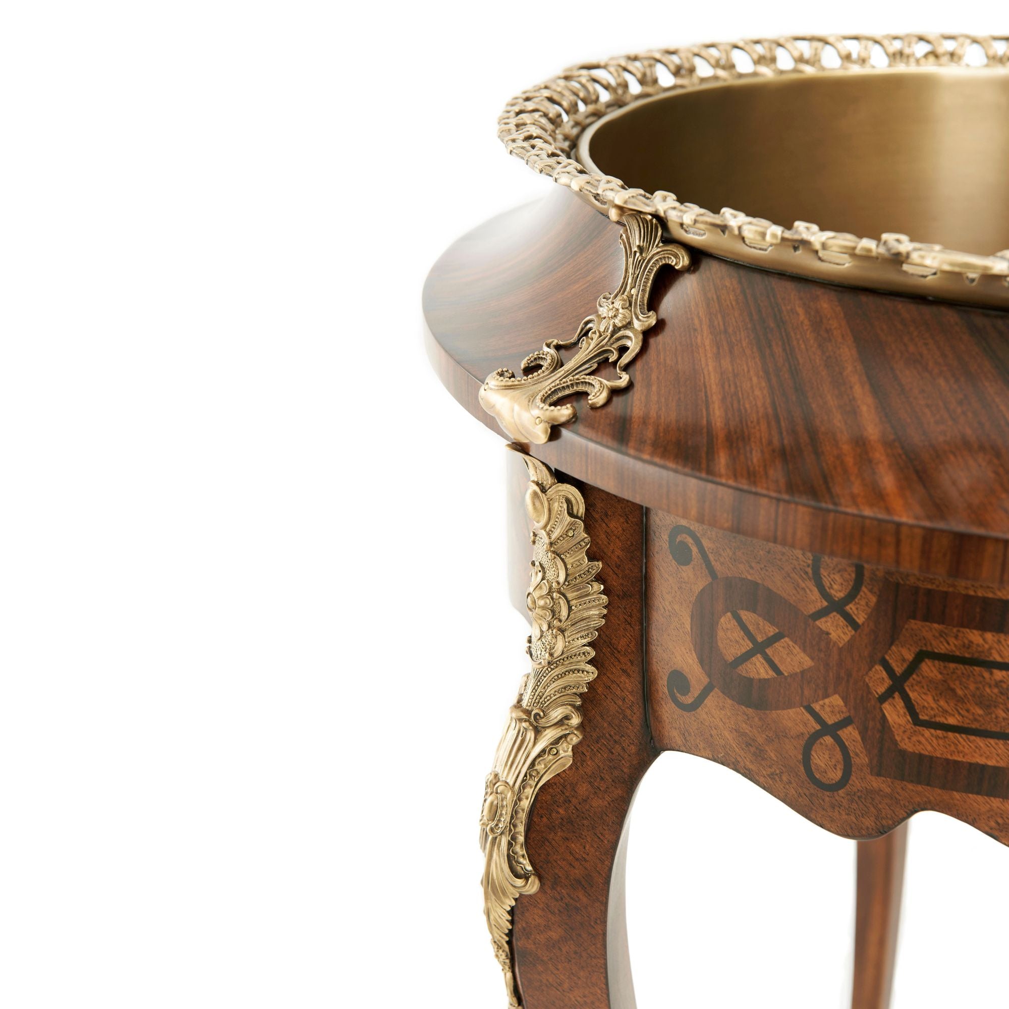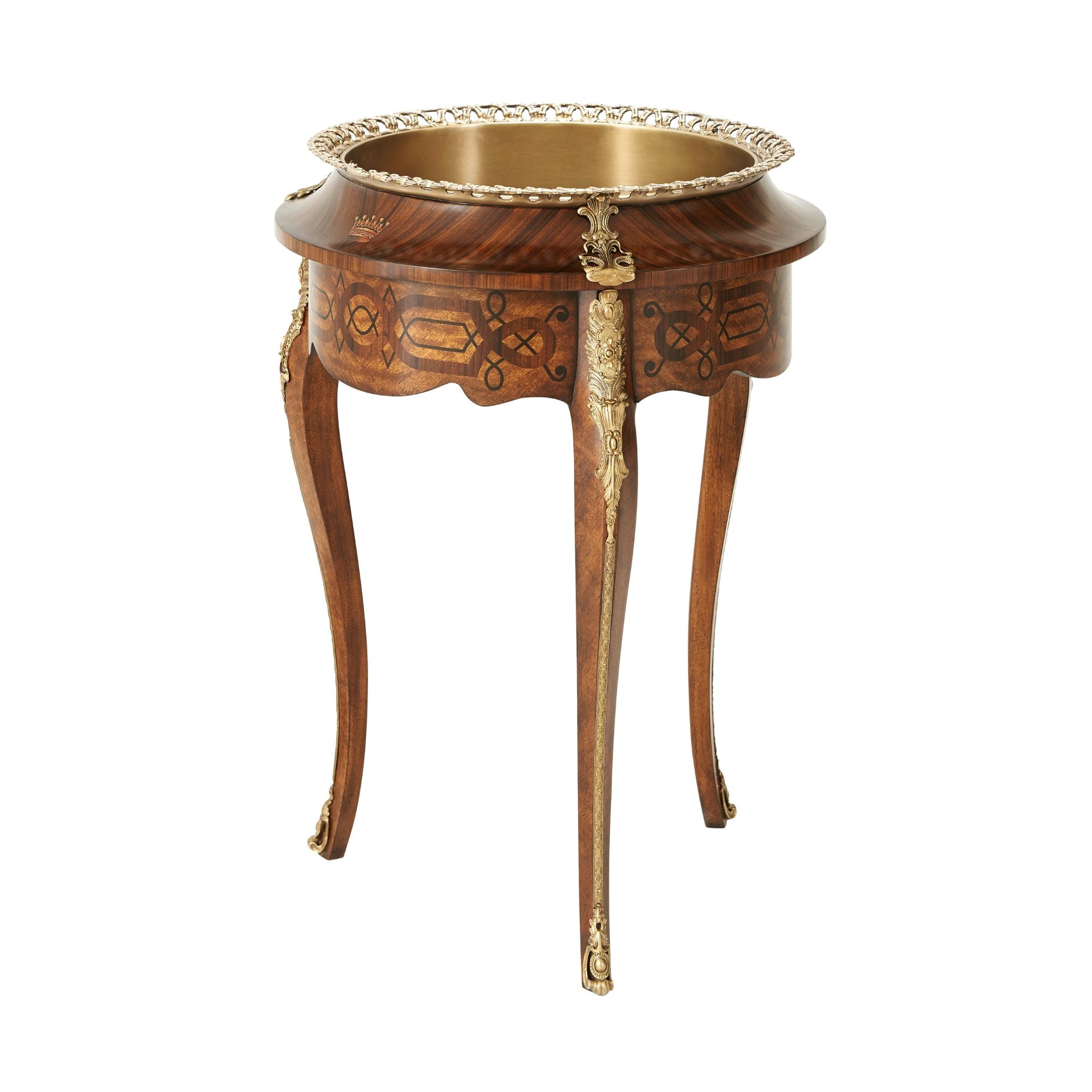 A marquetry and brass-mounted jardinière, the circular caddy moulded top painted with the Spencer coronet, with a pierced brass gallery and an inset removable brass liner above an interlacing strap work marquetry inlaid frieze tapering cabriole legs with finely cast ormolu mounts and sabots.