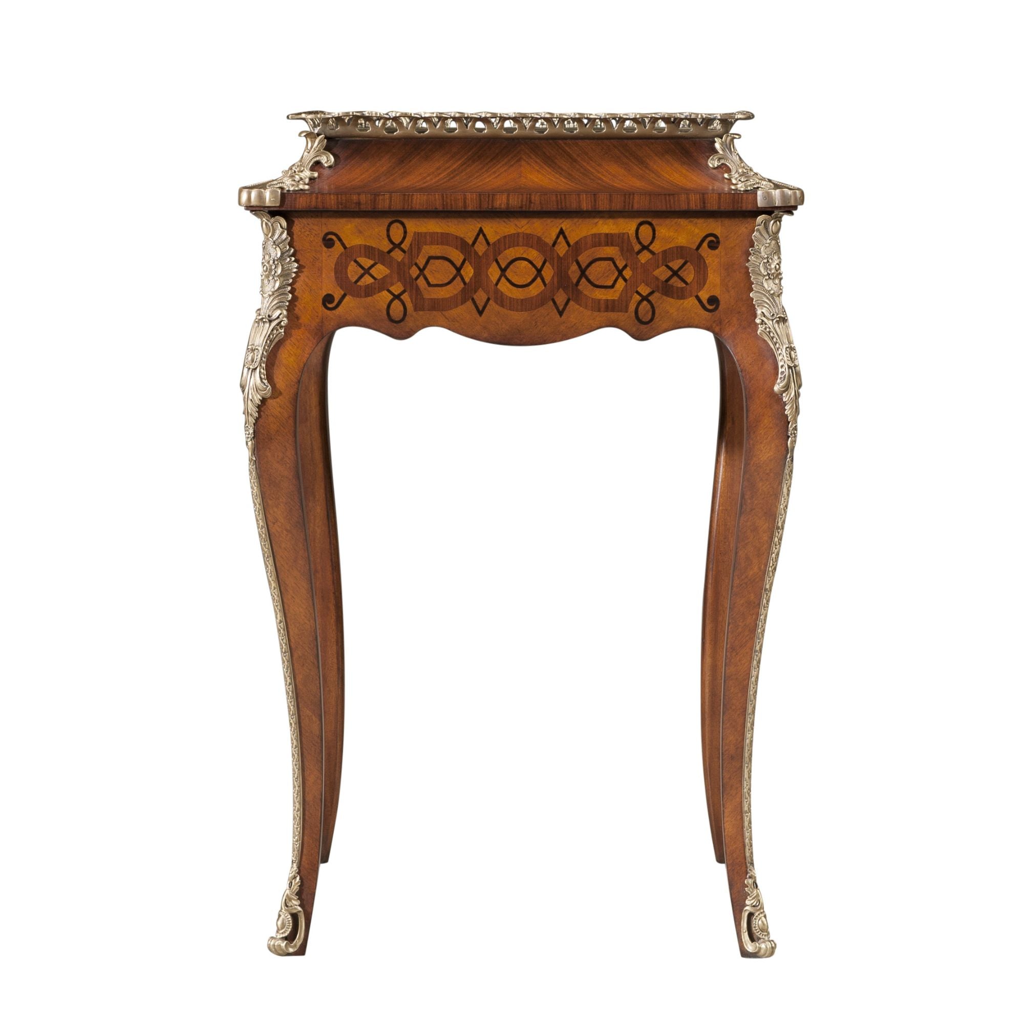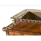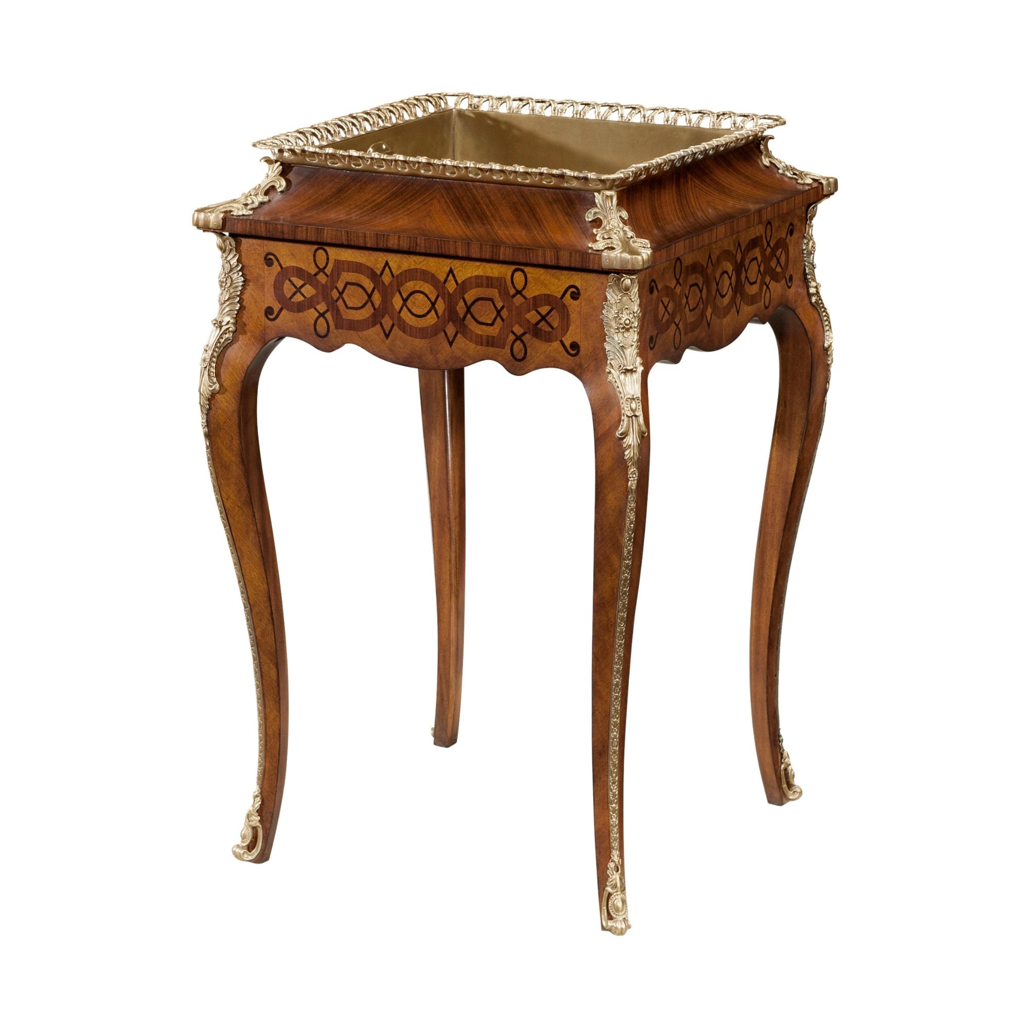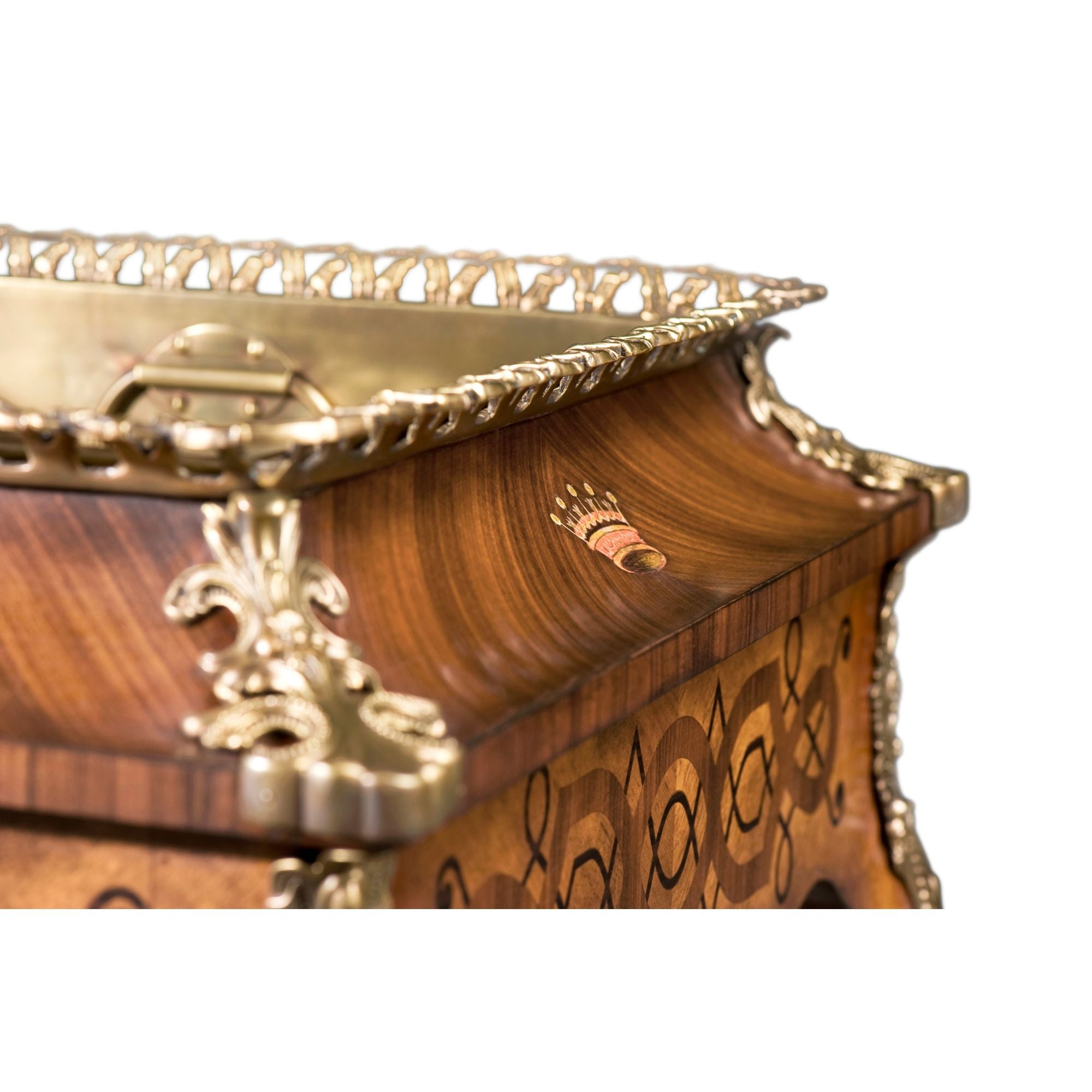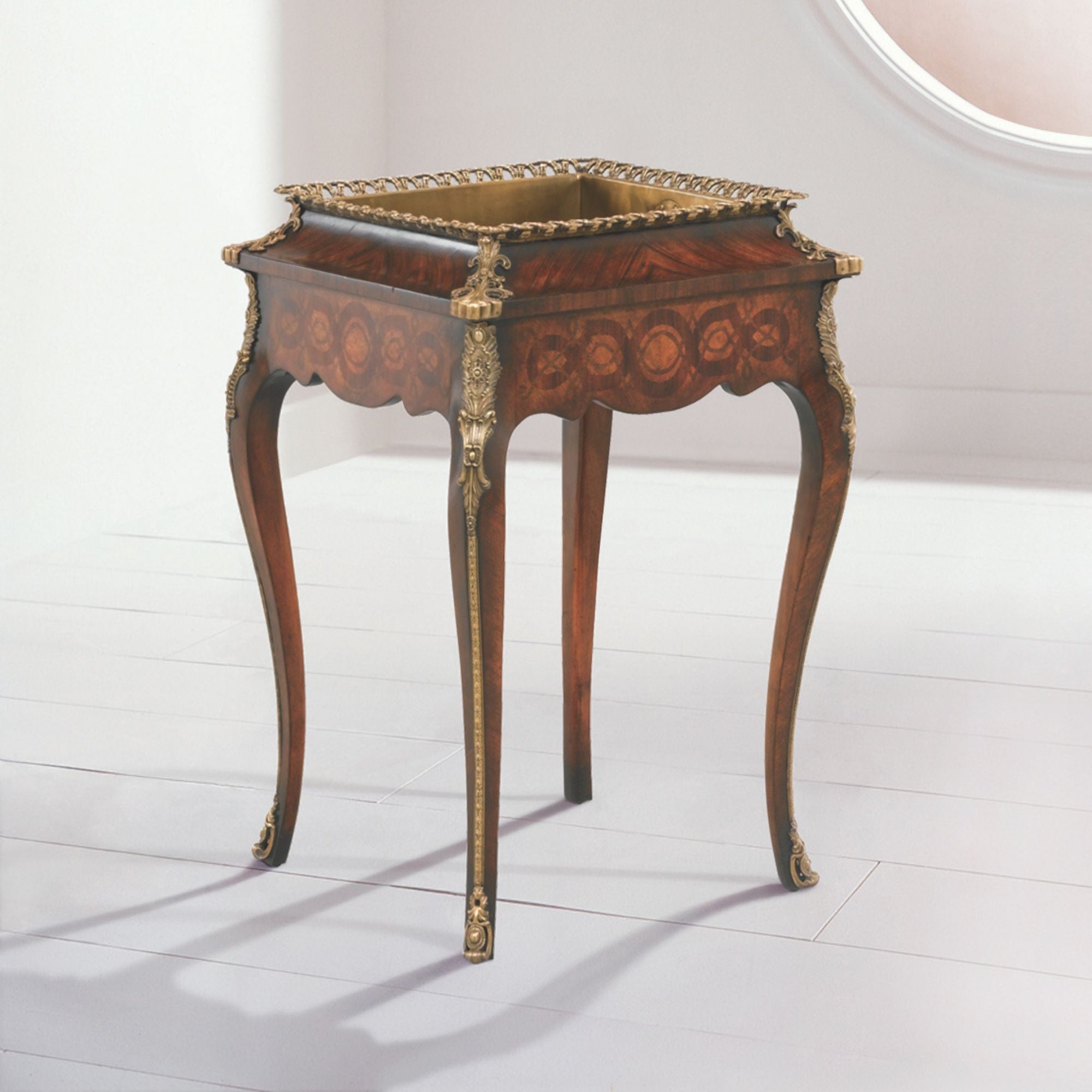 A marquetry and brass-mounted jardinière, the square caddy moulded top painted with the Spencer coronet, with a pierced brass gallery and an inset removable brass liner above an interlacing strap work marquetry inlaid frieze tapering cabriole legs with finely cast ormolu mounts and sabots.
