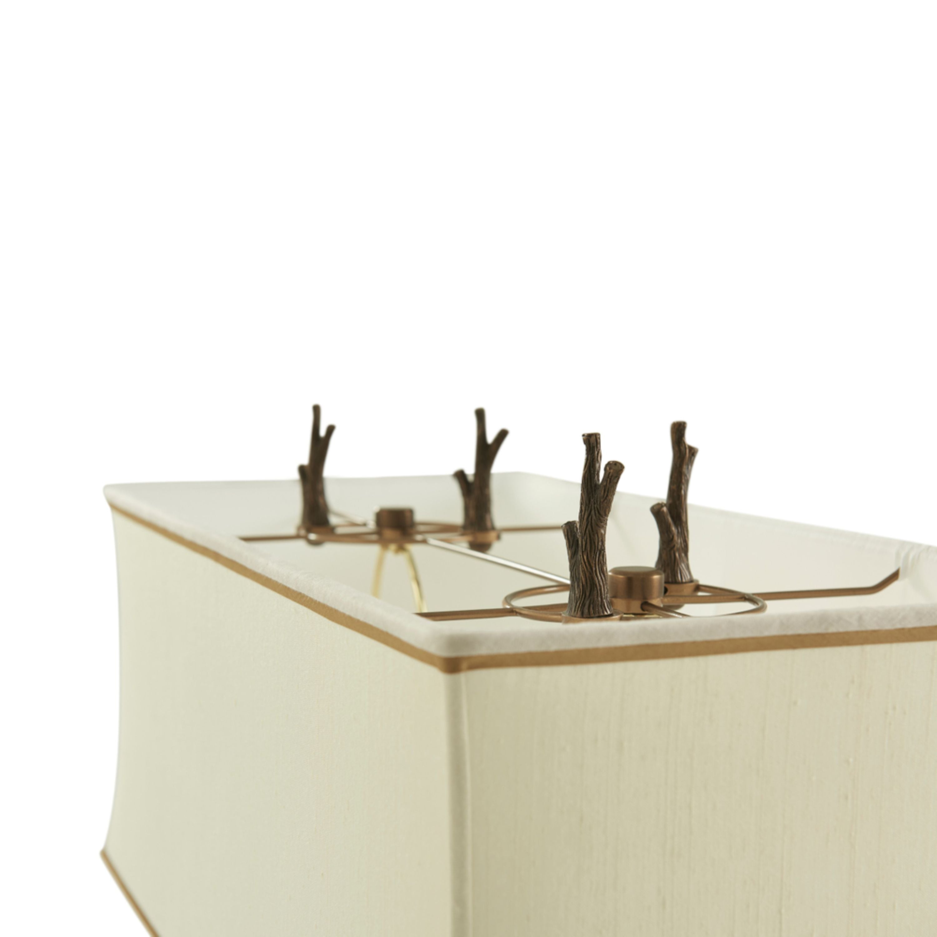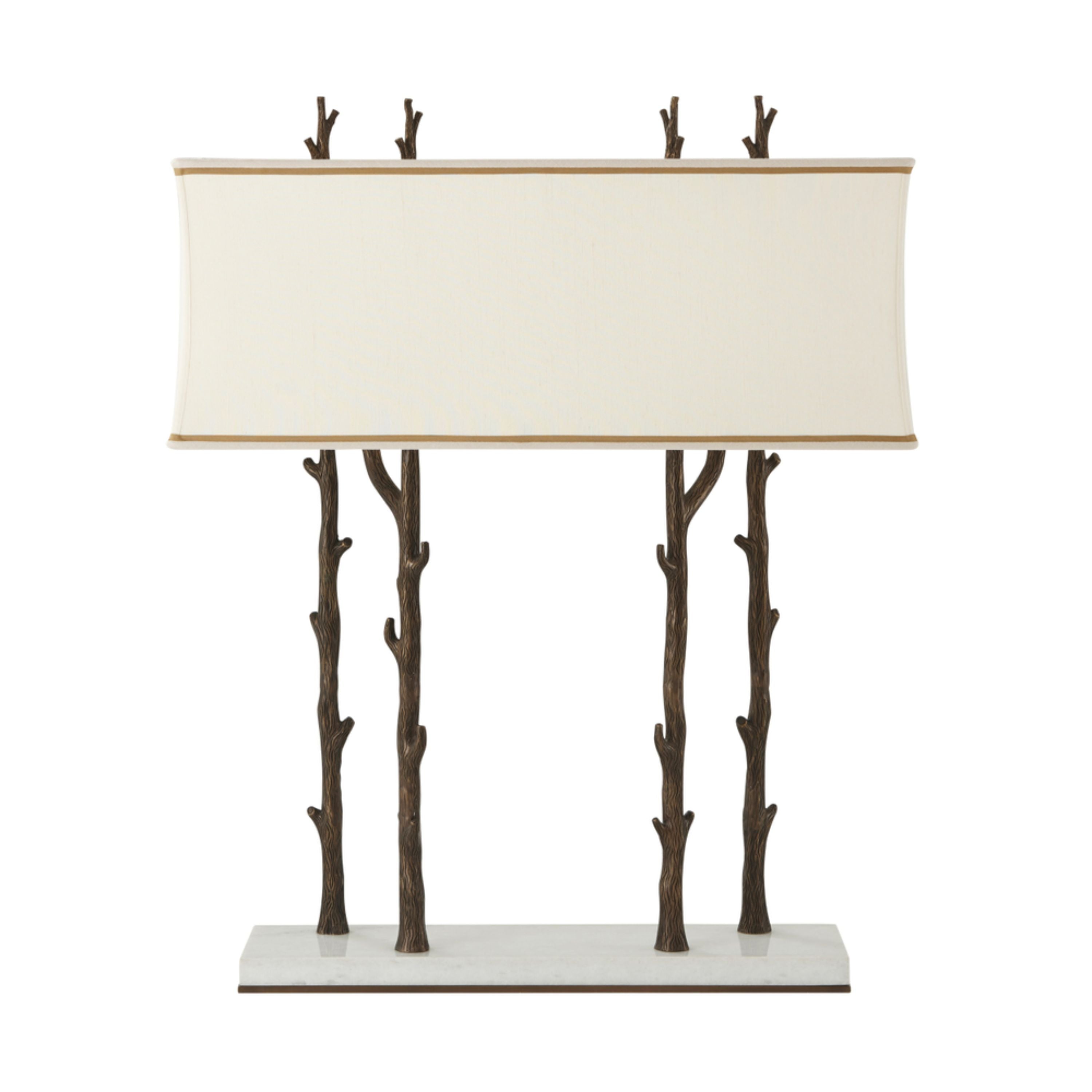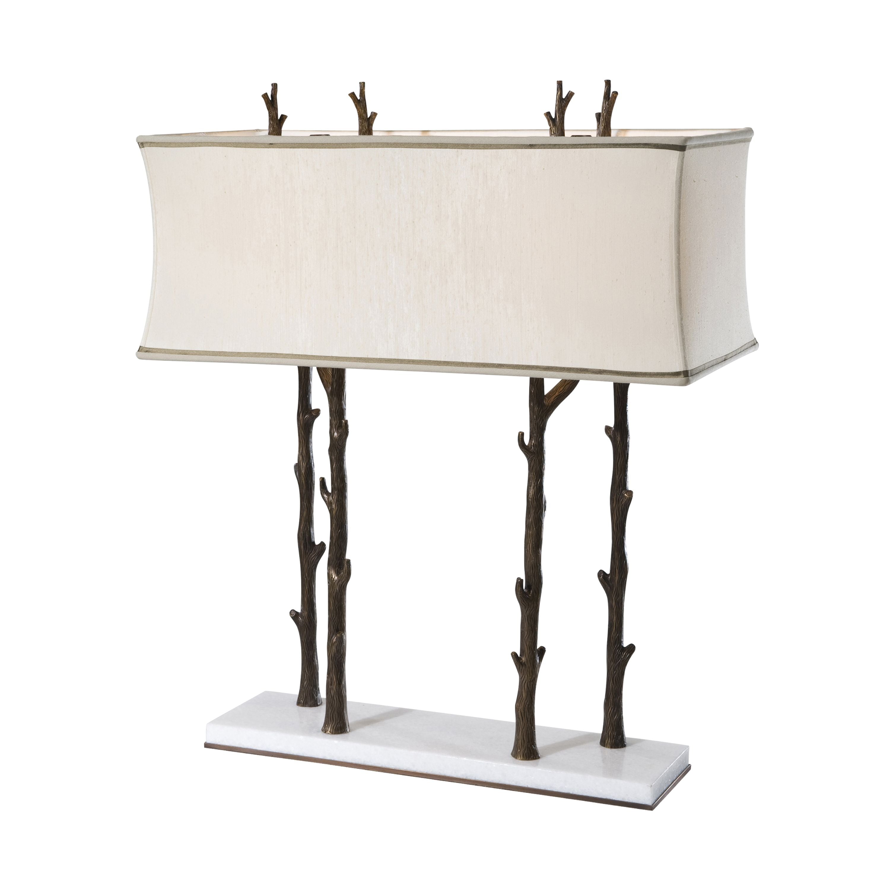 مصباح طاولة من النحاس الفاخر، قاعدة من الرخام الأبيض الفاخر مع أربعة جذوع أشجار نحاسية تدعم الظل المستطيل الطويل الذي يحيط بالأشجار الأربعة، ويعلوه زخارف من الفروع.