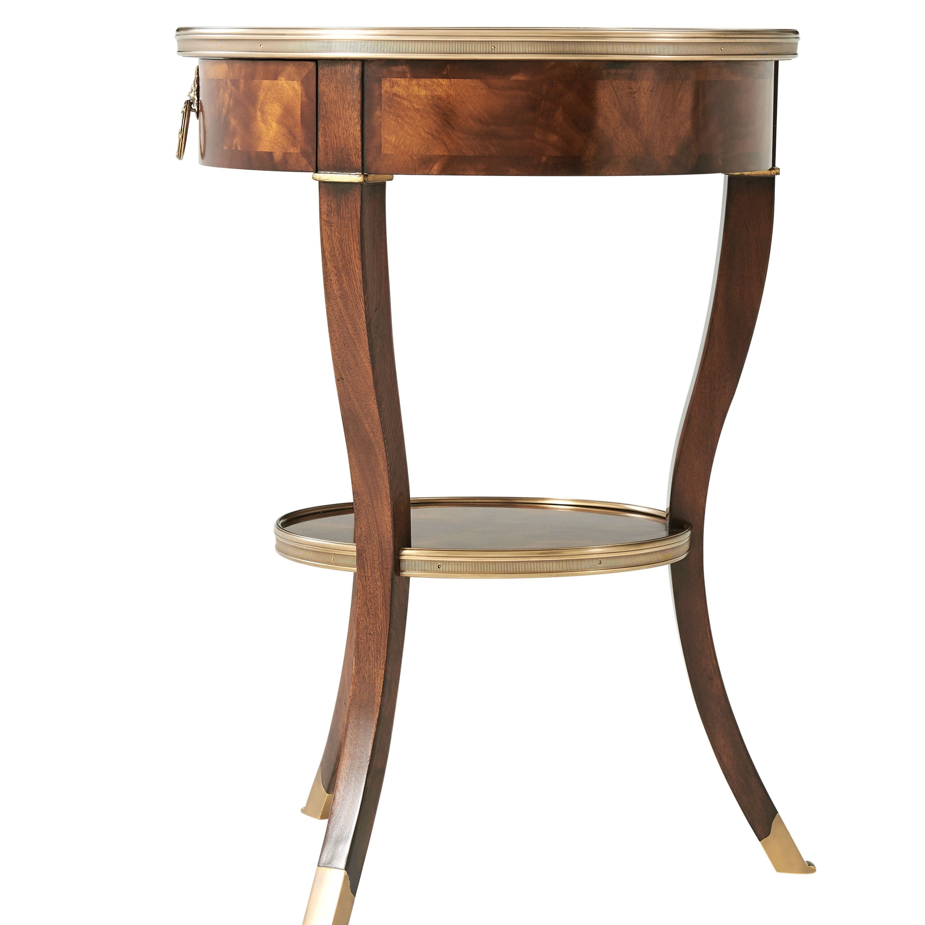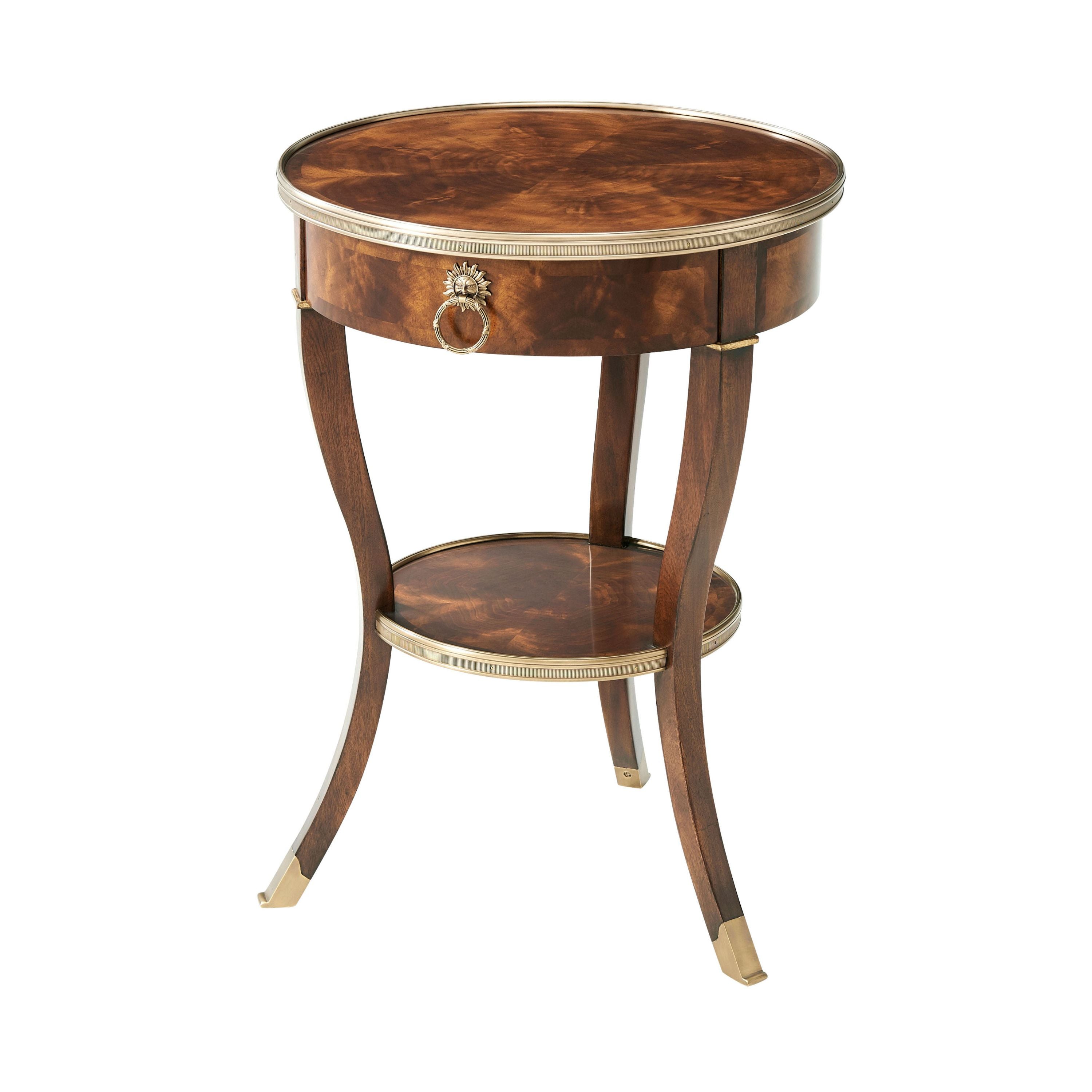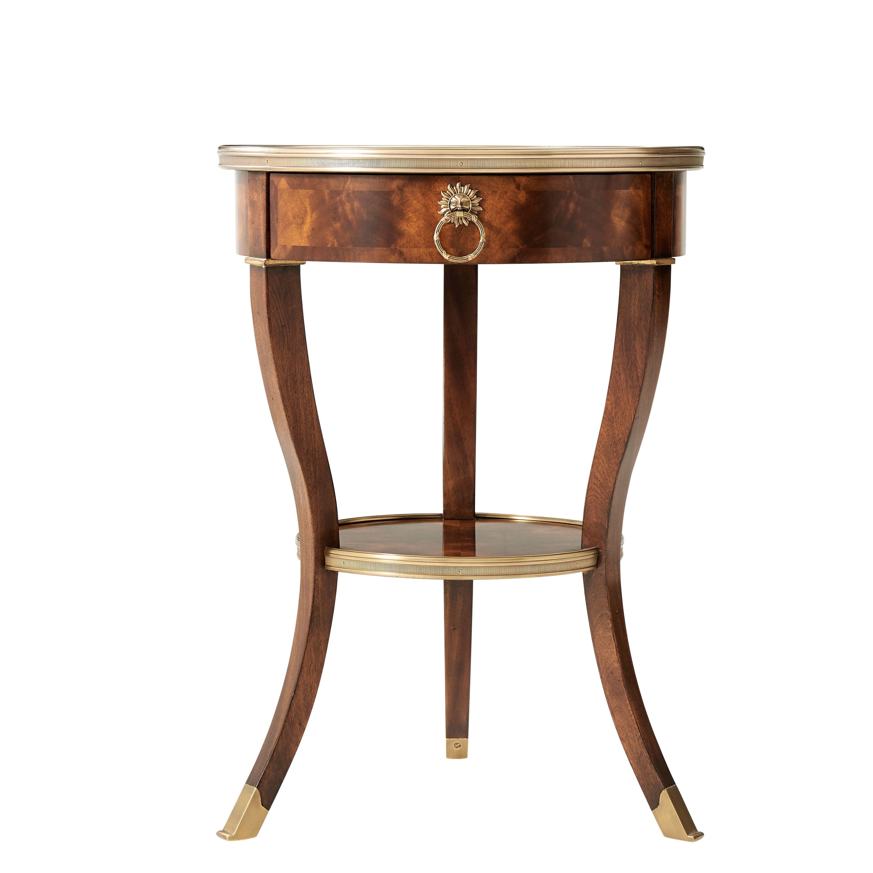 طاولة مصباح مصنوعة من خشب الماهوجني والنحاس، الجزء العلوي الدائري فوق درج إفريز، على أرجل مائلة للداخل مع نعال، متصلة بطبقة سفلية ذات إطار من النحاس.