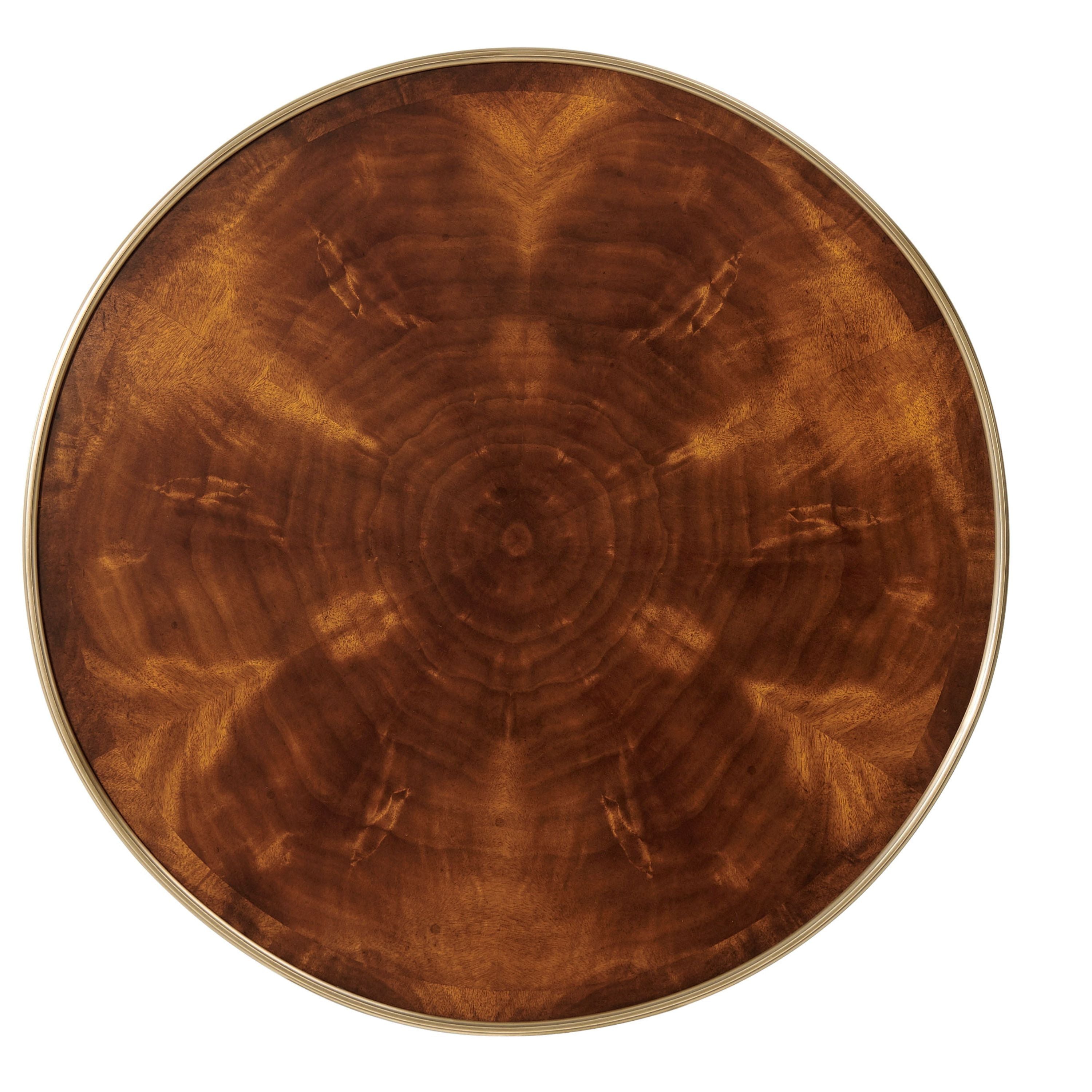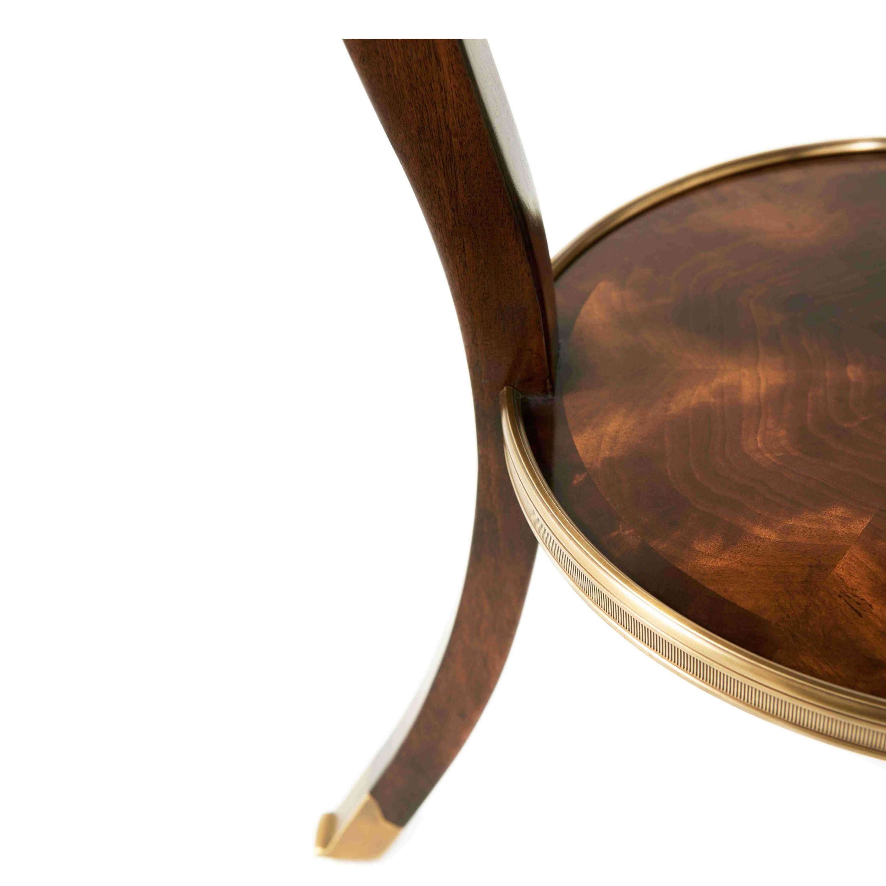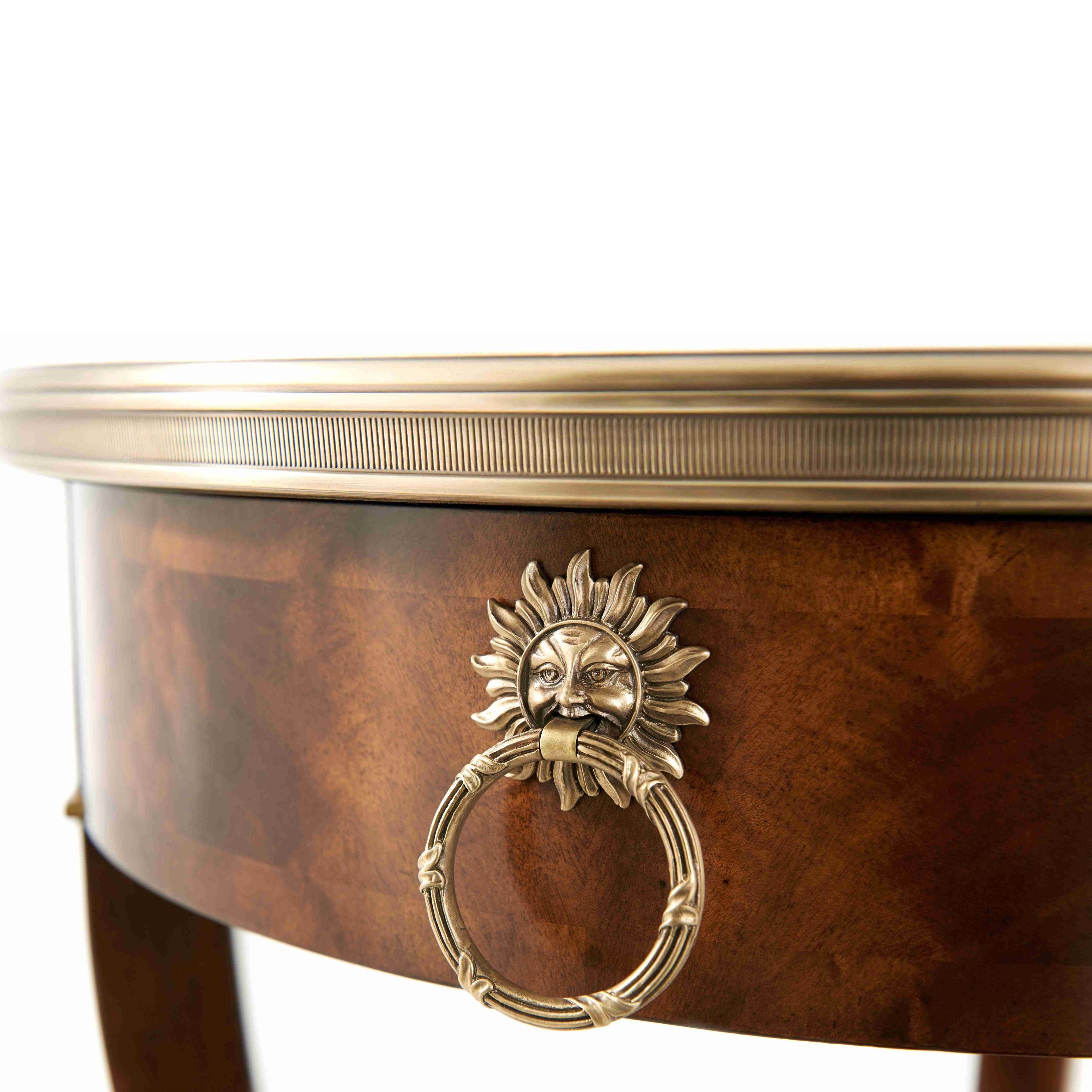 طاولة مصباح مصنوعة من خشب الماهوجني والنحاس، الجزء العلوي الدائري فوق درج إفريز، على أرجل مائلة للداخل مع نعال، متصلة بطبقة سفلية ذات إطار من النحاس.