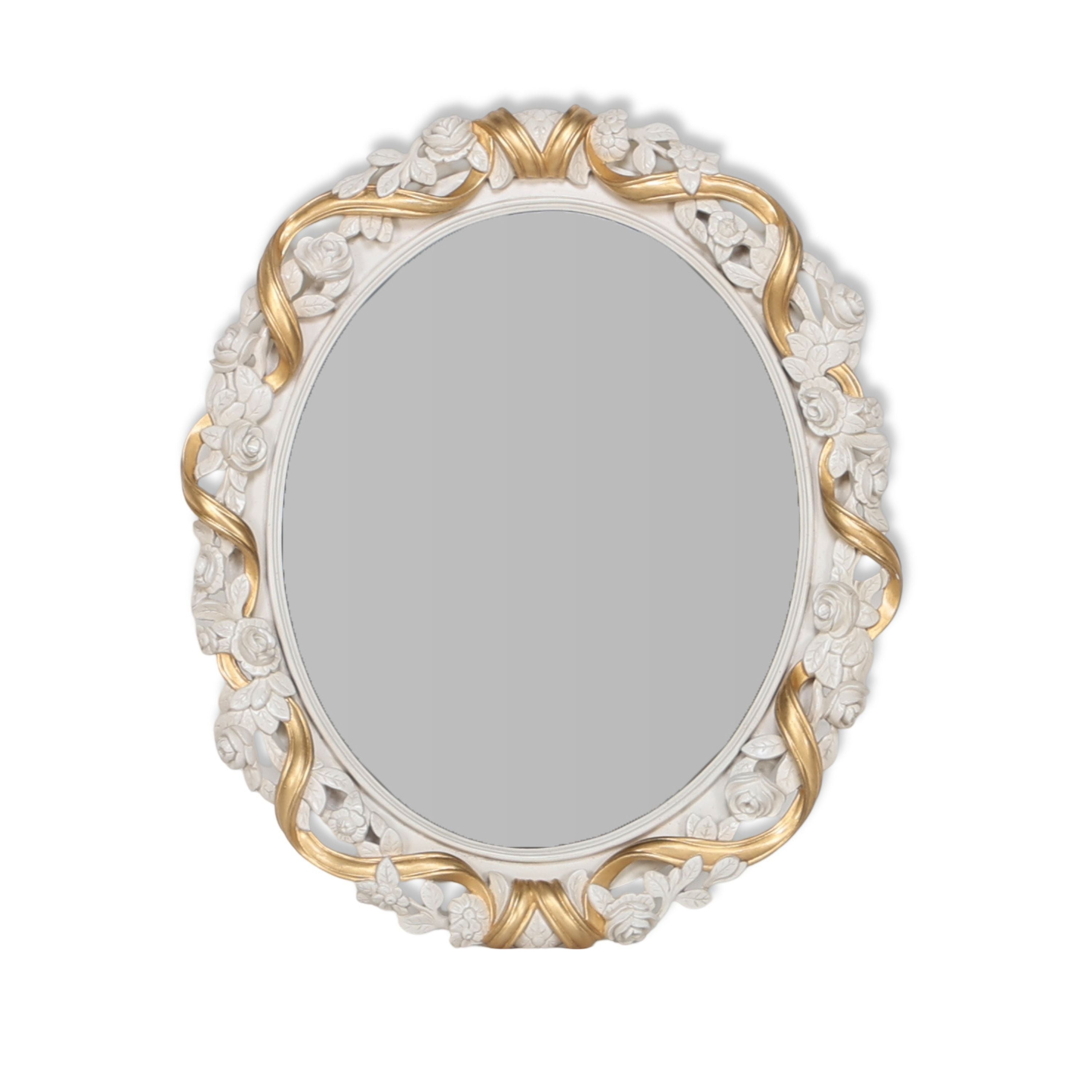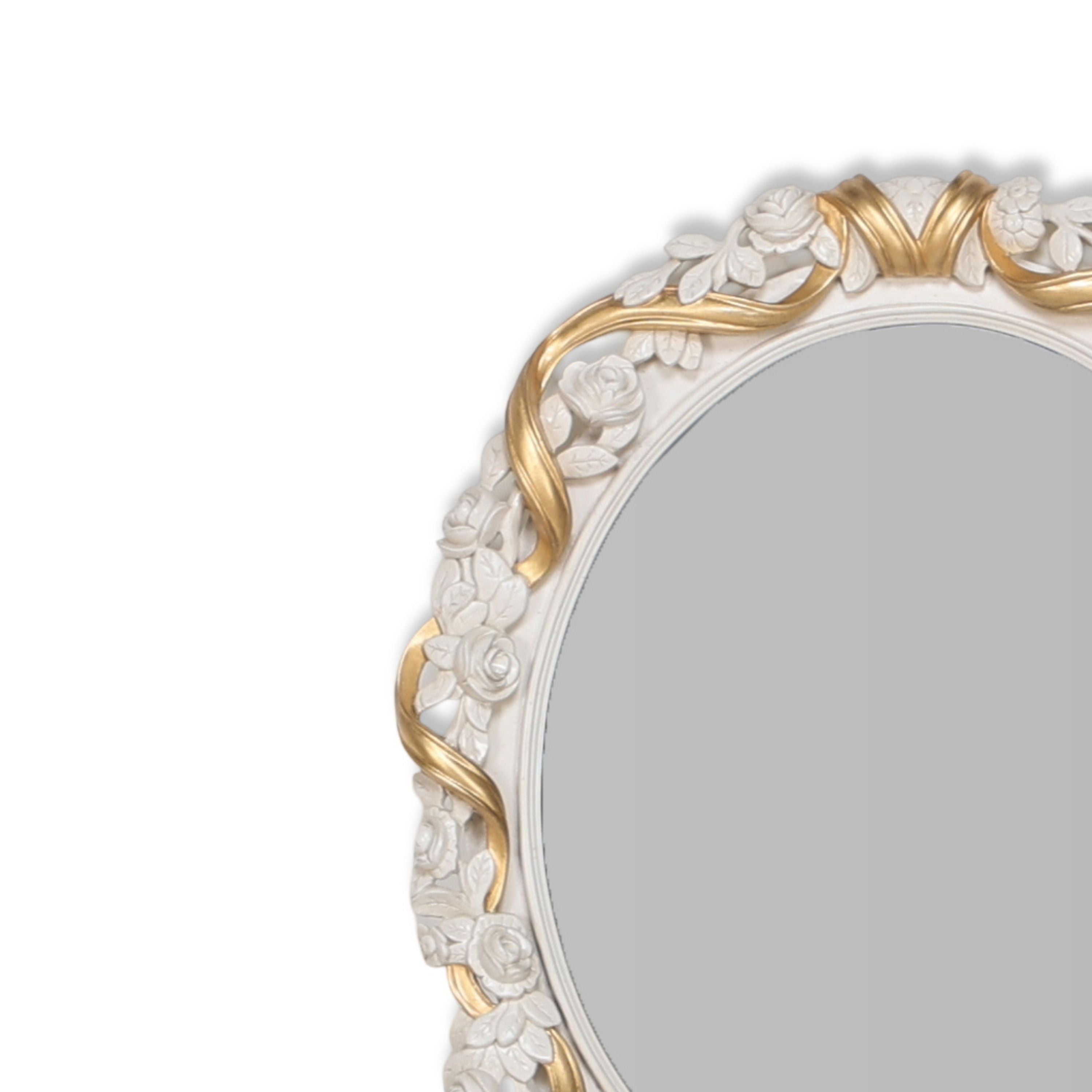 مرآة إليز ريبون بلوم، المصممة بإتقان بشرائط متشابكة وأزهار متفتحة، قطعة رومانسية مميزة. إطارها العاجي مع لمسات ذهبية أنيقة، يعكس شكلها البيضاوي أناقة كلاسيكية بلمسة من الخيال.