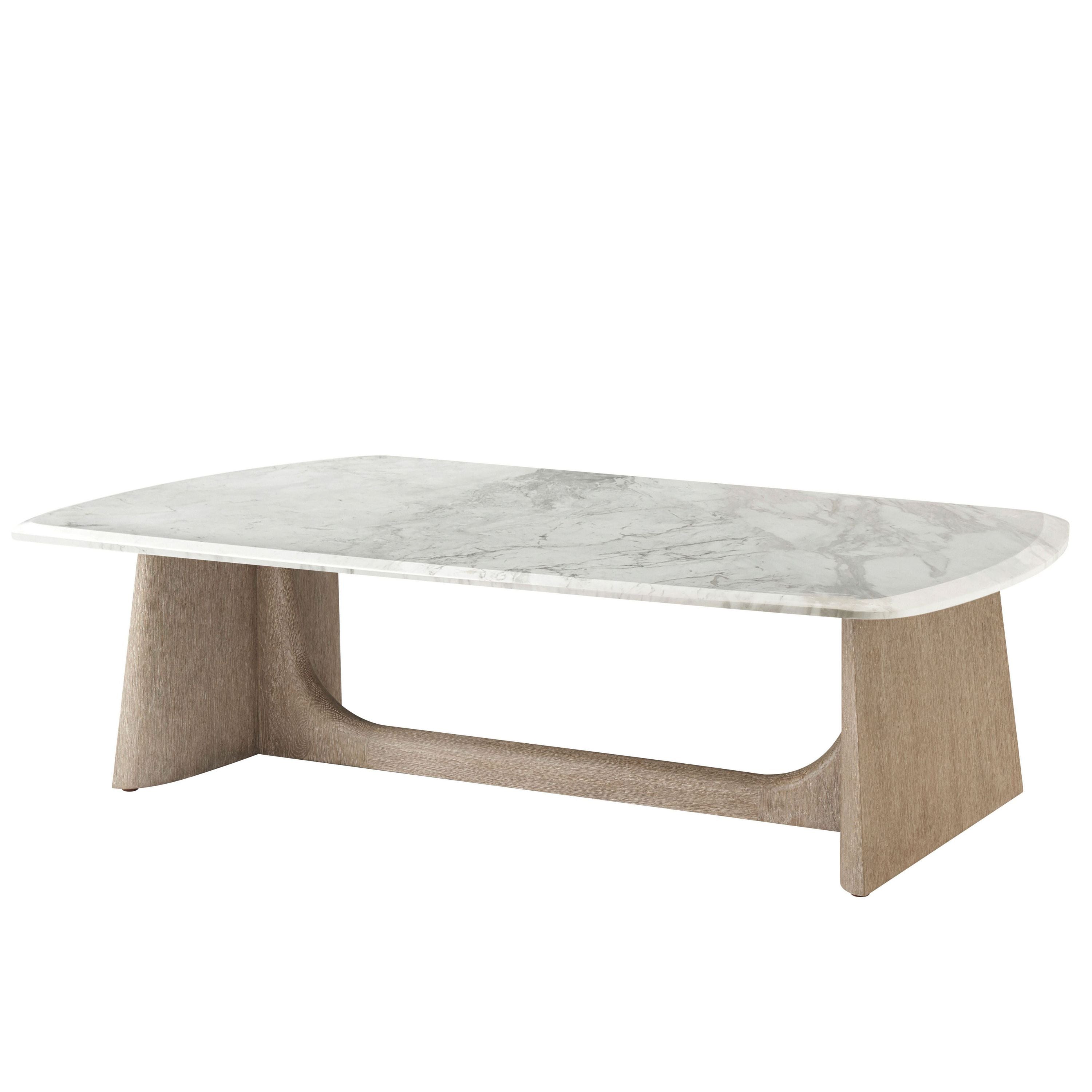طاولة قهوة خشبية من ريبوز، بسطح رخامي، تقف بثبات على أرجل صلبة بتصميم شبه منحرف. تشطيبات قشرة الخشب: البلوط الرمادي والبلوط الفحمي، مصنوعة يدويًا لإبراز خصلات الخشب الطبيعية.