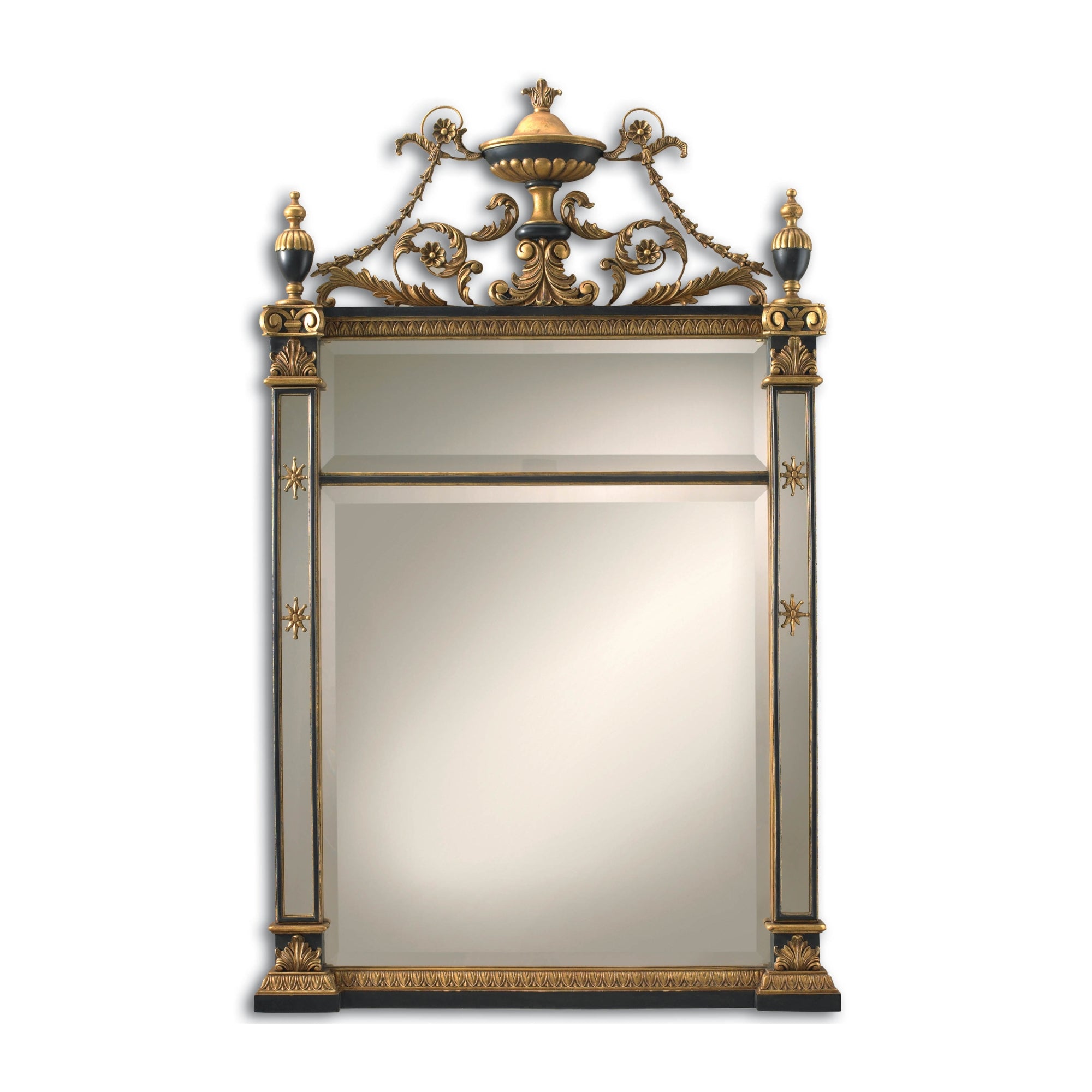 The Canova Mirror embodies refined Empire elegance with its burnished gold and black accents, beautifully framing beveled glass. Delicately detailed with classical motifs and a bold urn crest, this mirror adds timeless grandeur and sophistication to any interior setting. Perfect for a formal entryway, living room, or bedroom, it reflects luxury and heritage with distinctive craftsmanship.